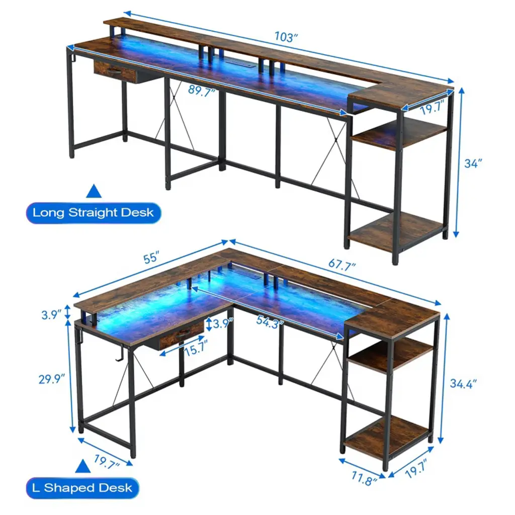 68 Inch Gaming Desk With Power Outlet, Reversible L Shaped Desk With Monitor Stand & Storage Shelves
