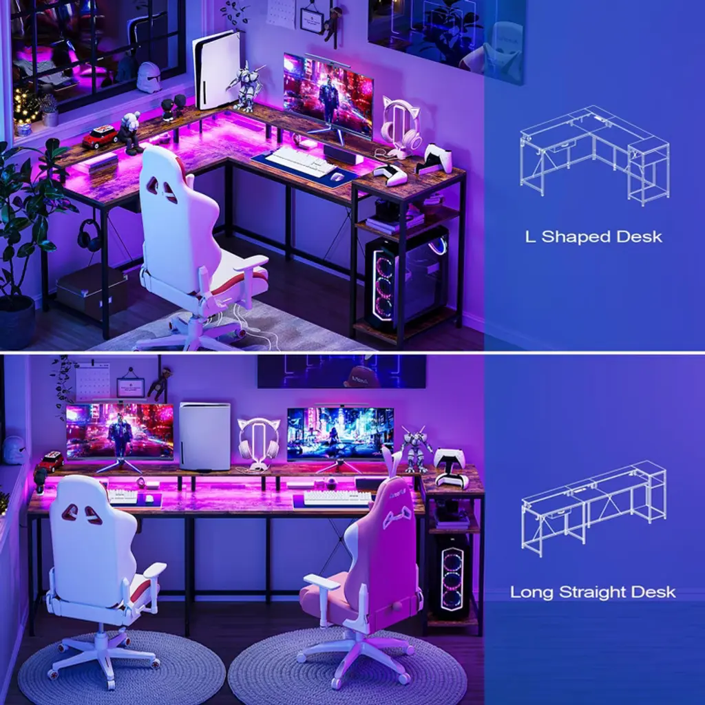 68 inch Gaming Desk with Power Outlet, Reversible L Shaped Desk with Monitor Stand & Storage Shelves, Corner Computer Desk with LED Light Gaming Table Home Office Desk Workstation