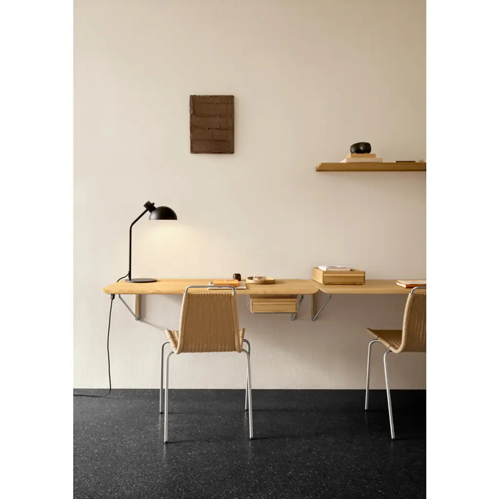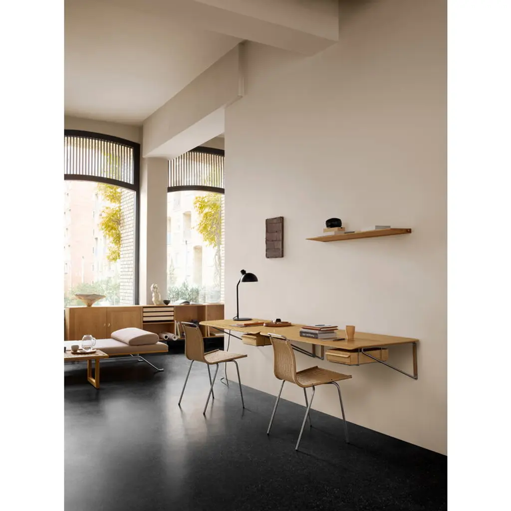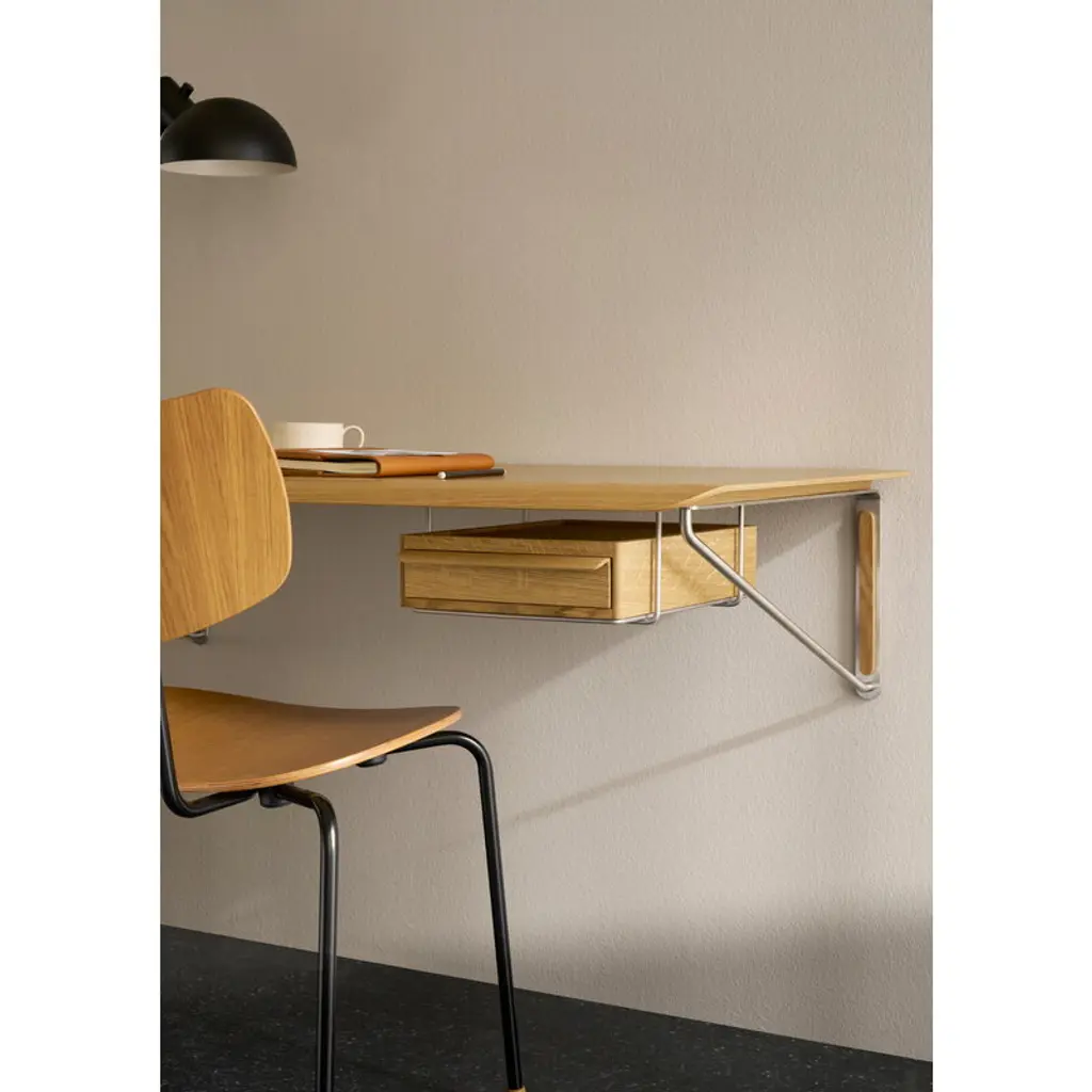 The AB020S wall desk drawer mount by Carl Hansen & Søn is the perfect finishing touch for your AB019 desk. Made of durable stainless steel, the bracket allows you to mount the separately sold AB020D desk drawer neatly beneath the tabletop, instantly adding smart, streamlined storage to your workspace.