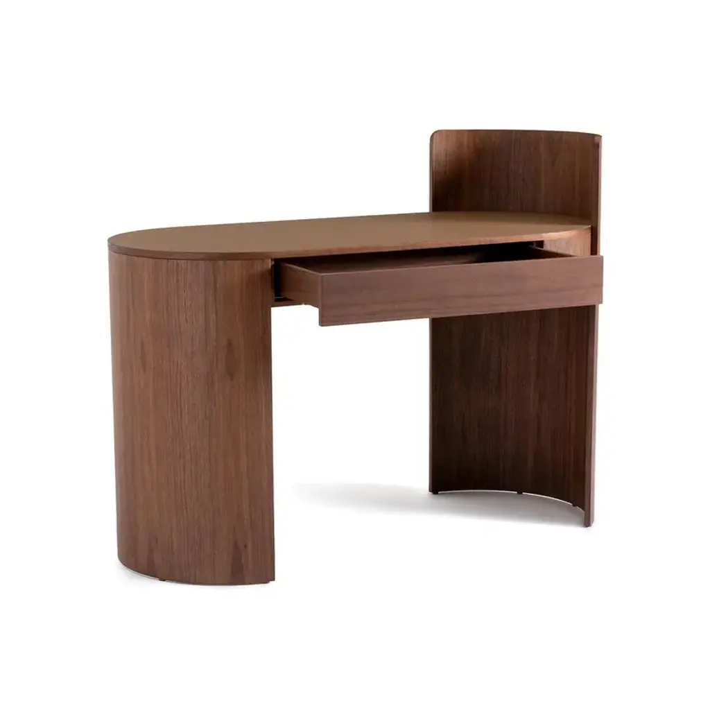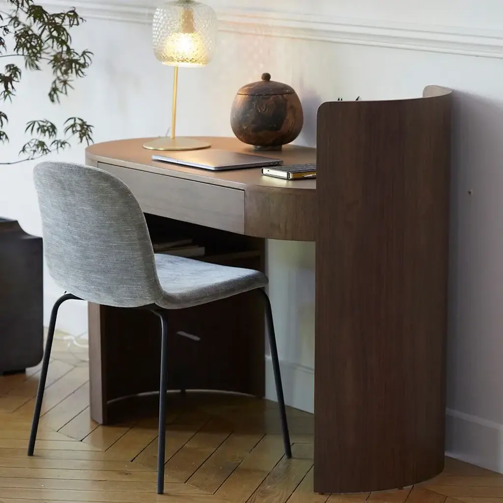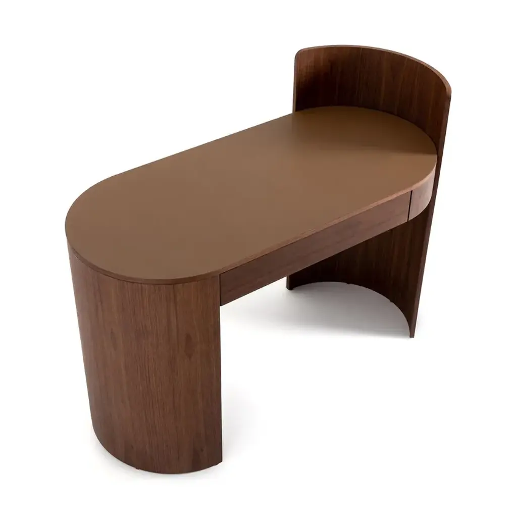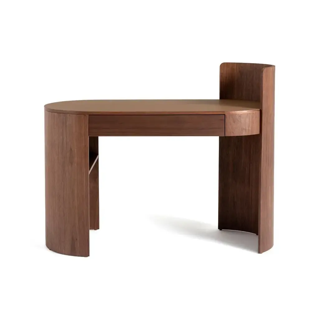 From the start, the Abbas desk stands out as a unique and contemporary piece. The softness of the curves gives free rein to the dialogue of the materials. The FSC walnut structure and the top covered in real leather reflect an idea of responsible aesthetics and functionality. A desk signed AMPM.In plywood and MDF veneered in FSC walnut with nitrocellulose finishDrawer top and bottom covered in genuine Italian leather (full-grain cowhide leather, aniline finish, chrome tanning)1 drawer with soft closing1 fixed shelf behind the base