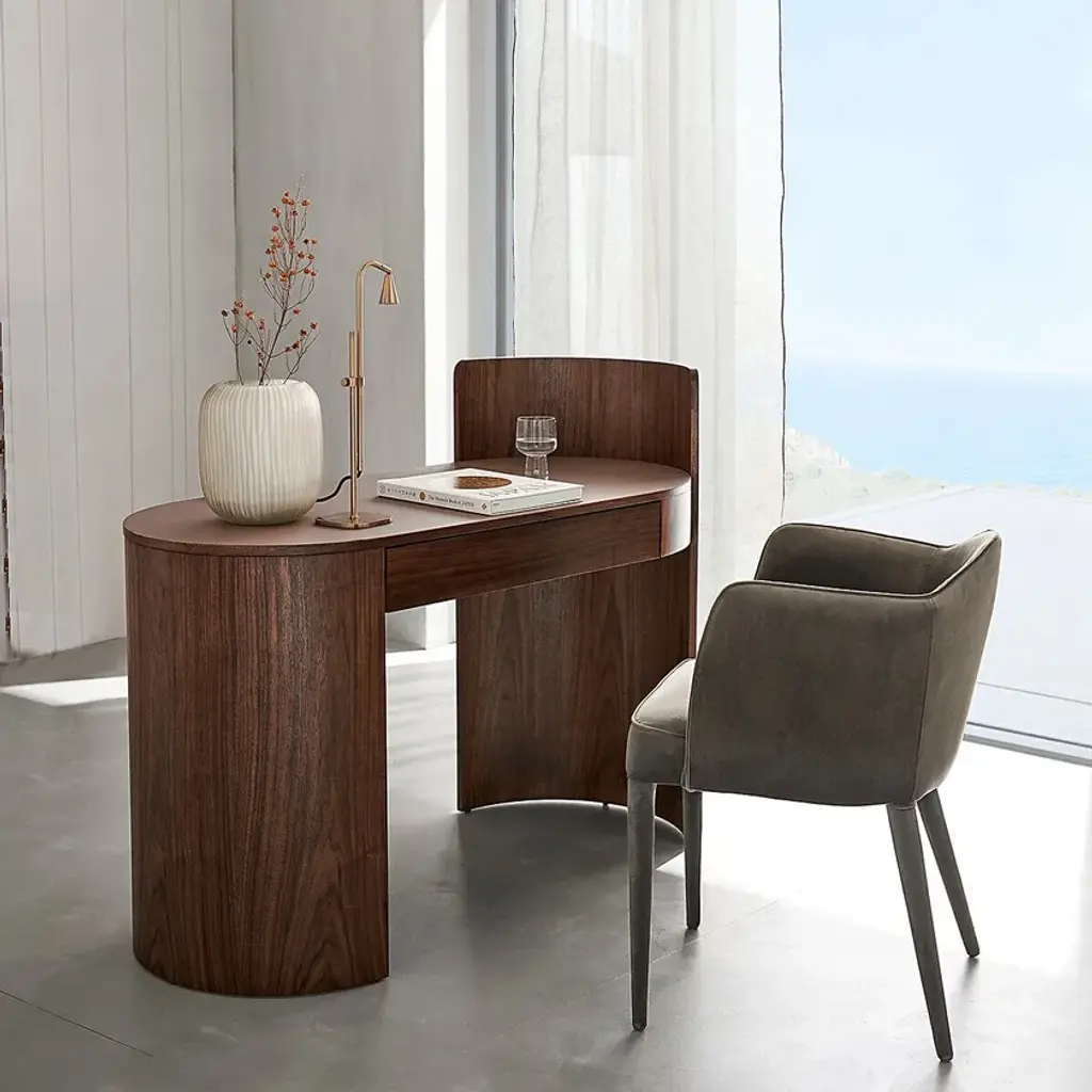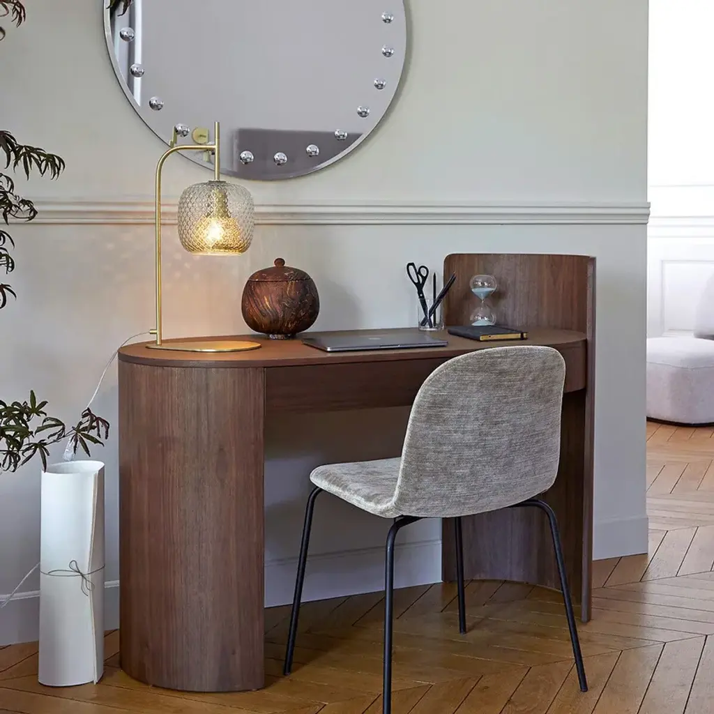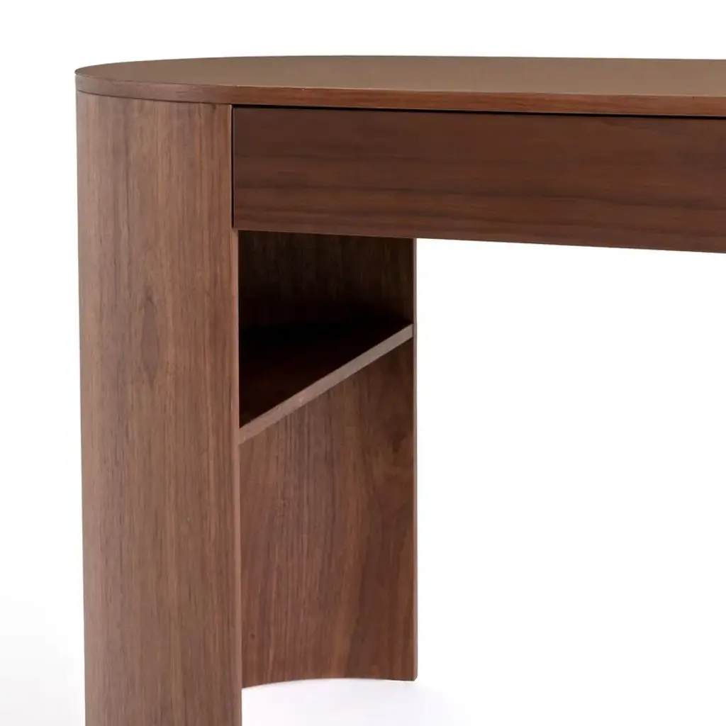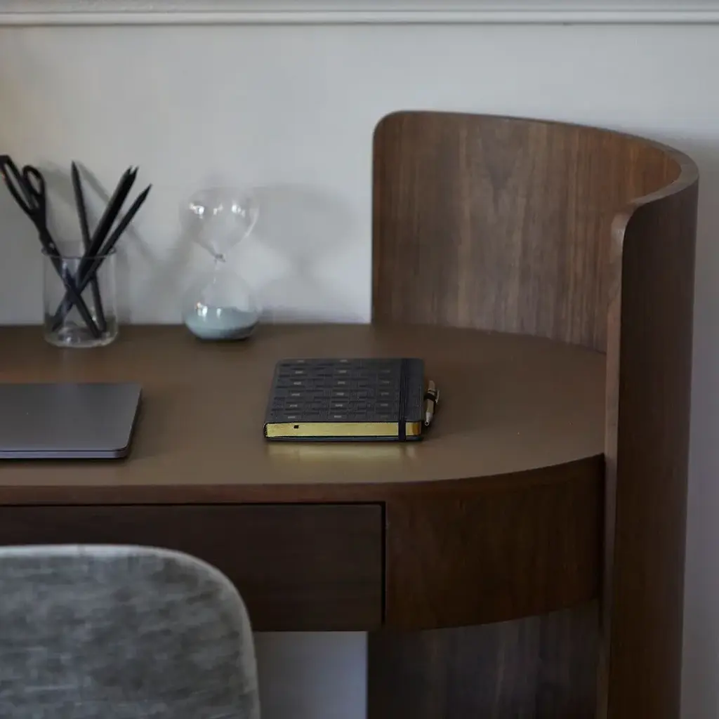 From the start, the Abbas desk stands out as a unique and contemporary piece. The softness of the curves gives free rein to the dialogue of the materials. The FSC walnut structure and the top covered in real leather reflect an idea of responsible aesthetics and functionality. A desk signed AMPM.In plywood and MDF veneered in FSC walnut with nitrocellulose finishDrawer top and bottom covered in genuine Italian leather (full-grain cowhide leather, aniline finish, chrome tanning)1 drawer with soft closing1 fixed shelf behind the base