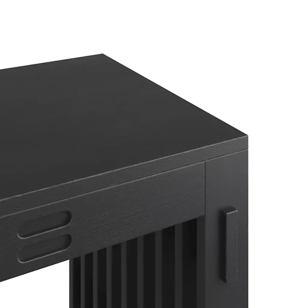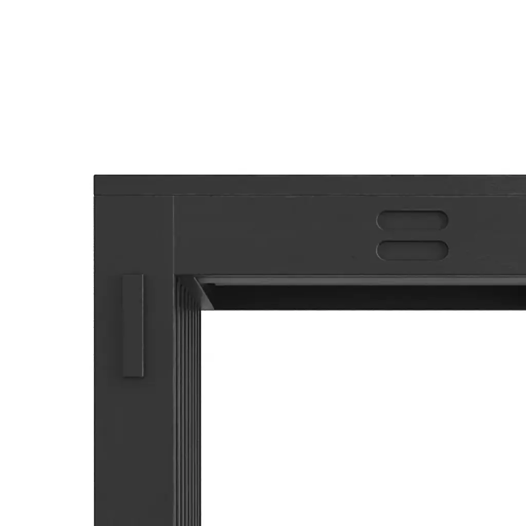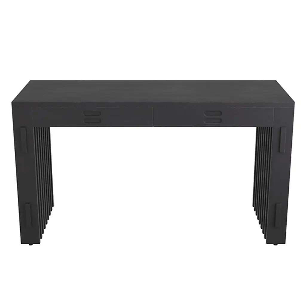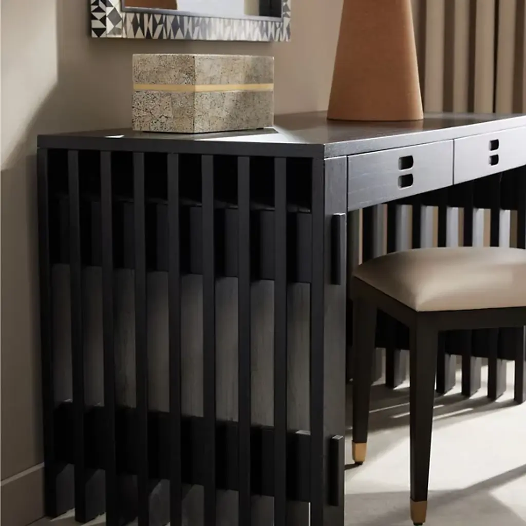 The daring, textured design of the Abraham Desk from Arteriors proves that charming Japanese Minimalism will happen to you and any space you want a light and expressive accompaniment with a solid workspace. Made from cedar veneer, its bracket-style legs are assembled from a series of slightly spaced beams, creating the effect of an open screen and keeping the desk visually light. The sides contrast with the solid desktop and inset drawers, each one with subtly textured grips that provide purchase without breaking the design vision.