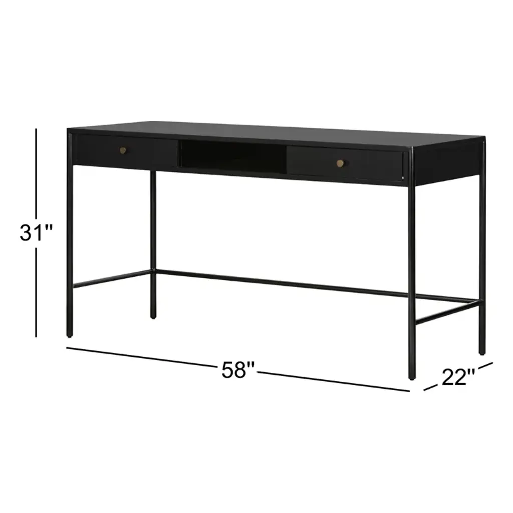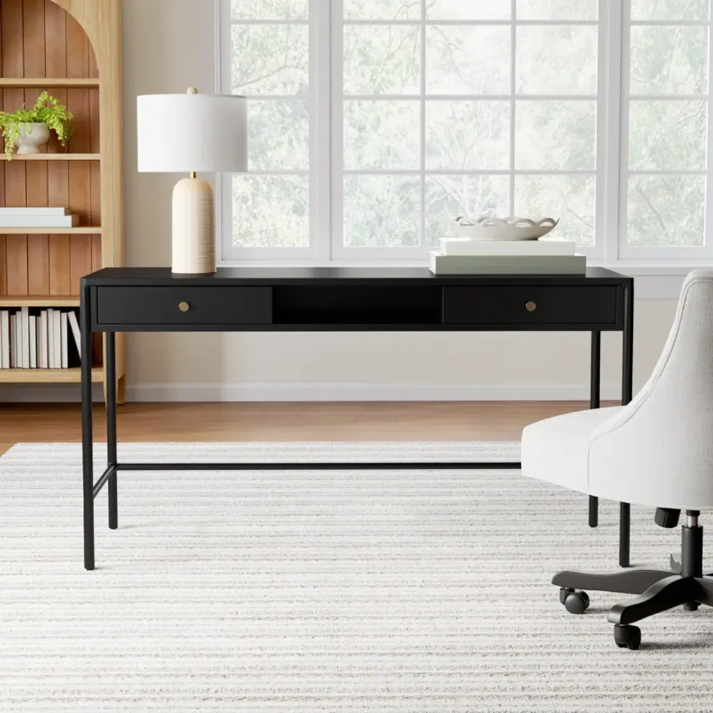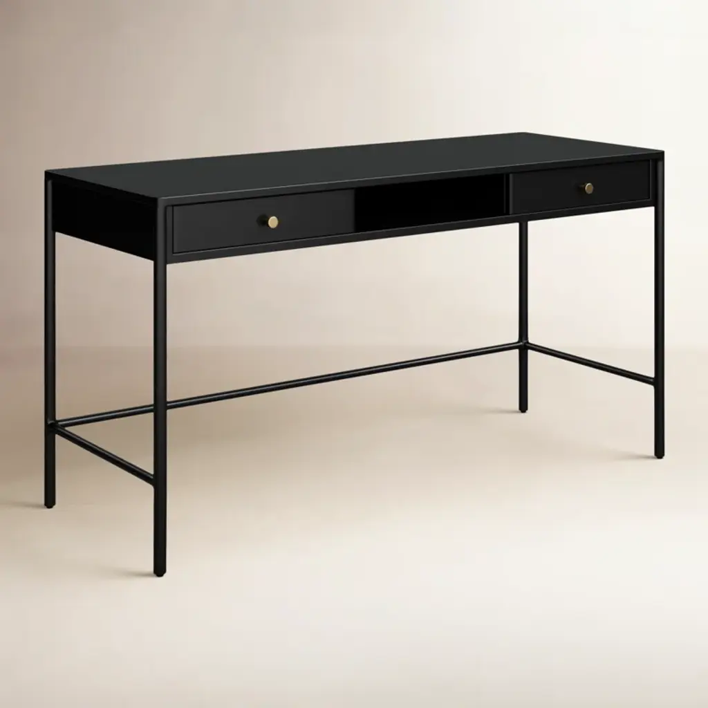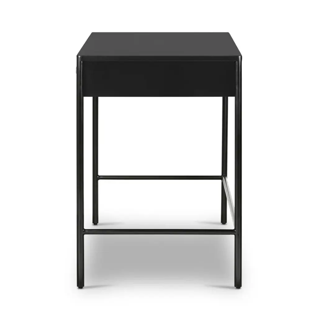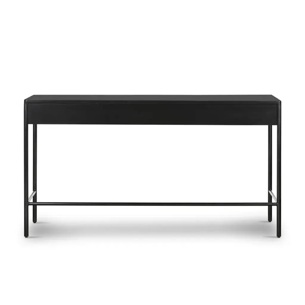 Slim and streamlined, with a touch of industrial edge. Made from black-finished iron with bronze-finished hardware and dual drawers for convenient storage.