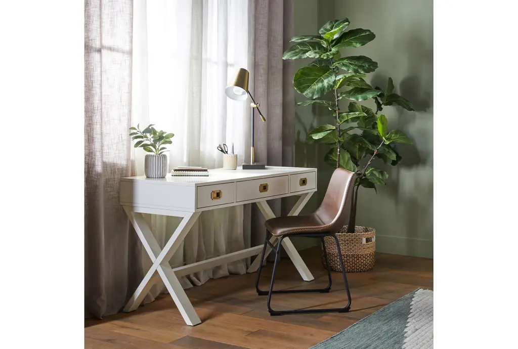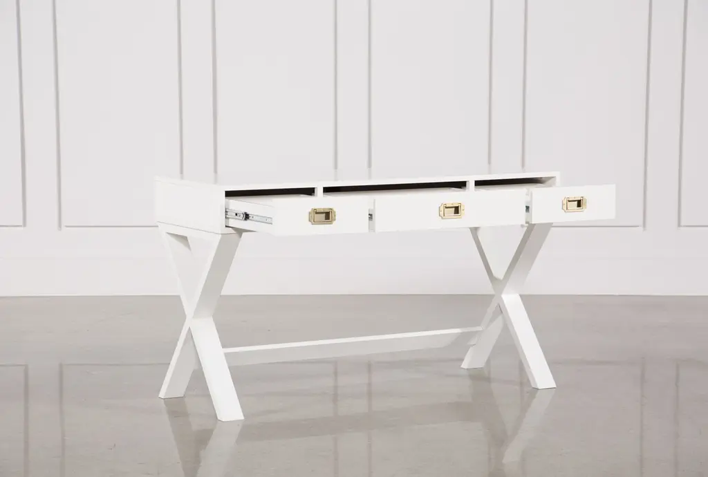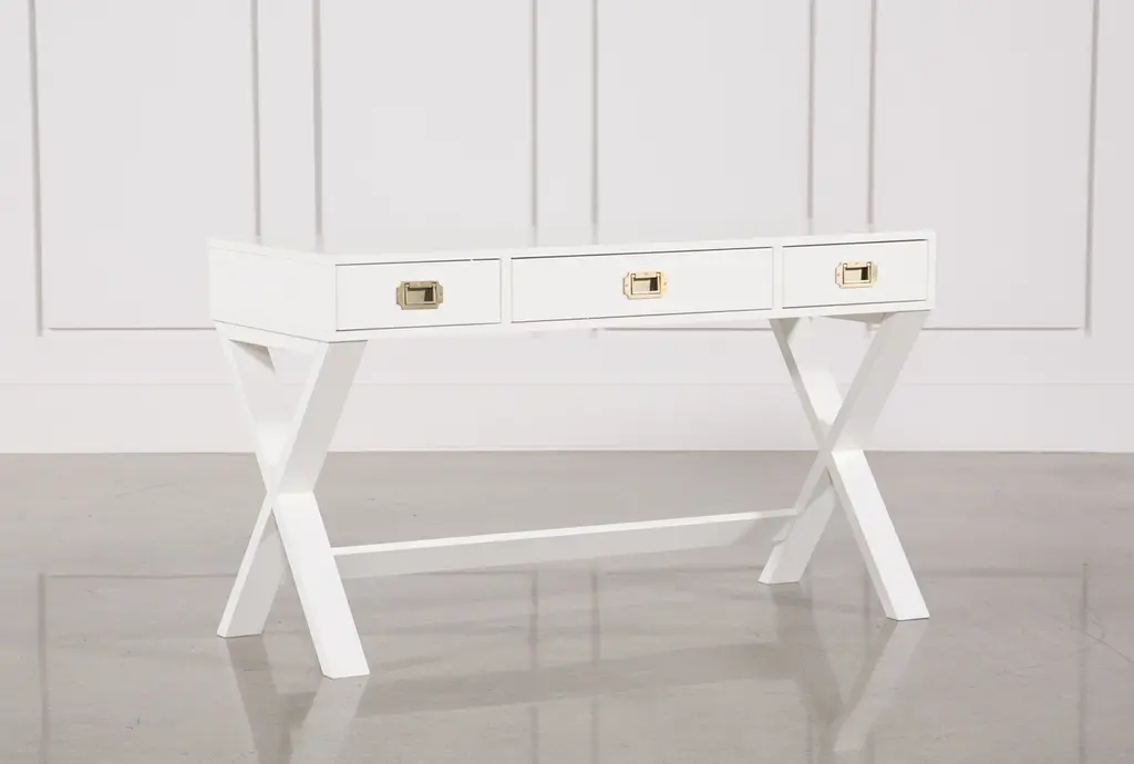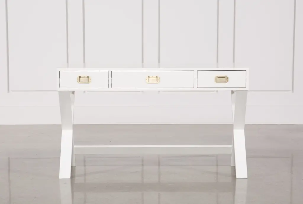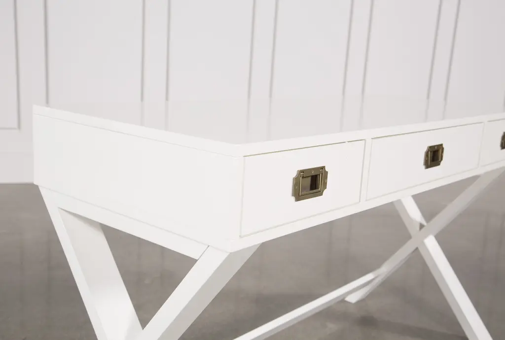 Our Adams White desk is inspired by Campaign-style designs, which were made for military campaign travel. Details like cross legs, a trestle base and recessed metal handles in matte gold are pretty and practical. This item also features solid poplar wood, a high-gloss paint finish and convenient USB ports and power outlets. Perfect for mixing and matching with other bedroom and office furniture, this piece allows you to create a truly custom space.