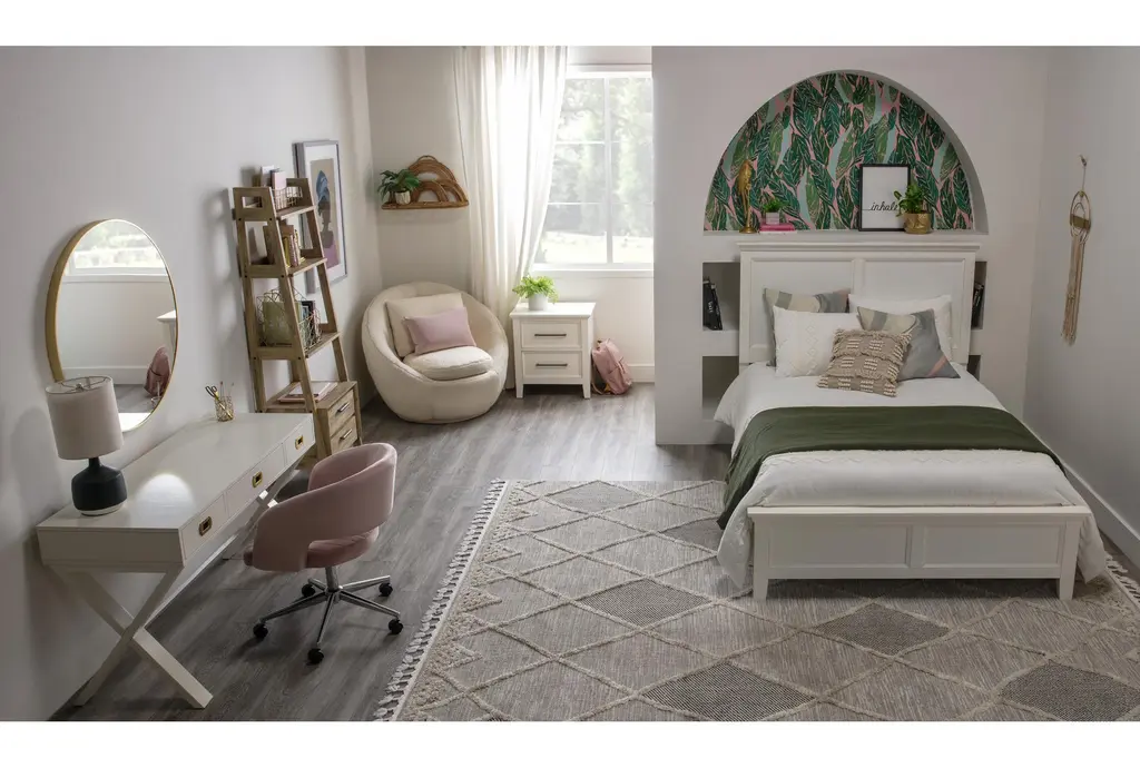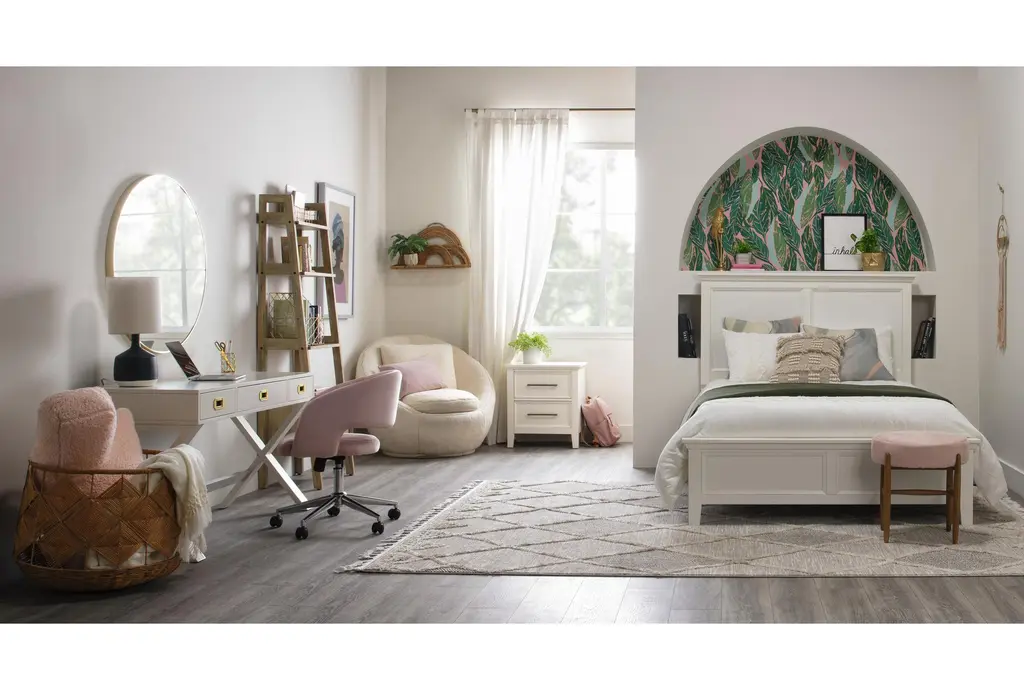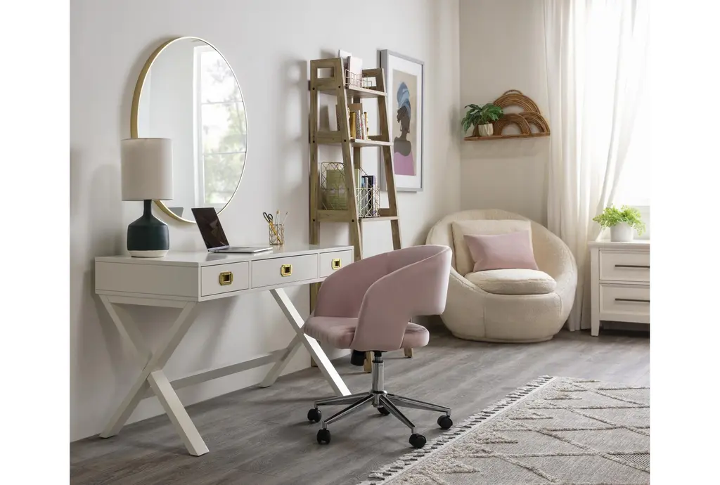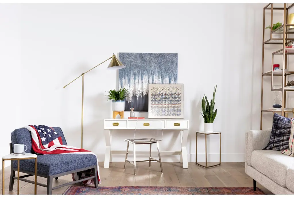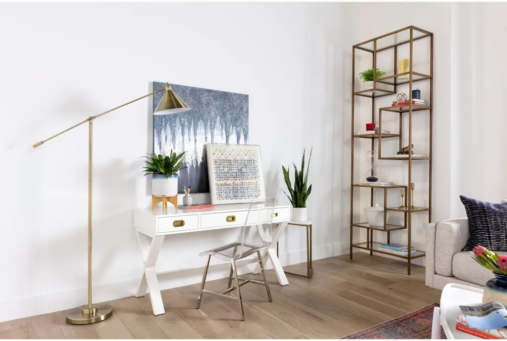 Our Adams White desk is inspired by Campaign-style designs, which were made for military campaign travel. Details like cross legs, a trestle base and recessed metal handles in matte gold are pretty and practical. This item also features solid poplar wood, a high-gloss paint finish and convenient USB ports and power outlets. Perfect for mixing and matching with other bedroom and office furniture, this piece allows you to create a truly custom space.