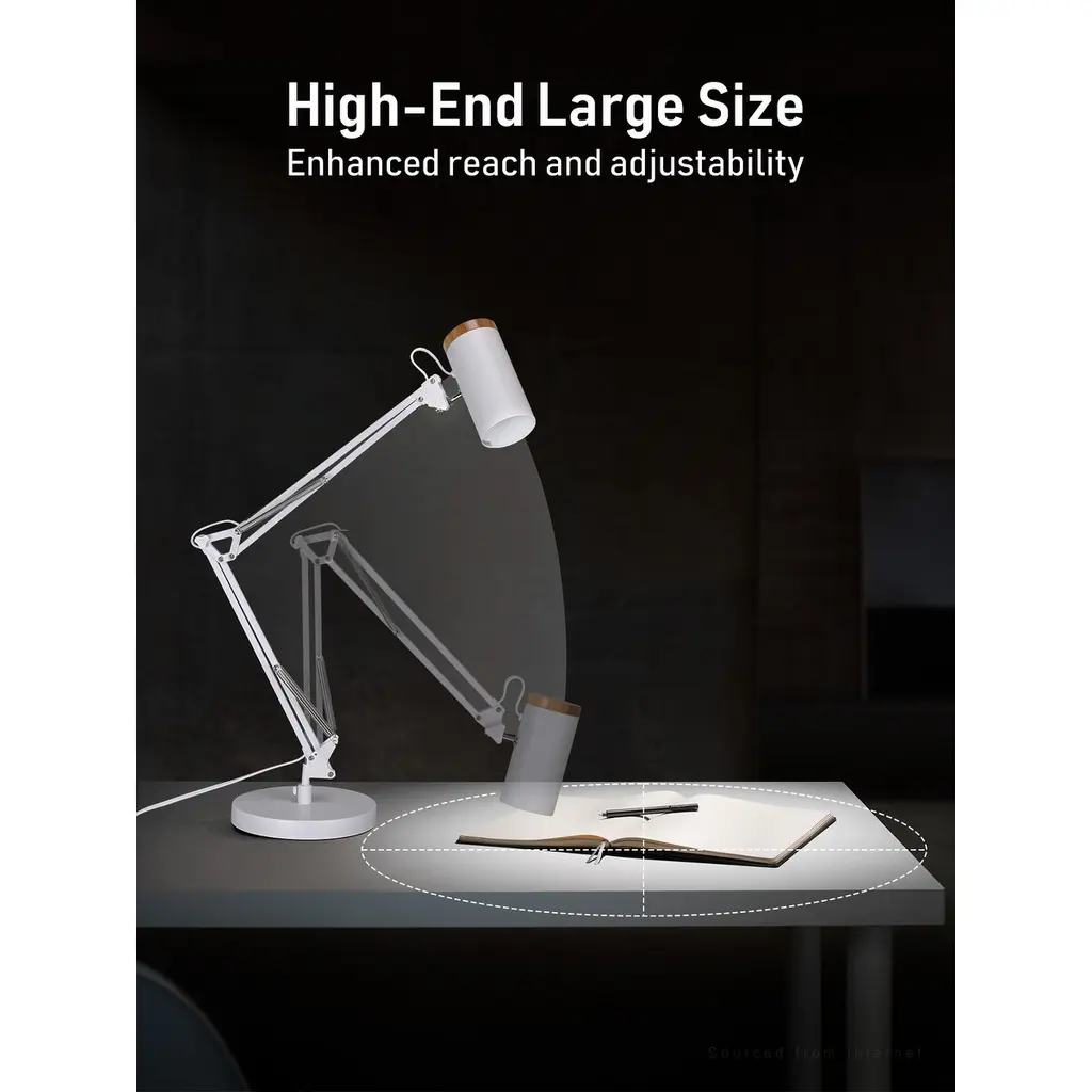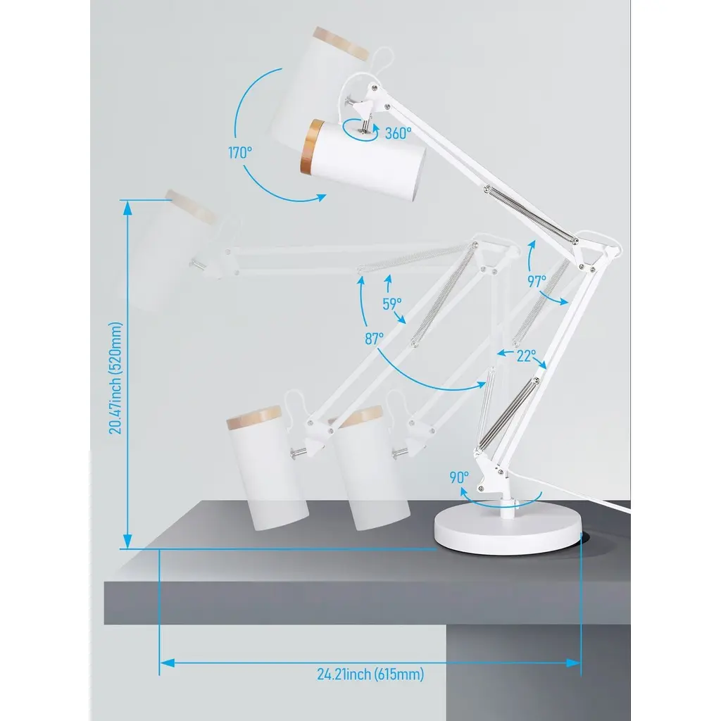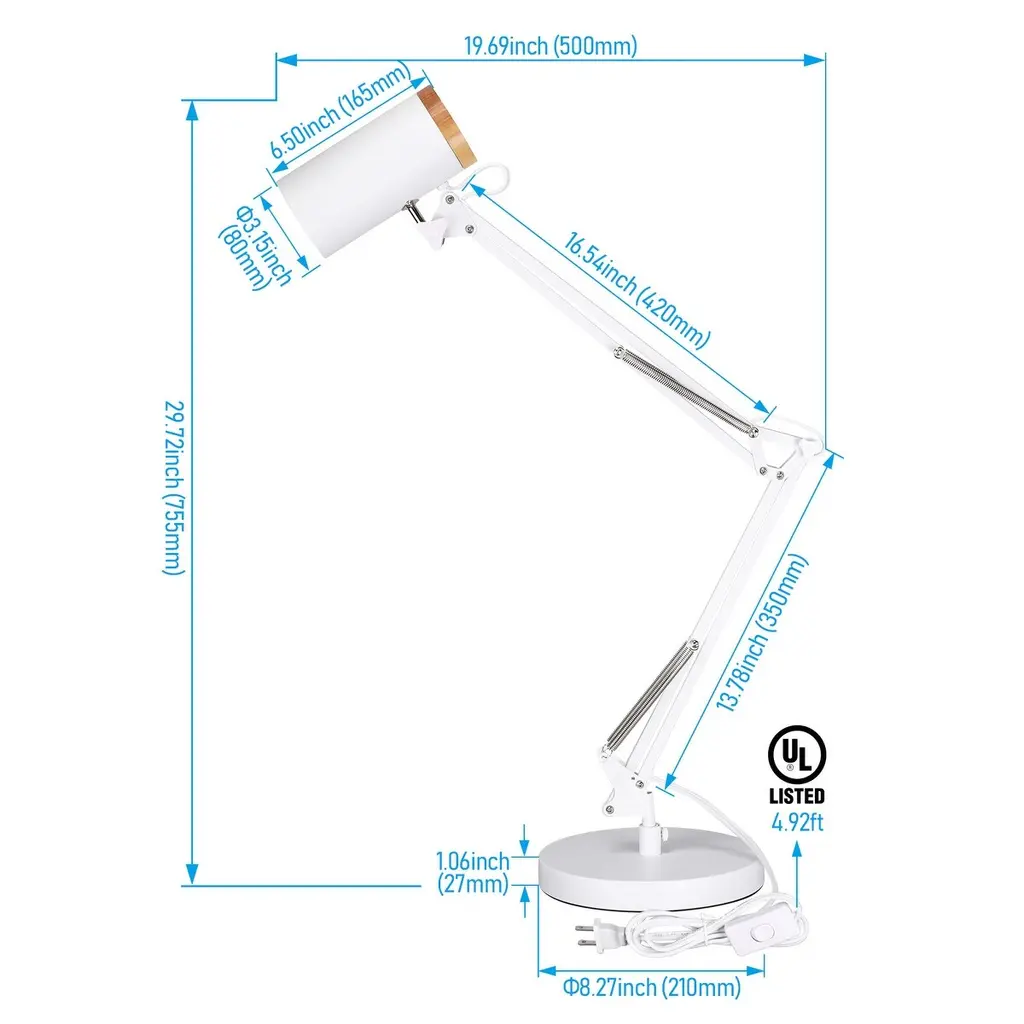 Extra-Long Swing ArmThis desk lamp boasts an exceptionally long arm, reaching up to 29.7 inches in height and 24 inches in length. Ideal for larger workspaces, its versatile range is perfect for various settings such as offices, bedrooms, or living rooms, while also adding a decorative element.Sturdy Weighted BaseDesigned with a heavy-duty base, this table lamp remains stable on any surface, providing reliable support even when repositioned. Its all-metal construction with a matte finish offers a sophisticated appearance, ensuring both style and durability.E26 BaseCompatible with E26 base bulbs up to 25W with a diameter of under 3.15 inches, this desk lamp works best with LED bulbs for extended lifespan. Recommended bulb types include A19, PR20, and BR20. Please note, bulbs are not included.Adjustable Light HeadFeaturing a flexible head that moves 170° side-to-side and 90° up-and-down, this lamp directs light precisely where it's needed. Ideal for work or study, the spotlight effect varies depending on your bulb choice, allowing you to customize the illumination to your needs.Easy UseEquipped with a user-friendly switch, the lamp's cable, switch, and holder are all UL certified. Its contemporary design is enhanced by wood detailing, offering practicality along with a touch of classic elegance in any environment.SpecificationWattage: Max 25W Bulb base: E26Material: Metal