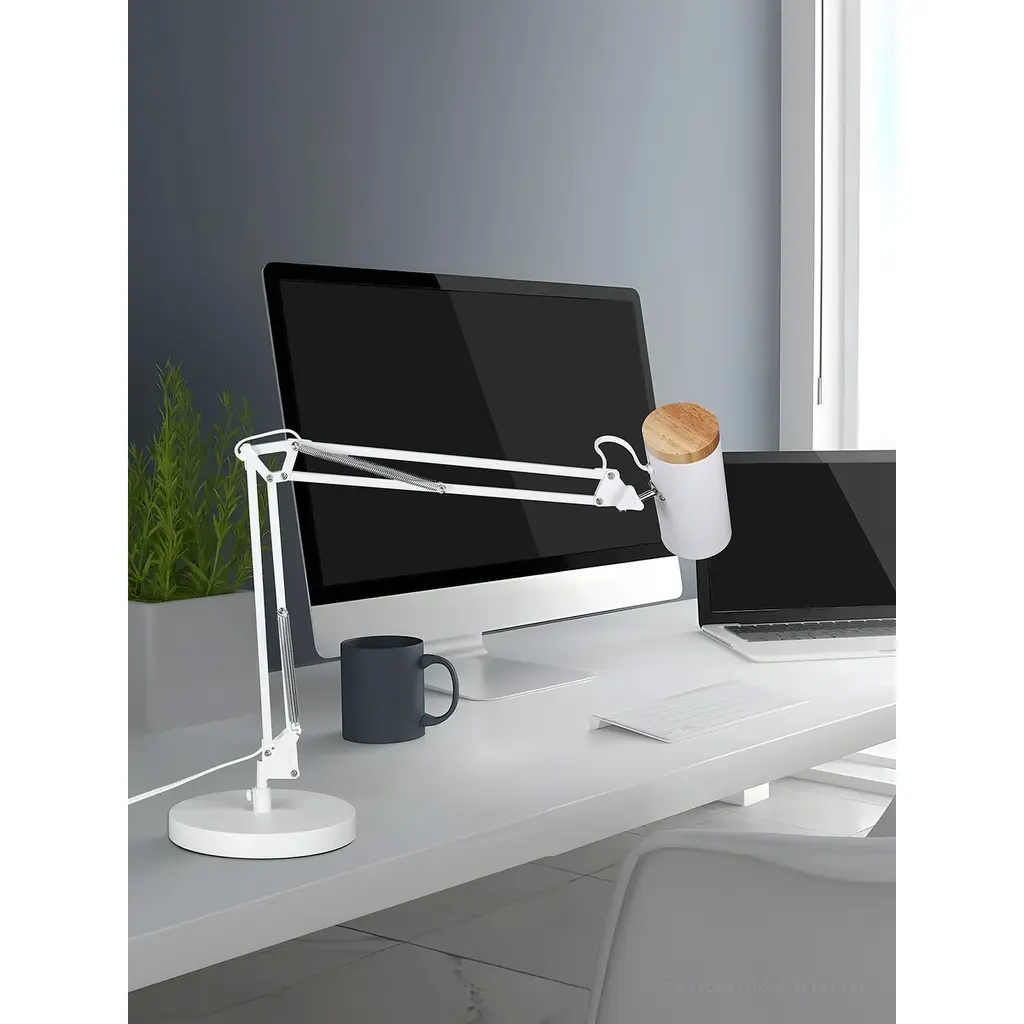 Adjustable Metal Table Lamp, Large Size Max Height 29.7", E26 Base, Swing Arm Desk Light With Wooden Accent - White