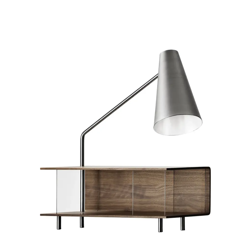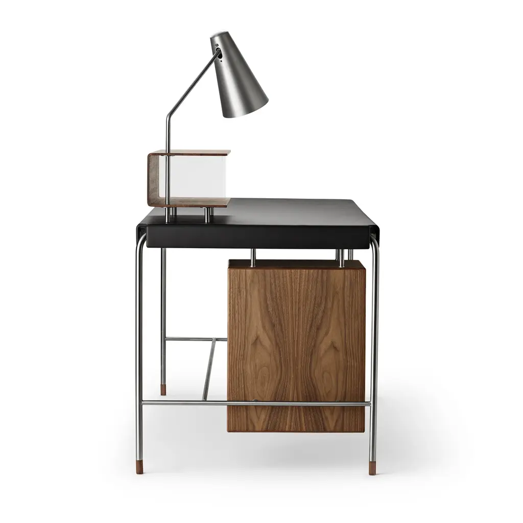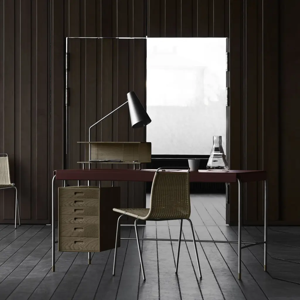 Indulge in the timeless elegance of the AJ52 Society Table Desk from Carl Hansen and Son. This exquisite writing desk features a fine leather top and a suspended six-drawer unit, all contained by a sleek metal frame. With its functionalist design and airy feel, this desk is the perfect combination of form and function. Highlights