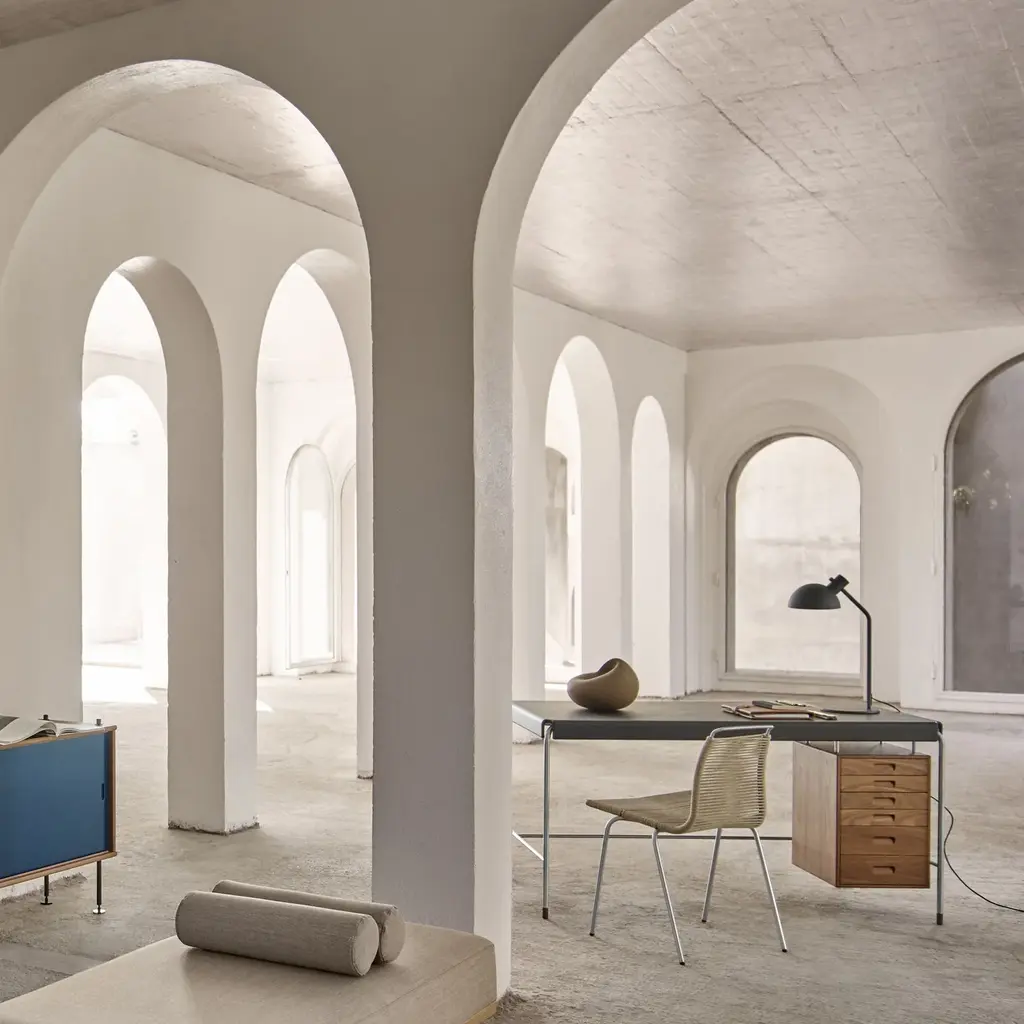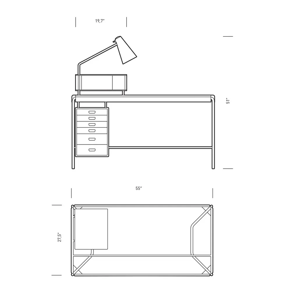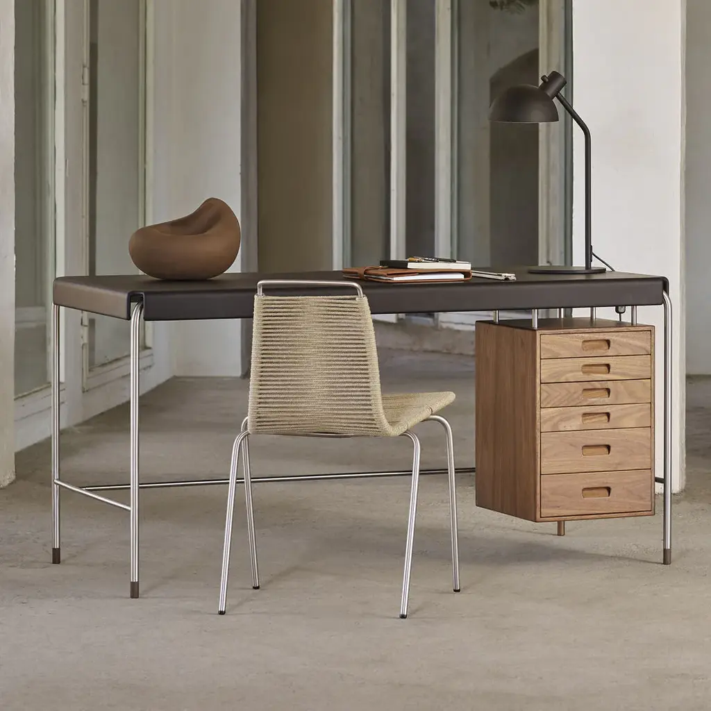 Indulge in the timeless elegance of the AJ52 Society Table Desk from Carl Hansen and Son. This exquisite writing desk features a fine leather top and a suspended six-drawer unit, all contained by a sleek metal frame. With its functionalist design and airy feel, this desk is the perfect combination of form and function. Highlights