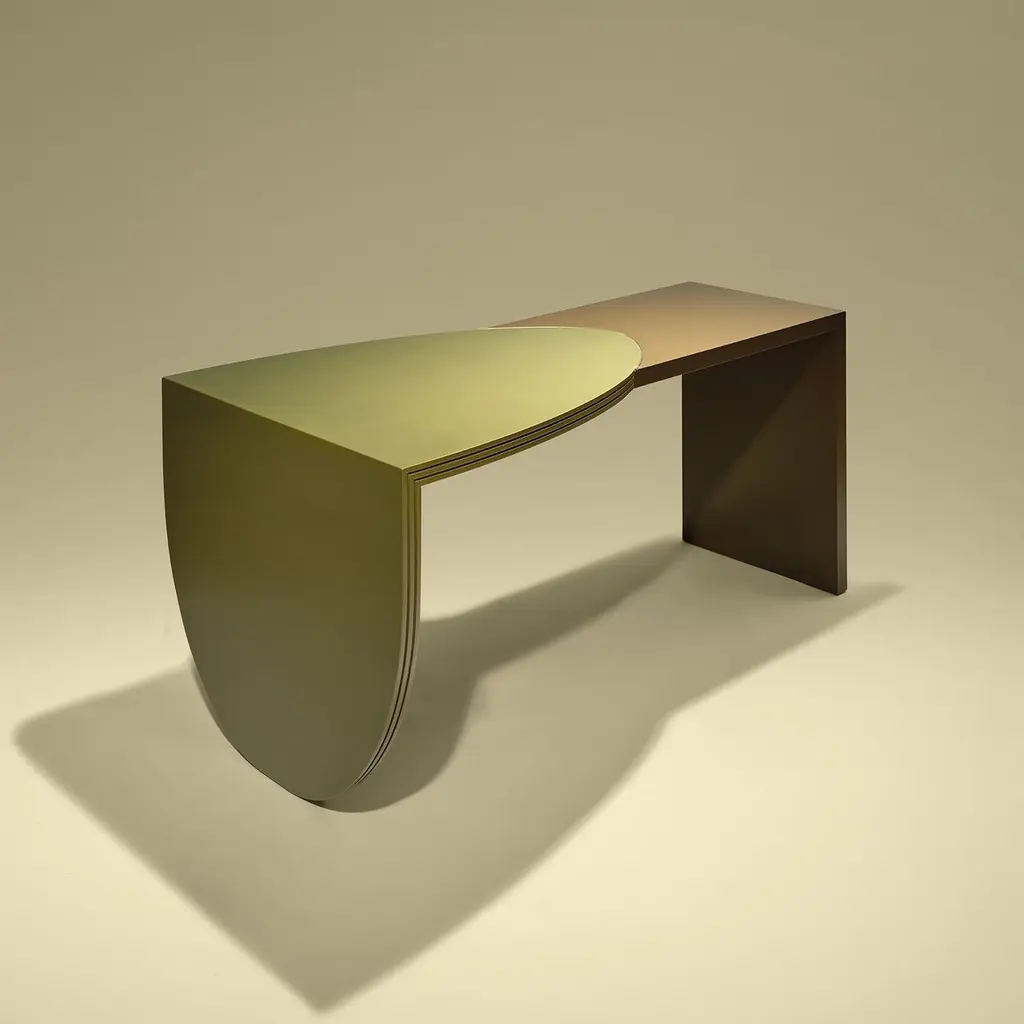 Akoya table desk in green and gold lacquer with bronze trim inlay.Also possible in these dimensions:20 x 59 x 28 in.Bespoke / CustomizableIdentical shapes with different sizes and finishings.All RAL colors available. (Mate / Half Gloss / Gloss)