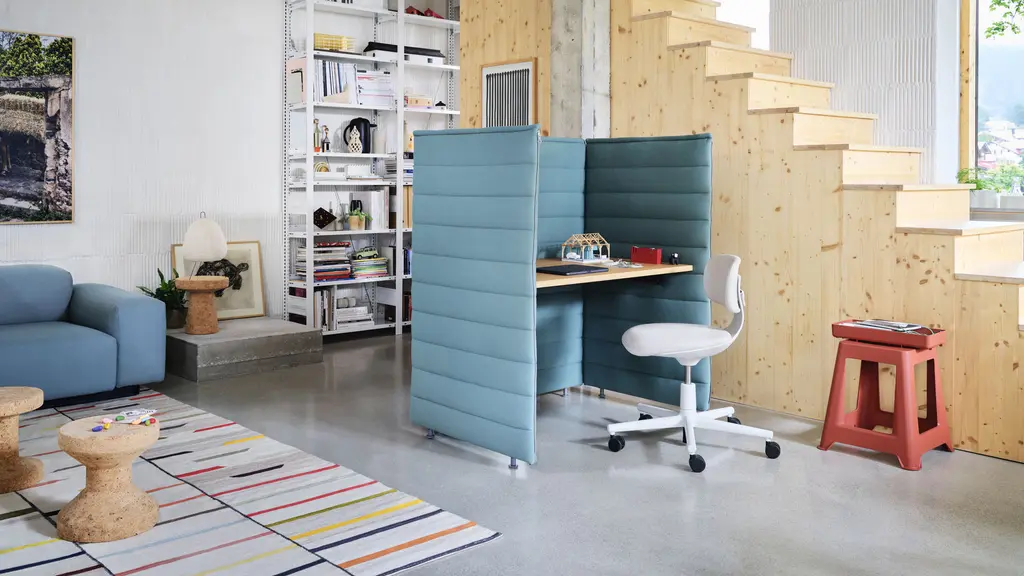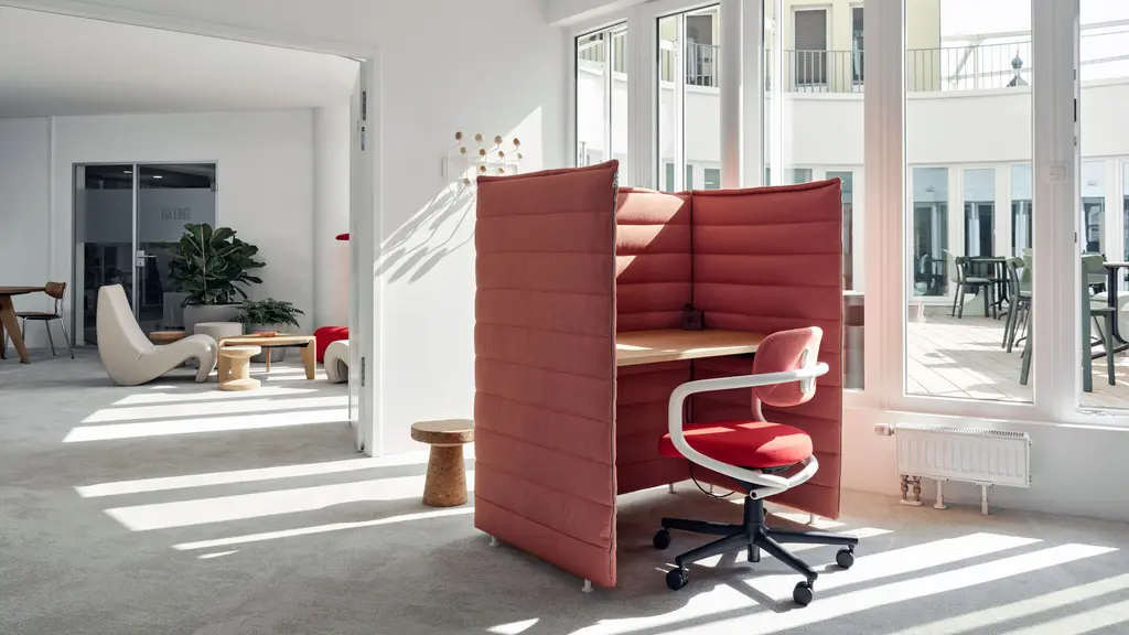 Alcove Plus Desk is a touchdown workstation that shields users both visually and acoustically, making it ideally suited for focussed tasks. Alcove Plus Desk comes in three sizes and can be fitted with portable partition screens, which are attached to the side panels with zip fasteners. These offer added privacy but can also be used to establish traffic patterns within the office, create additional niches or form larger structures.