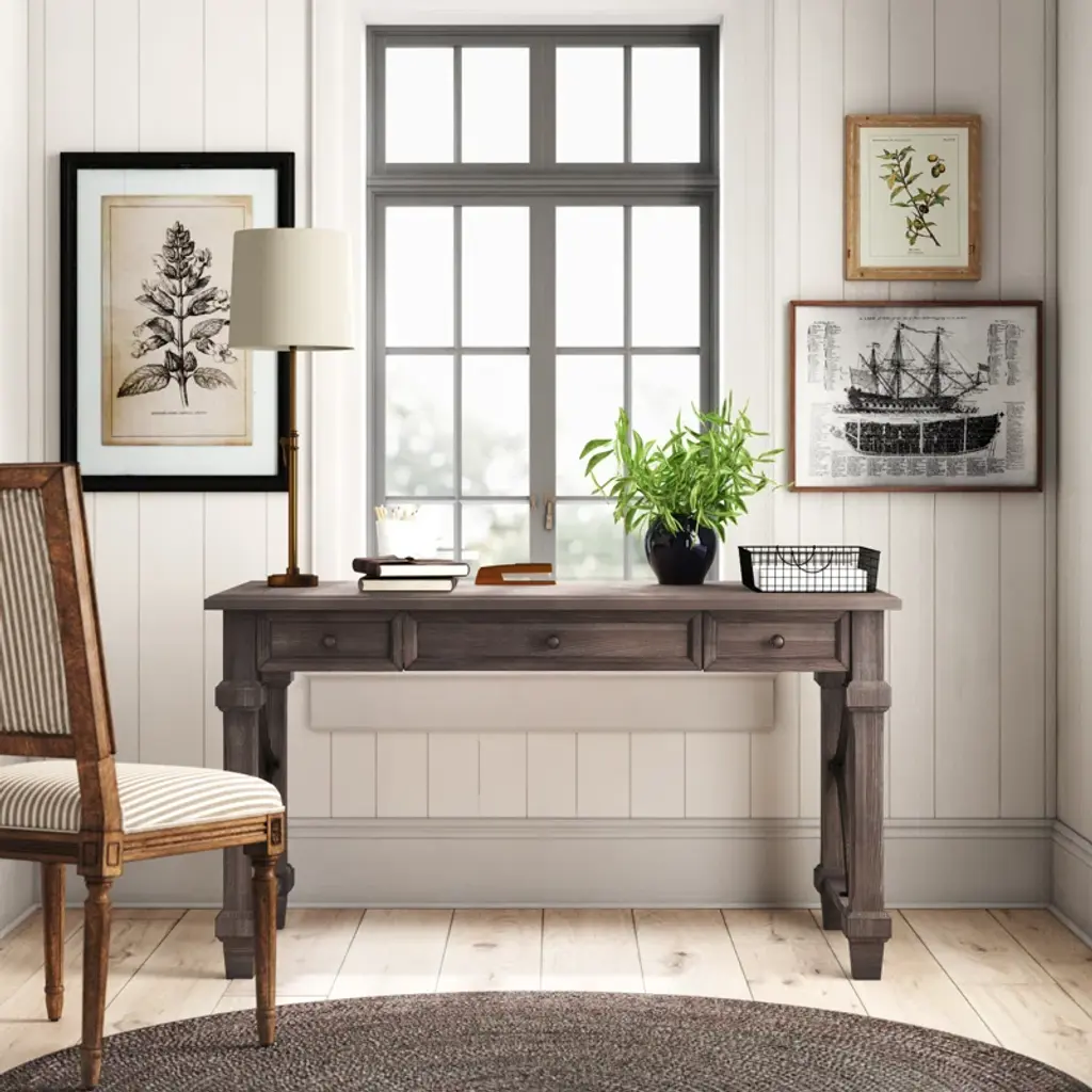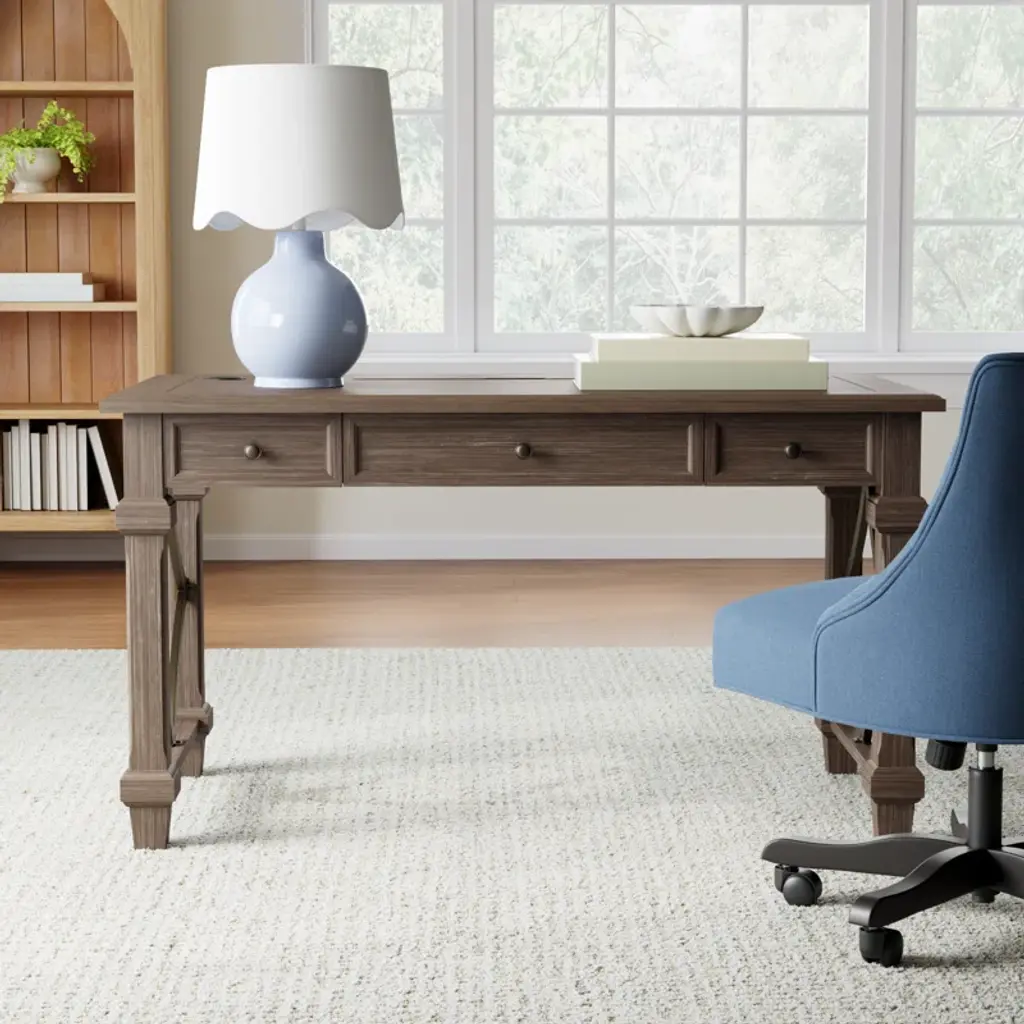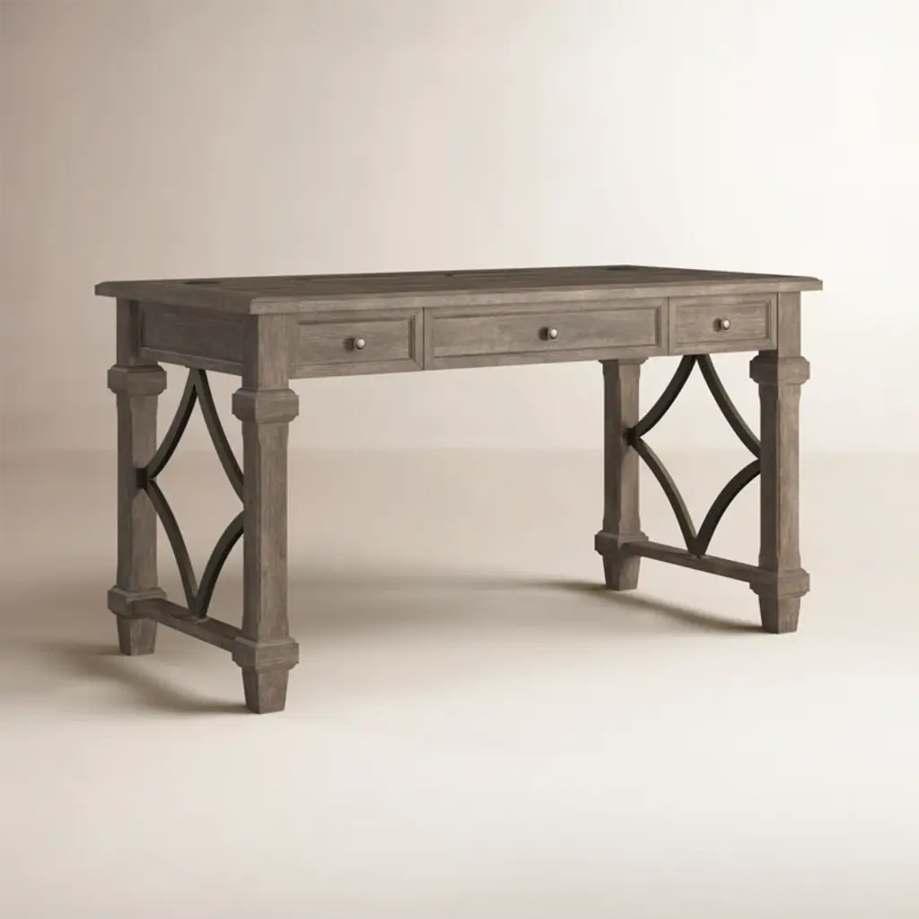 This rustic solid wood writing desk feels right at home in an executive office or a tucked-away nook in your farmhouse living room. We love how its weathered dove finish accentuates the natural open grain, and the openwork sides form an artful diamond pattern. Two drawers (one on each side) offer out-of-sight storage for pens and small notepads, while a keyboard tray frees up valuable desktop space (we all eat a snack or two while we work the night away). Something else to love: This desk comes with a five-year warranty for added peace of mind.