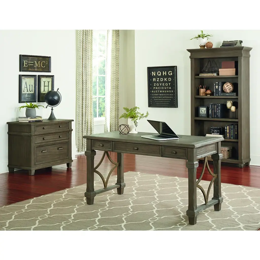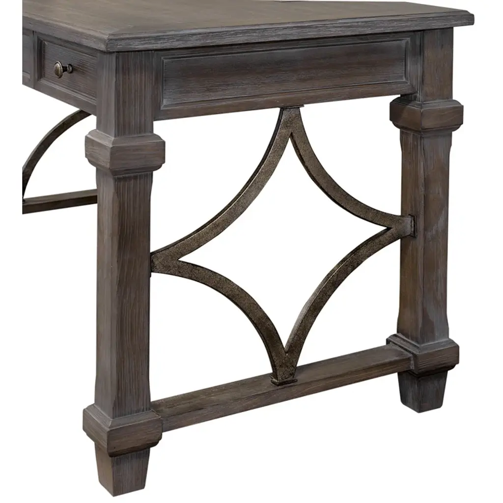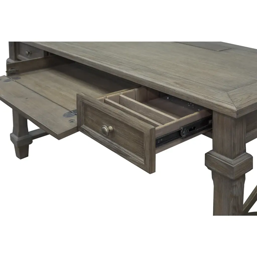 This rustic solid wood writing desk feels right at home in an executive office or a tucked-away nook in your farmhouse living room. We love how its weathered dove finish accentuates the natural open grain, and the openwork sides form an artful diamond pattern. Two drawers (one on each side) offer out-of-sight storage for pens and small notepads, while a keyboard tray frees up valuable desktop space (we all eat a snack or two while we work the night away). Something else to love: This desk comes with a five-year warranty for added peace of mind.