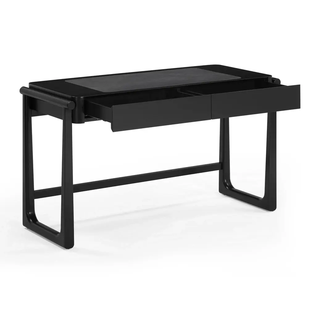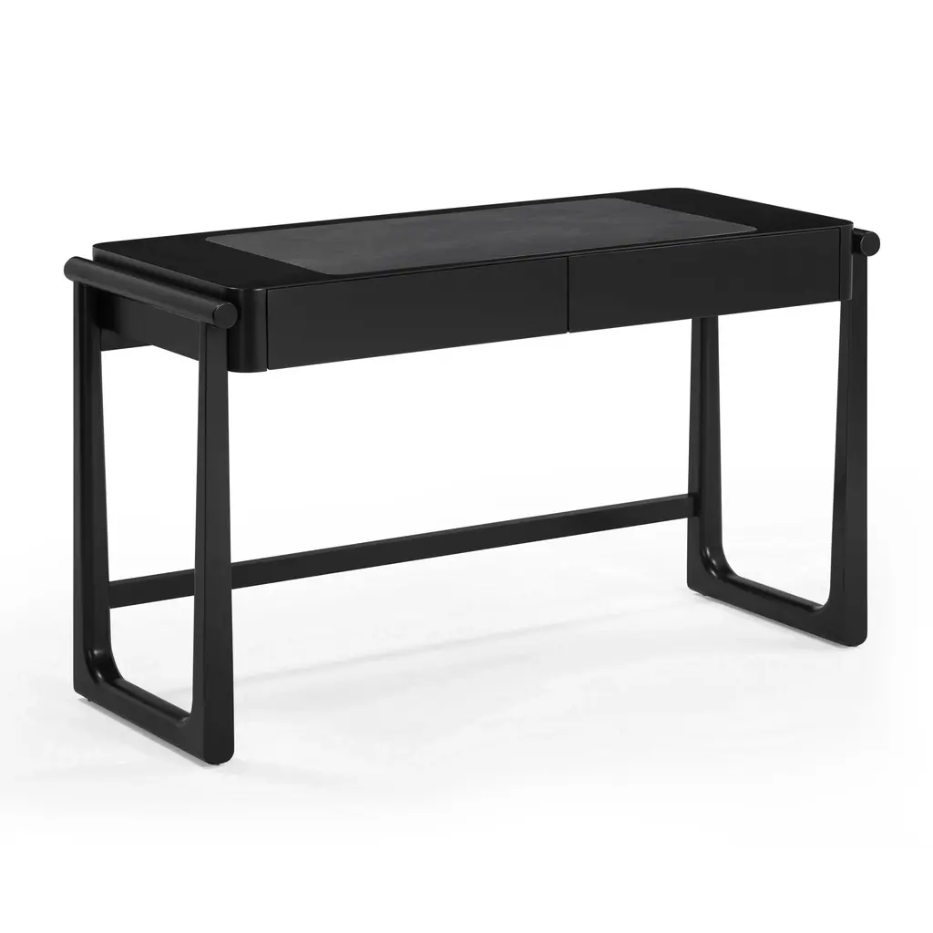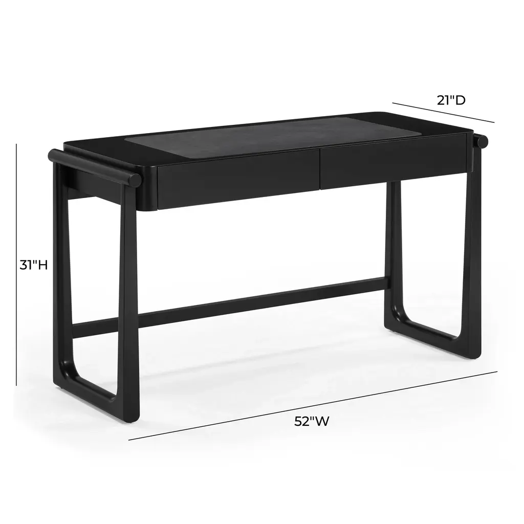 The Alfalfa Desk brings chic utility with two smooth-glide drawers and a padded work surface wrapped in ultra-cleanable, yacht-grade vegan leather—pen marks and heavy typing, no problem. A glossy lacquer finish adds a sleek touch, available in taupe or black.