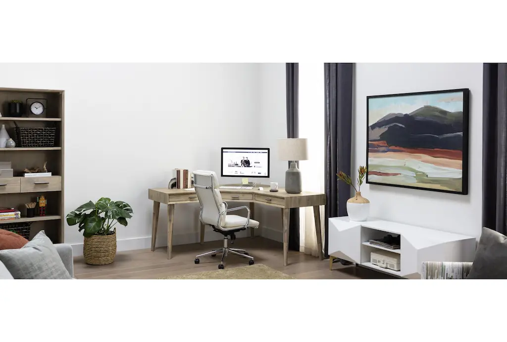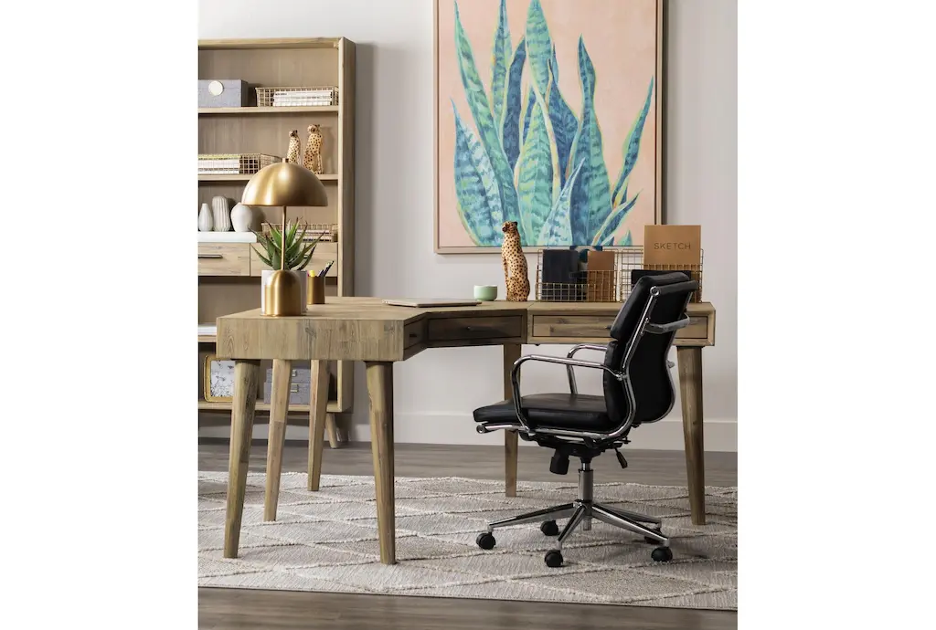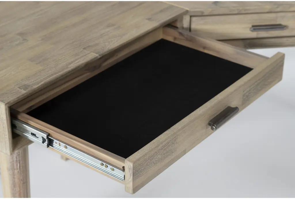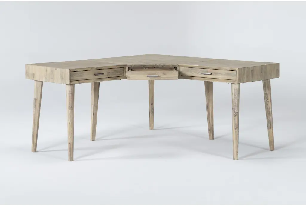 Mid-century simplicity is the key to our Allen L-shaped desk's success. Sturdy and sleek, the solid acacia design features tapered legs, a unique sandblast finish, and includes three slim drawers for efficient office supply storage.