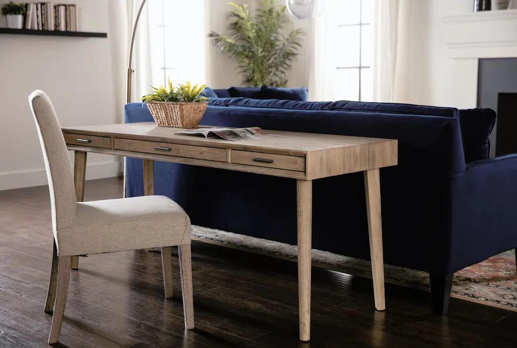 Mid-century simplicity is the key to our Allen writing desk's success. Sturdy and sleek, the solid acacia design features tapered legs, a unique sandblast finish, and includes three slim drawers for efficient office supply storage.