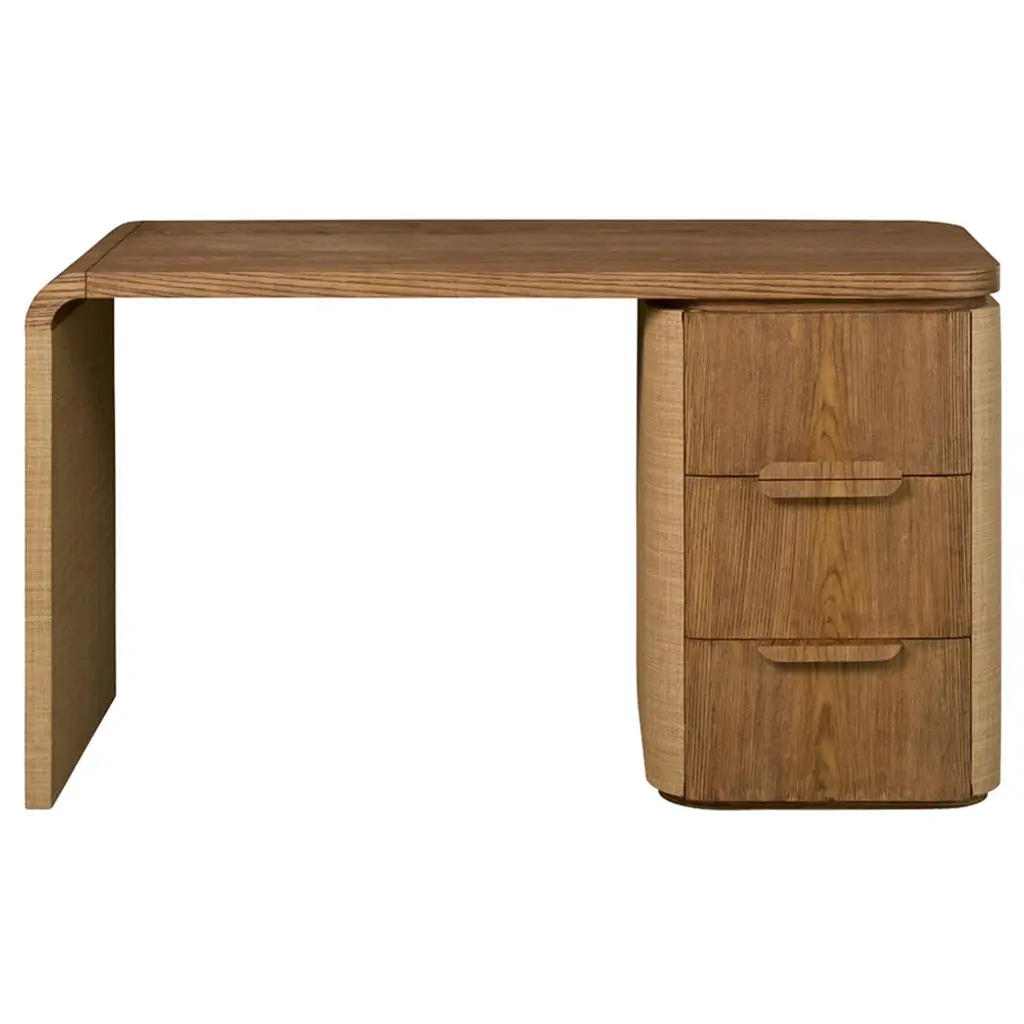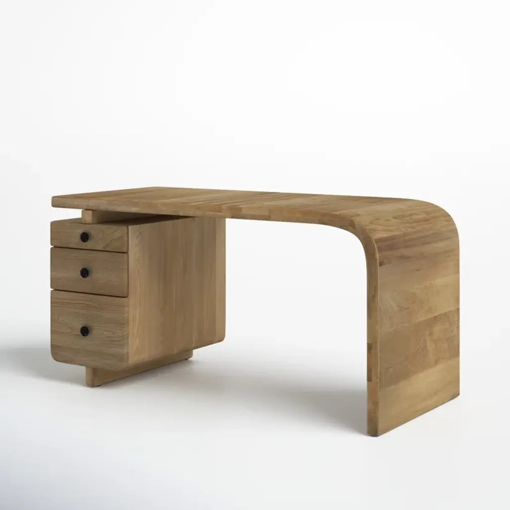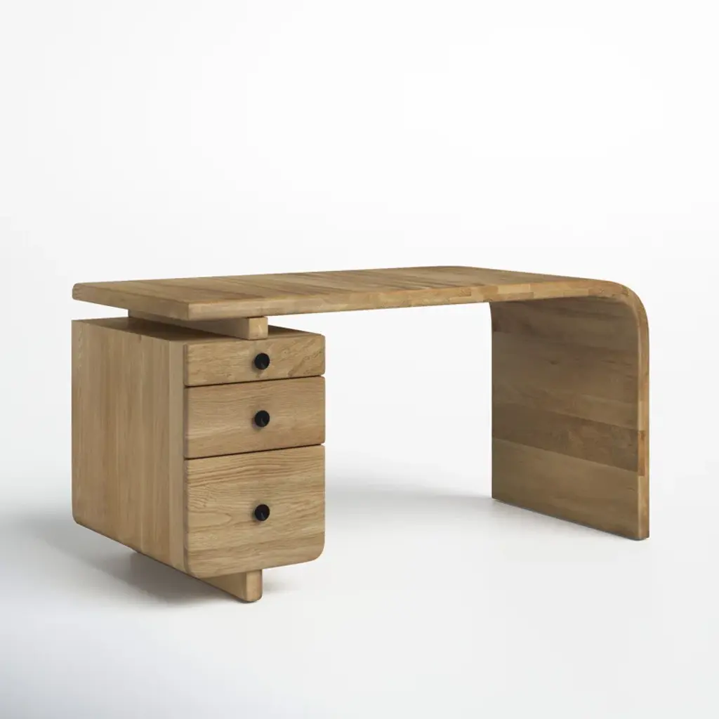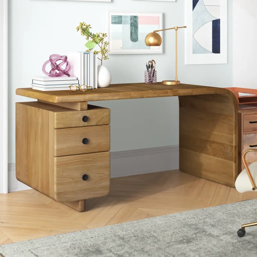 An inspired mix of design, our desk makes a playful statement in solid oak. Handsome and hard-working, this desk features a sweeping desktop and 3 drawers, including one for file folders. The desk's warm color and cathedral grain contrast dramatically with the horizontal round pulls to emphasize sculptural presence.