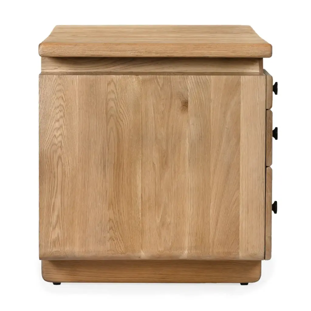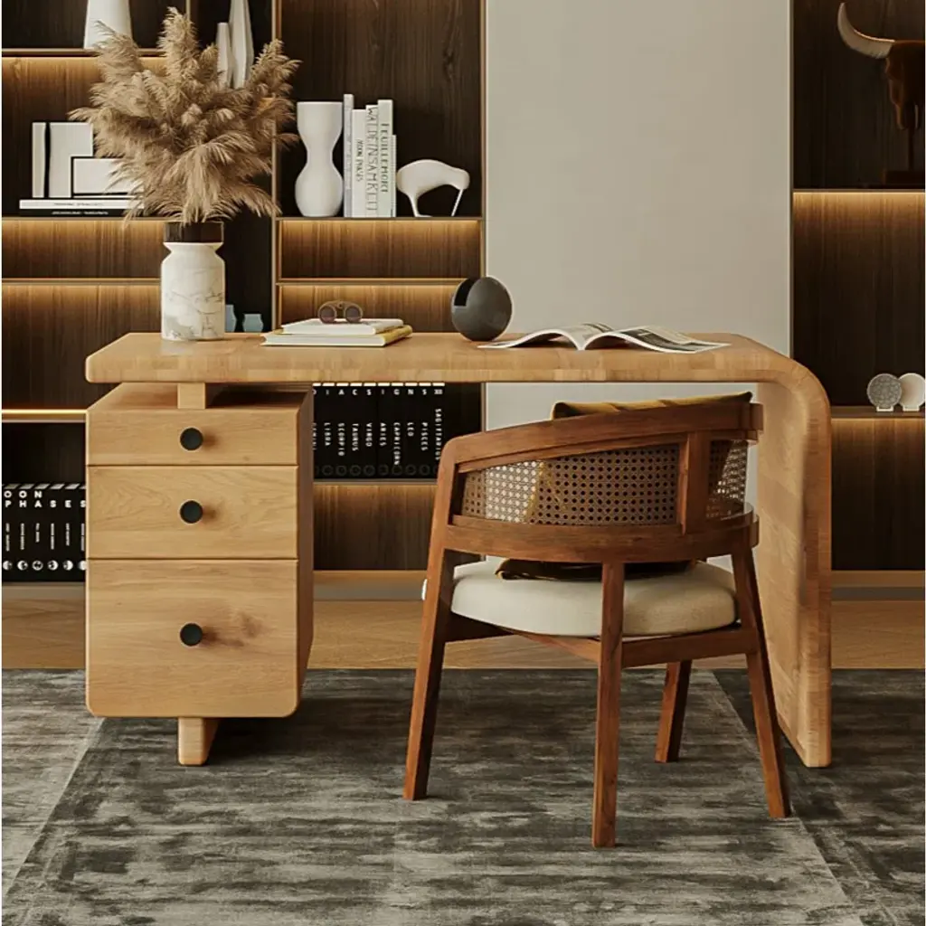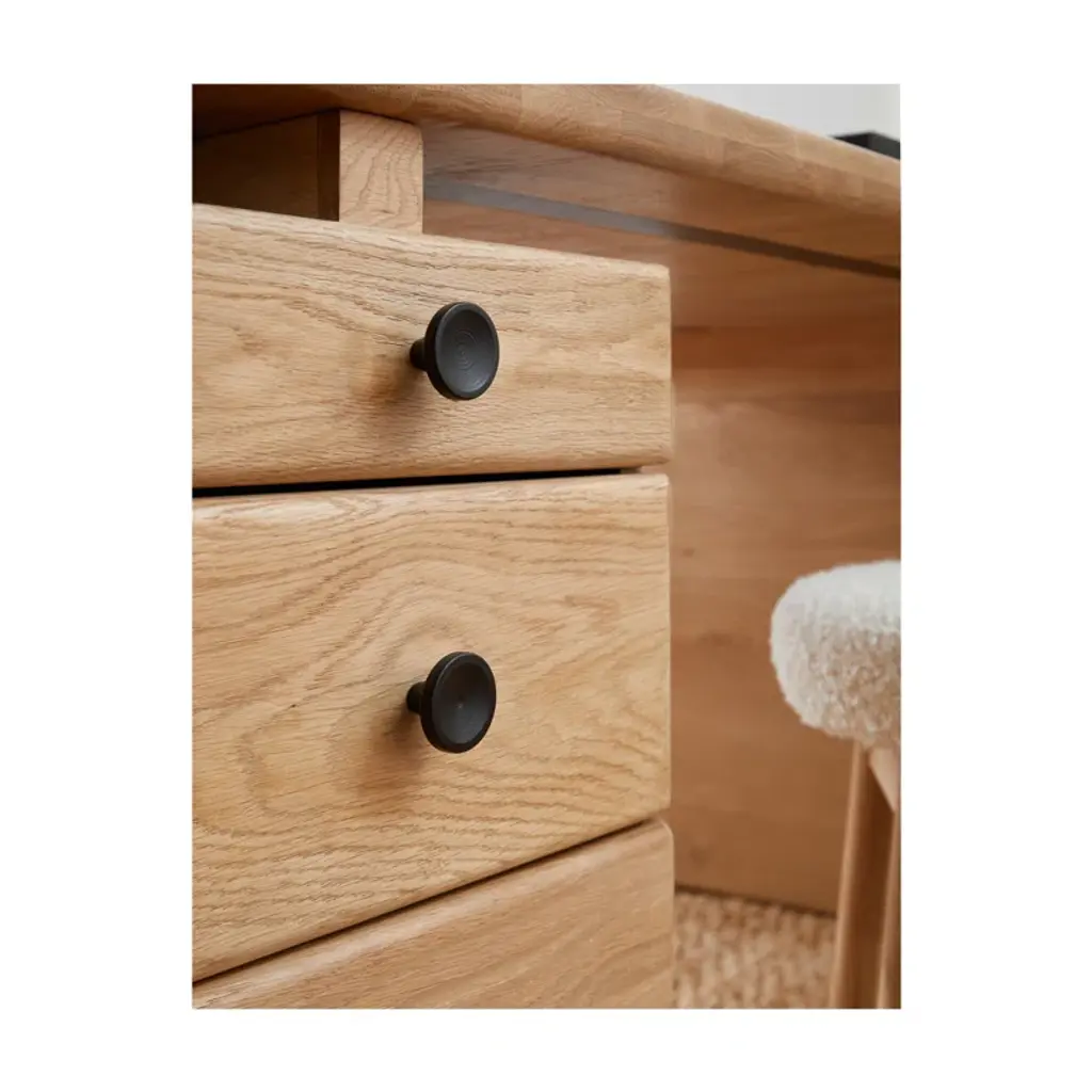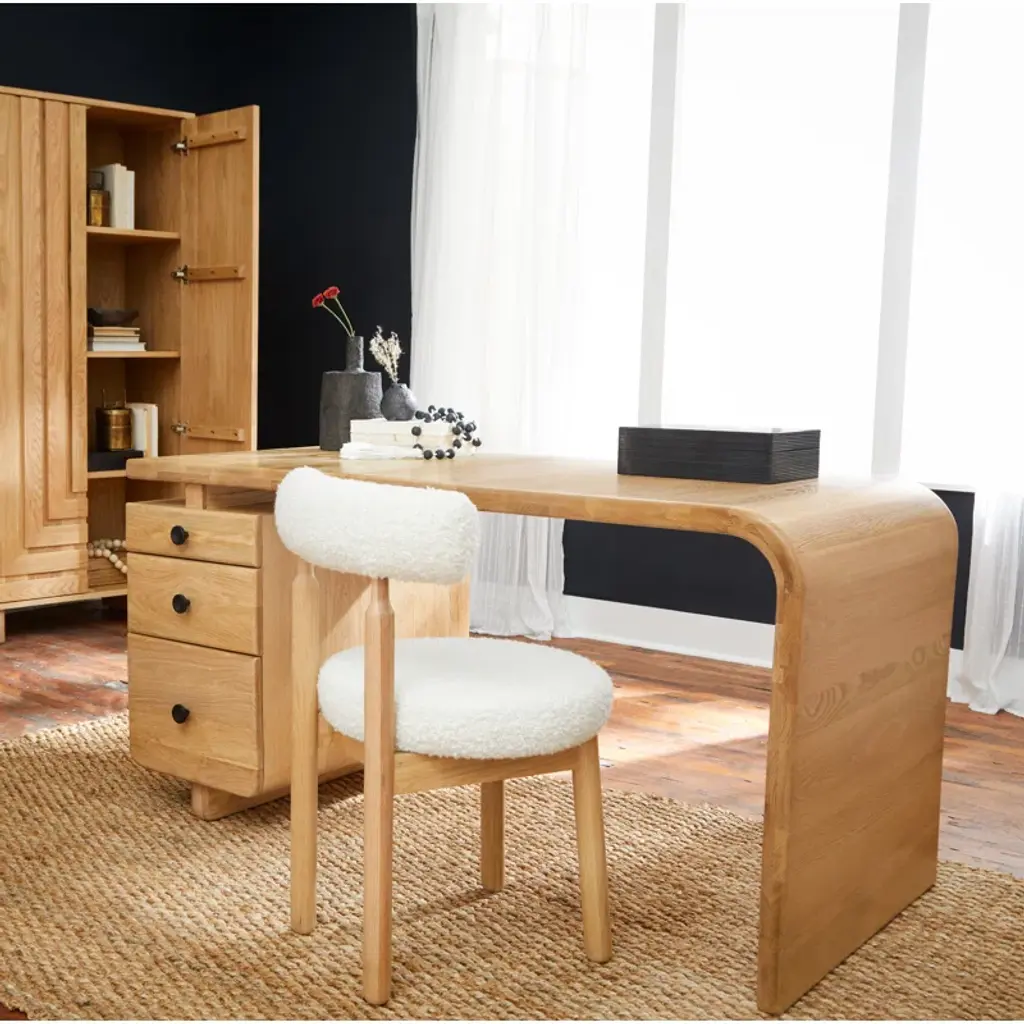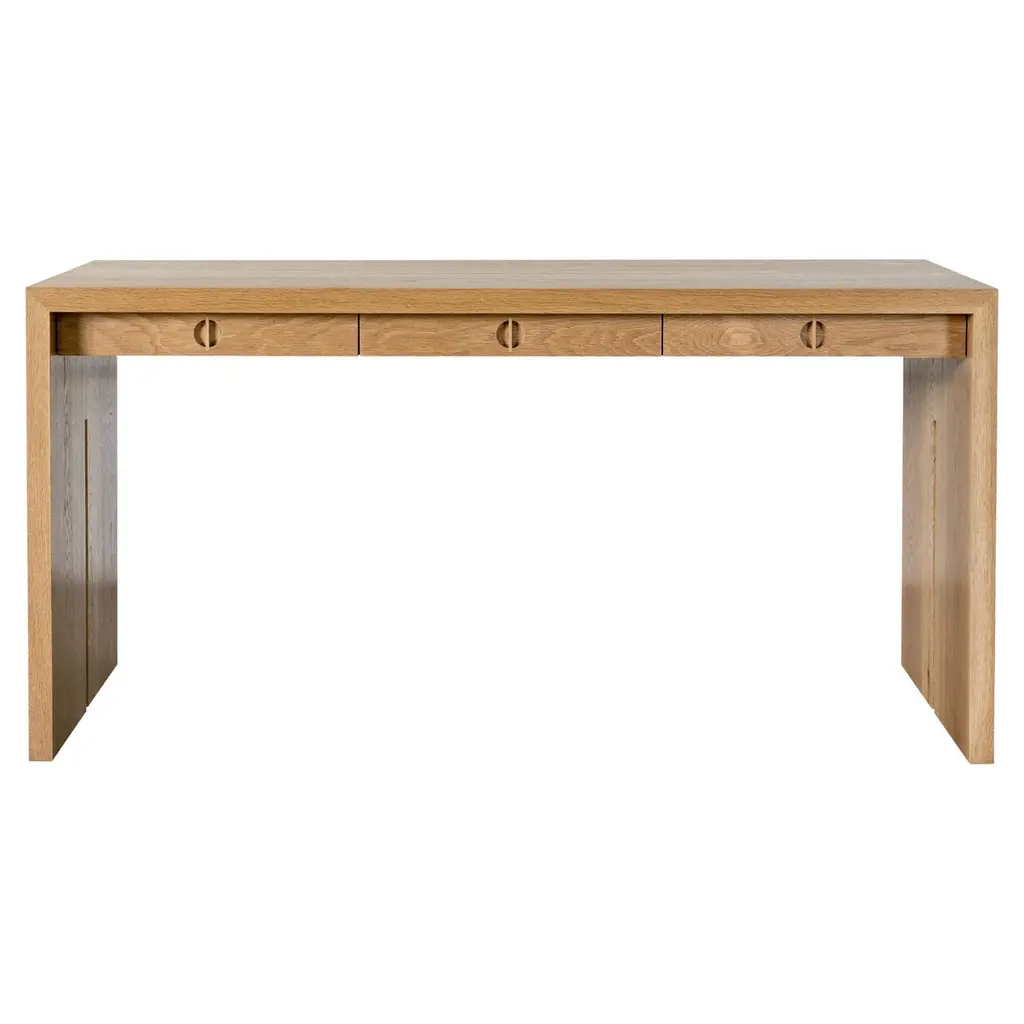 An inspired mix of design, our desk makes a playful statement in solid oak. Handsome and hard-working, this desk features a sweeping desktop and 3 drawers, including one for file folders. The desk's warm color and cathedral grain contrast dramatically with the horizontal round pulls to emphasize sculptural presence.