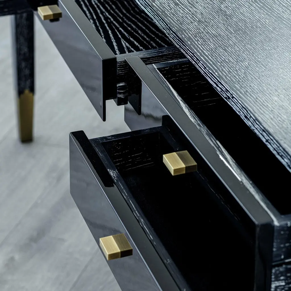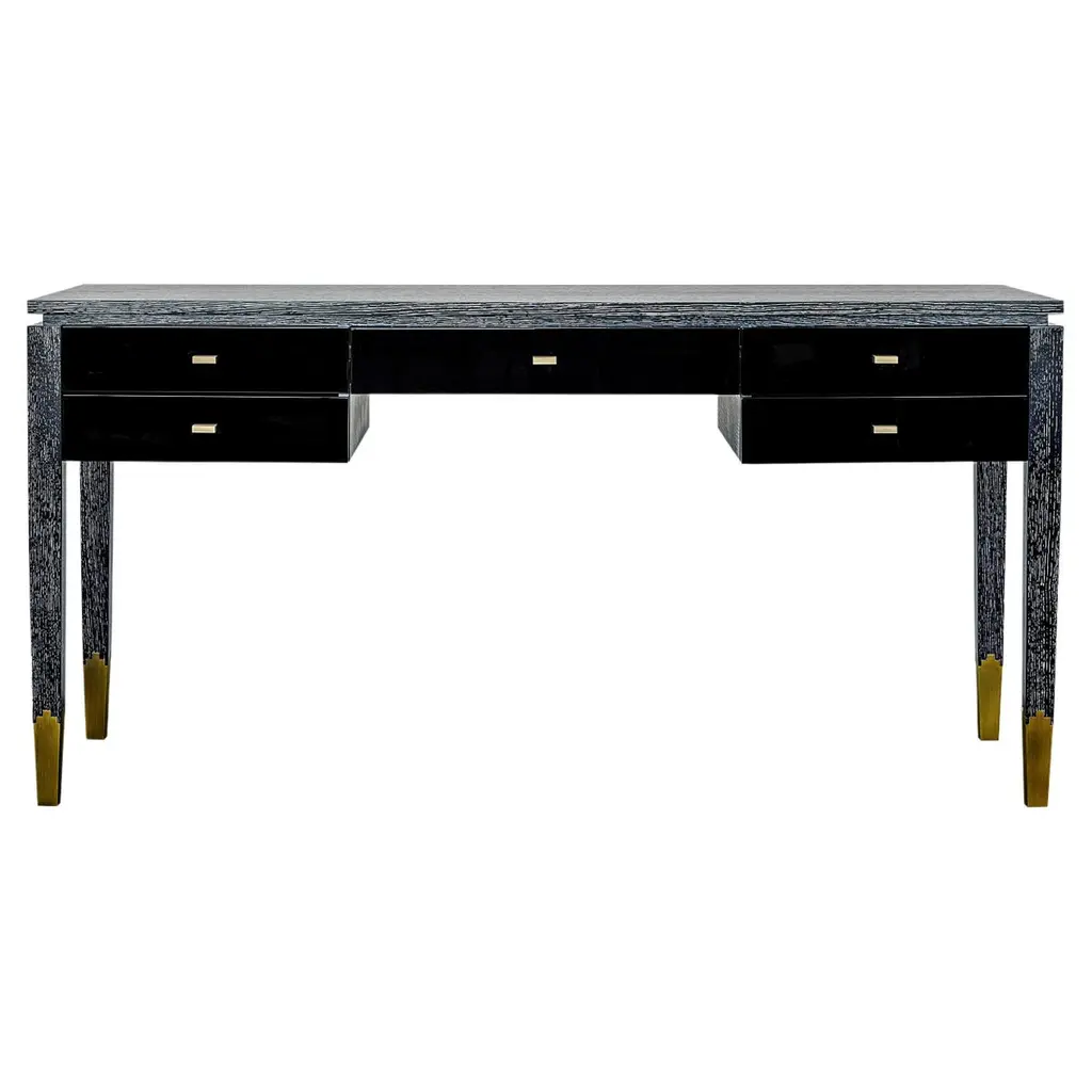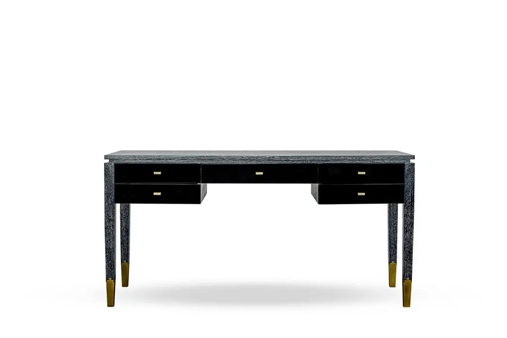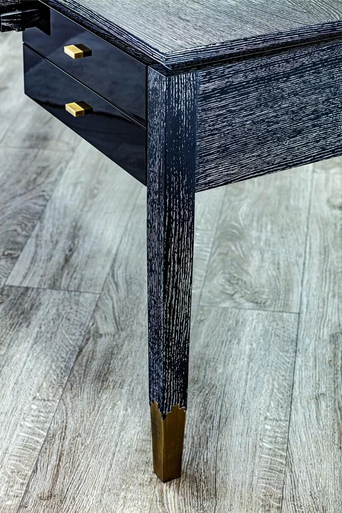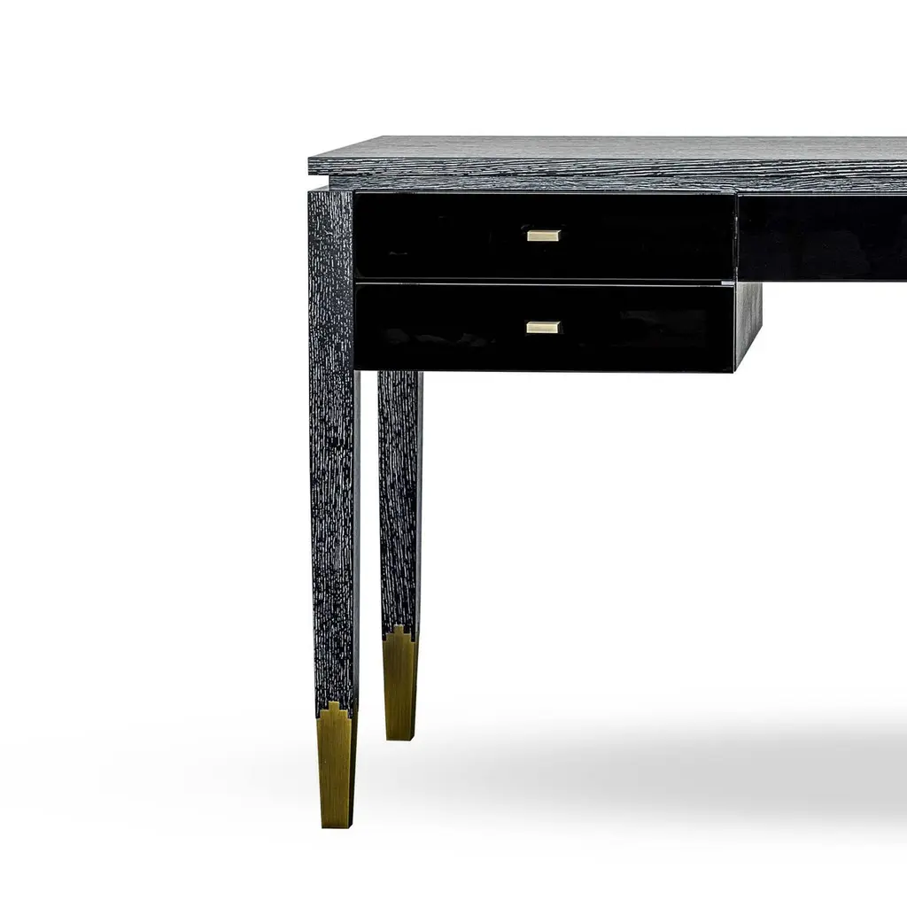 Anna Desk by DUISTT Dimensions: W 140 x D 70 x H 76 cmMaterials: Black Limed Oak, High Gloss Black Lacquered Wood and BrassAnna is an elegant desk, crafted with great attention to details, that features a beautiful structure in oak with a limed finish and sikomoro wood lined with velvet in its drawers. The brass details give this piece both character and beauty.DUISTT is a Portuguese high-end furniture brand.Born in Porto in 2014, the company breathes history and modernity. We blend ancient knowledge and techniques with contemporary aesthetics.DUISTT designs refined and sophisticated pieces aiming to provide major comfort and quality. Handmade pieces crafted with art that are absolutely unique and can last generations.We invite you to discover our elegant and timeless designs and we hope it brings you pleasure.