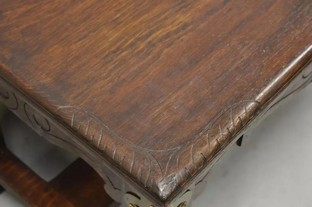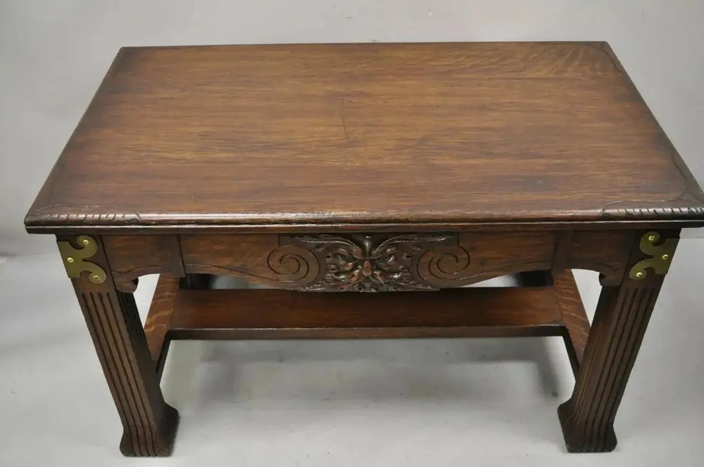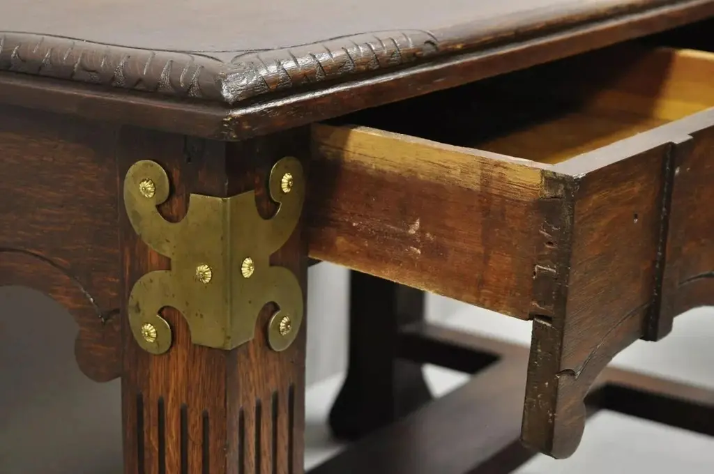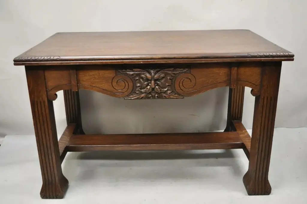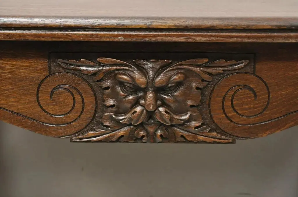 Antique Art Nouveau Carved Oak Northwind Face Desk Library Table With One Drawer