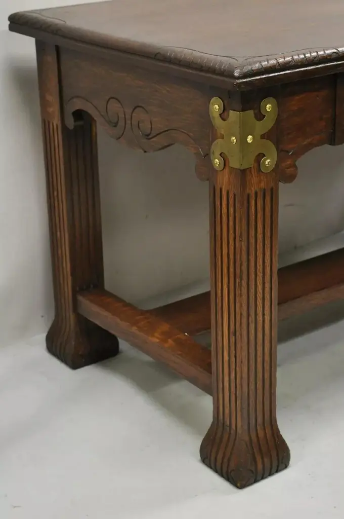 Antique Art Nouveau Carved Oak Northwind Face Desk Library Table with One Large Dovetailed Drawer. Item features carved Northwind faces to the front and rear, brass corner mounts, solid oak wood construction, finished back, very nice antique item. Circa Early 20th Century. Measurements: 29.5" H x 48" W x 28" D x 21" Leg clearance.