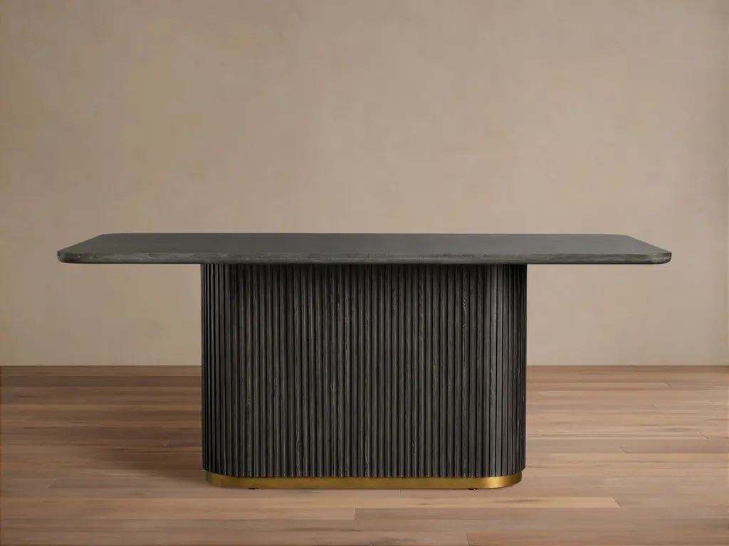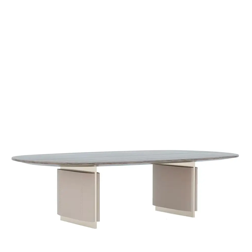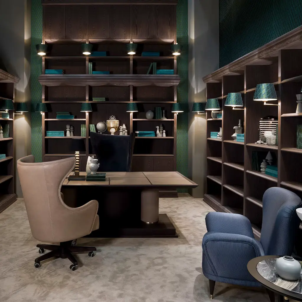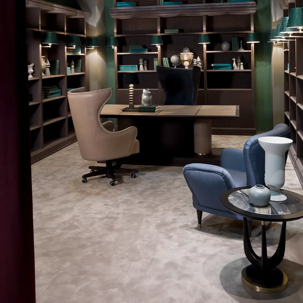 Arcade is immediately striking with its proportions and imposing profile. This solemn desk, designed by Aldo Cibic, consists of two columns covered in leather that act as a base, embellished with a series of details in satin brass. The top is covered in soft leather and the finish is car. The finish is brown with three flames.