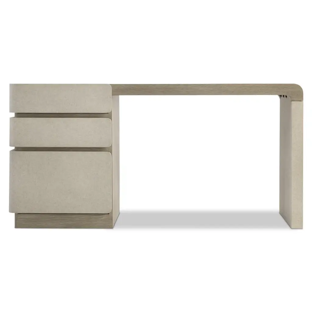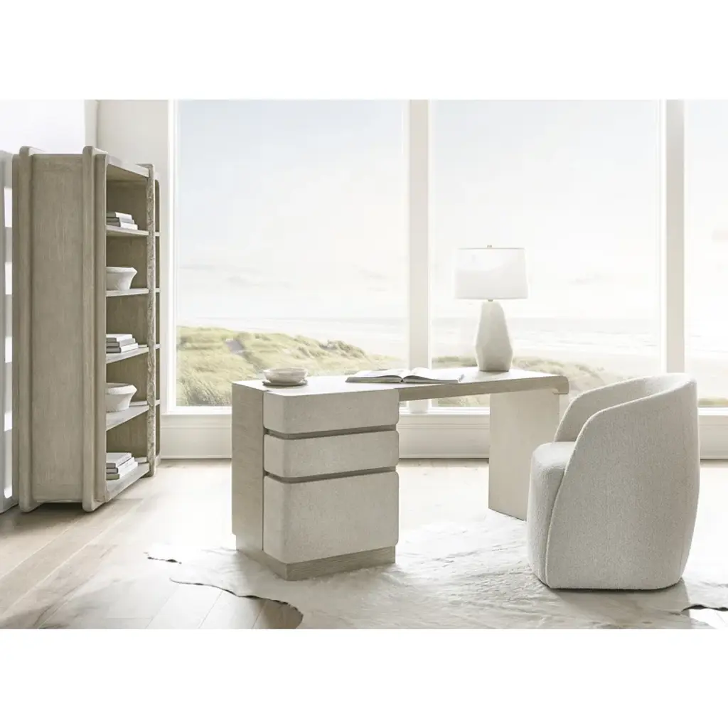 Tactile materials showcase an elemental style on the Arcadia desk. Raffia wraps a support panel and three drawer fronts, curving around the sides for a unique design. The wire-brushed wood is in Clay finish.