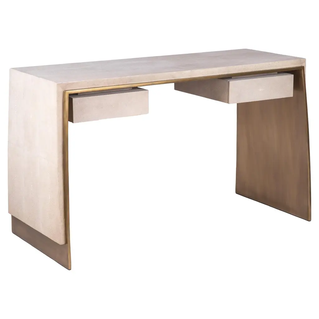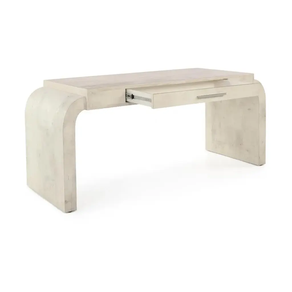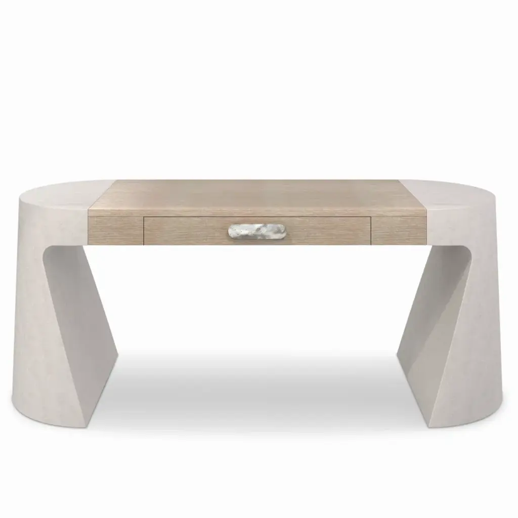 The Arcus Desk is a stylish contemporary design featuring clean lines and pristine tones. Crafted from beech and oak woods, the piece features a two-toned look, showing curved legs in Tiza Gesso and a rectangular body in Grey Washed Oak. This gorgeous desk includes one drawer with a slender handle of Polished Stainless Steel.