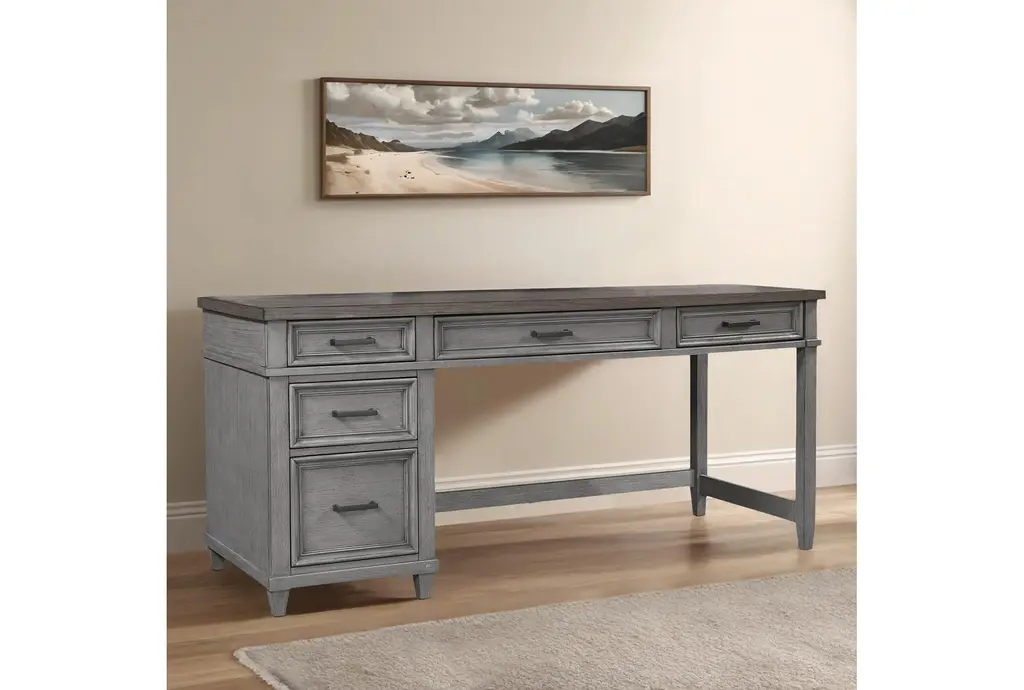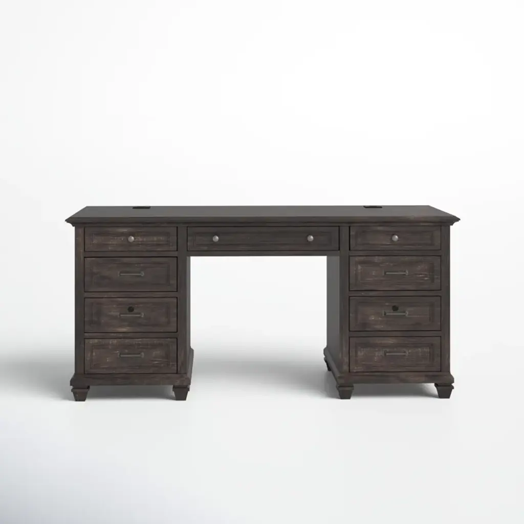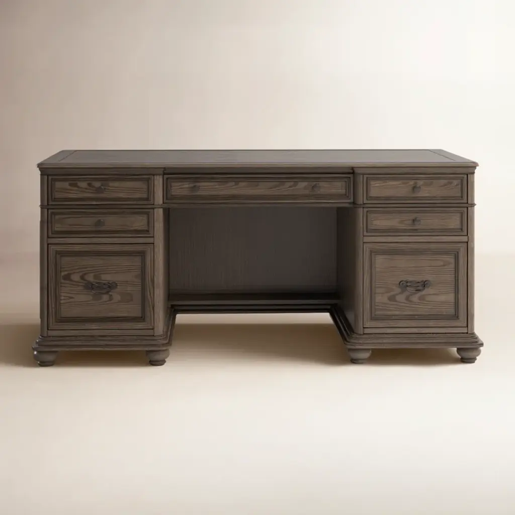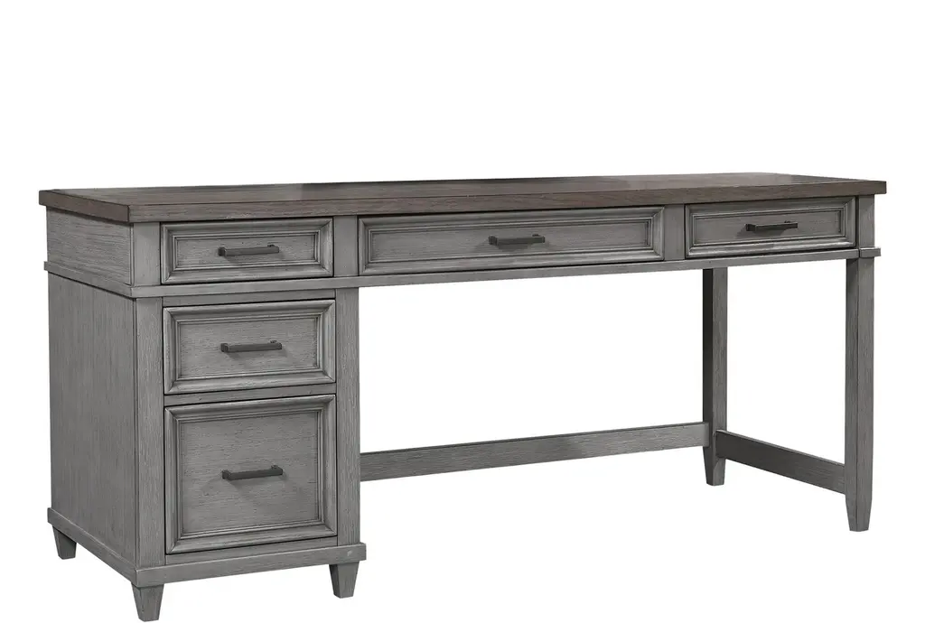 The Arden Pedestal Computer Desk combines classic design with practical functionality for your home office. Finished in a sophisticated grey, this desk is built from select hardwoods with oak and birch veneer, ensuring durability and a timeless appeal. It features ample storage options, including drawers and cord management, making it ideal for organizing your workspace.