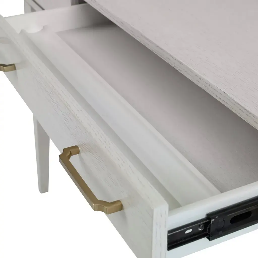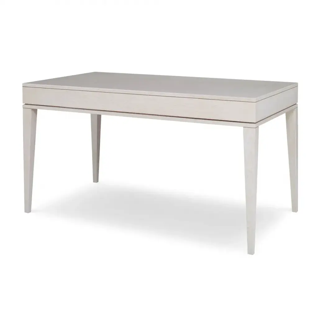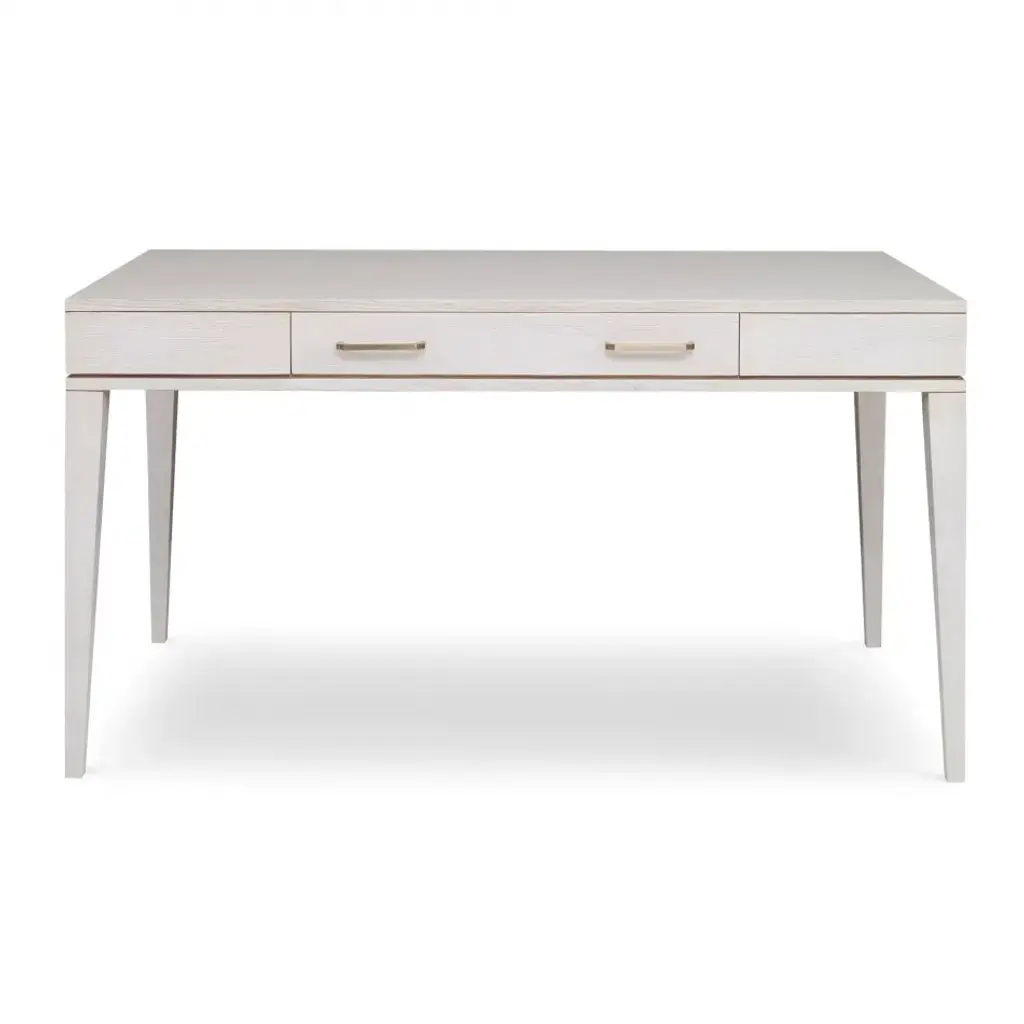 A clean lined writing desk featuring a straight grain Oak veneer top with one pencil drawer. Brass hardware. Available in any of our custom finishes.