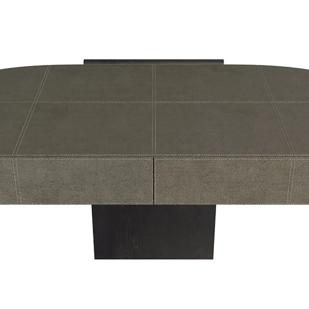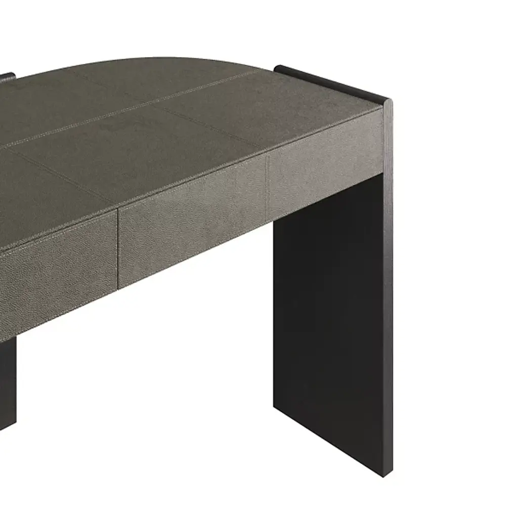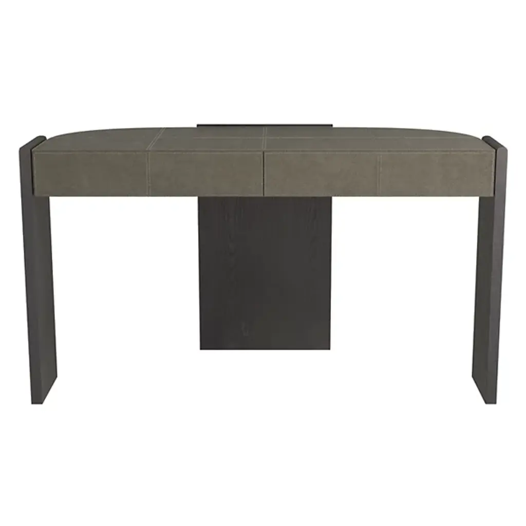 Sculptural allure and simplistic profile shape the contemporary Arellano Desk from Arteriors. An embossed leather desktop balances on three oak supports, designed for viewing from all angles. Below, soft-closing suede drawers stylishly stow desktop essentials, keeping the surface clean and leaving the rich leather on display. Its clever curves express sleek style through contrasting textures, its leather top contrasting with the wooden base, adding sculptural solidity and airy expressiveness to home or business offices through artful materials.