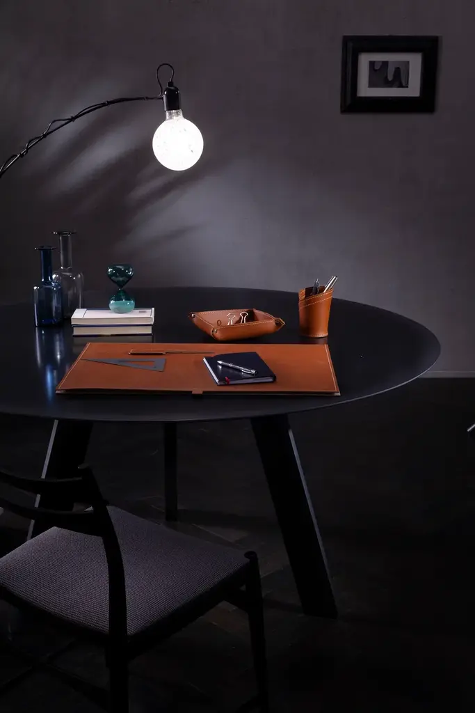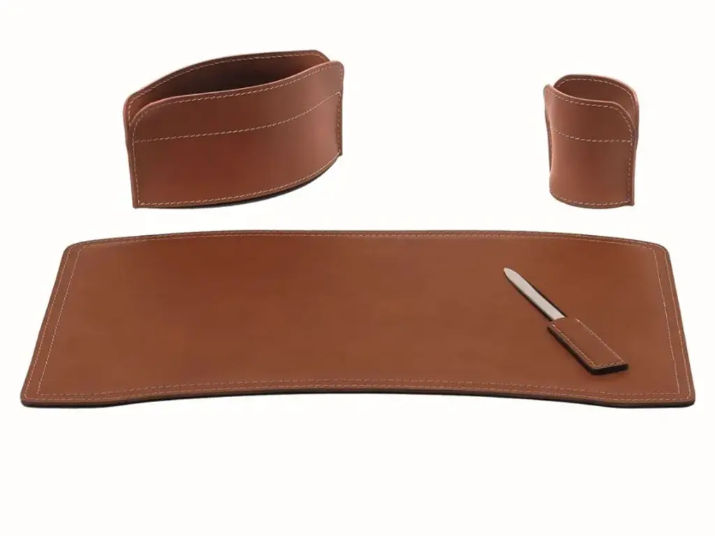 Desk set of regenerated leather composed of: desk pad, pen holder, paper knife, glove.