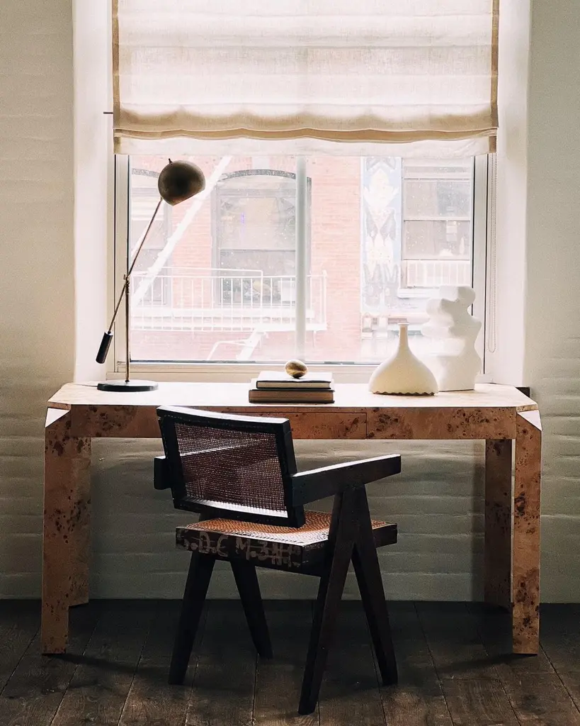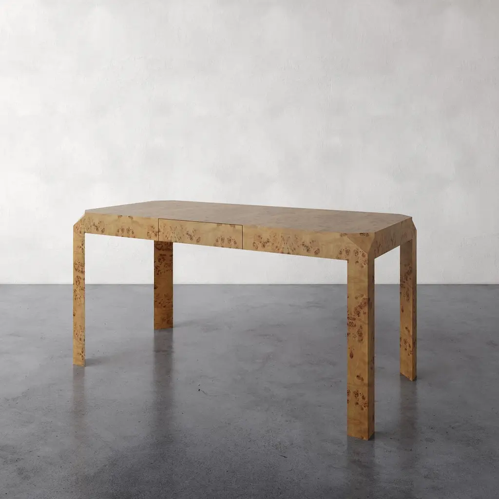 The Armand Desk reflects the heritage of French Art Moderne in a form wrapped entirely in hand-matched exotic burl veneer. Continuous grain flows seamlessly across the top, legs, and apron, highlighting the wood’s organic movement and angular, cut corners. A hidden drawer maintains the burlwood desk’s clean silhouette while offering functional storage. Designed for studies, libraries, or creative spaces.Design Notes:• Fully wrapped exotic mappa burl veneer• Crisp architectural legs with continuous grain• One concealed drawers• Hand-finished surfaces for depth + dimension• A sculptural, heirloom-quality writing desk