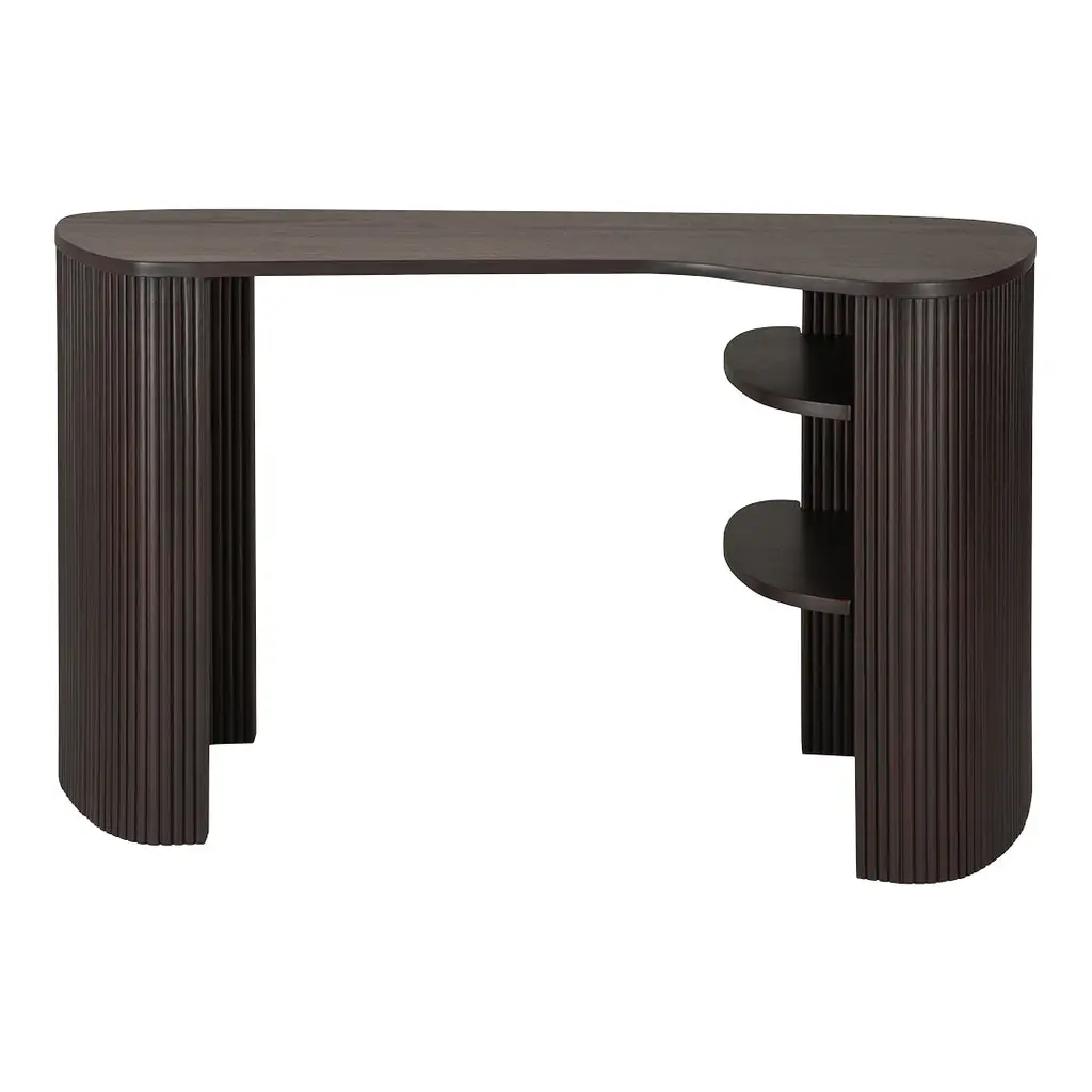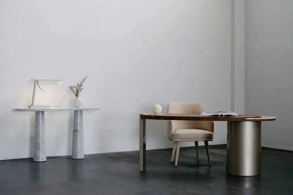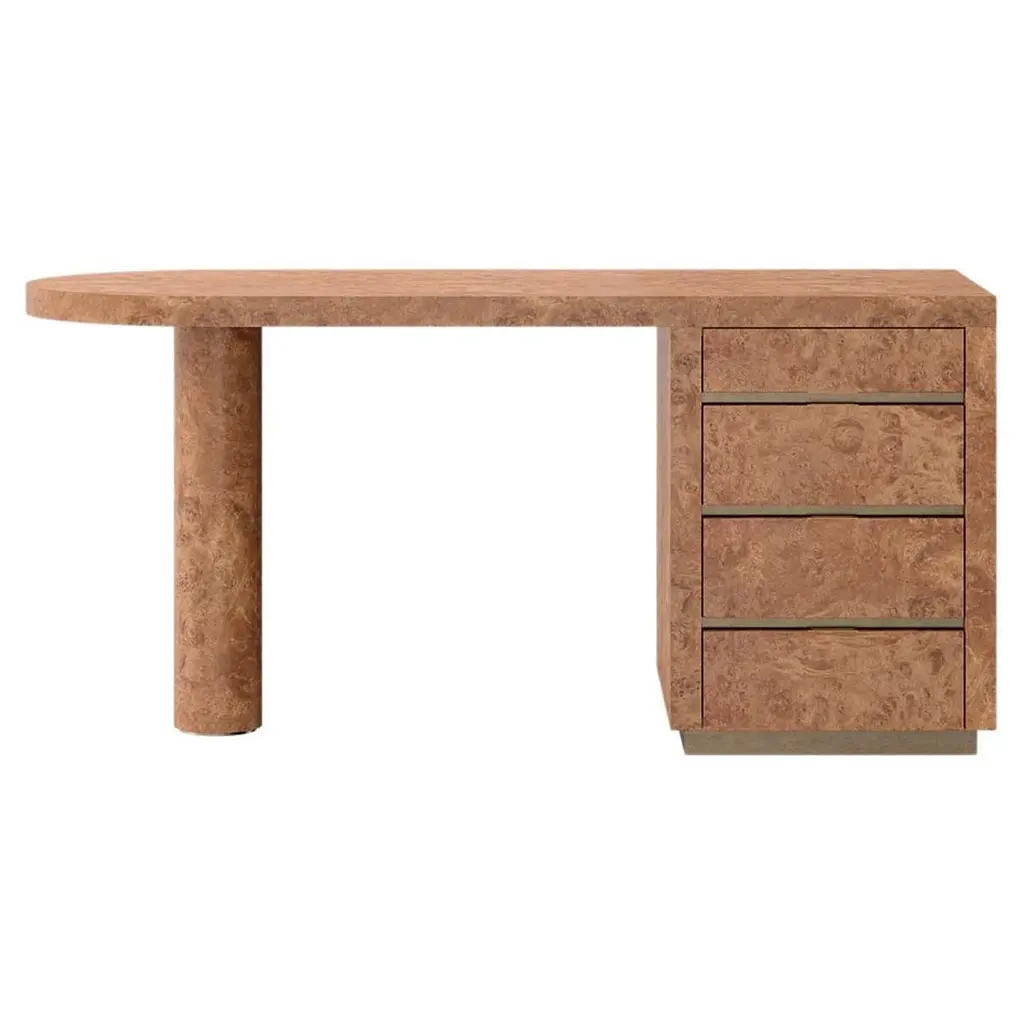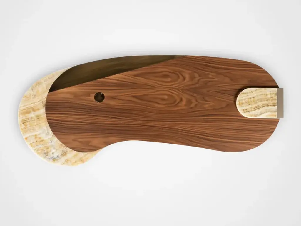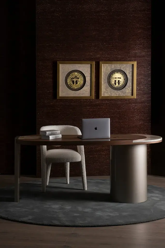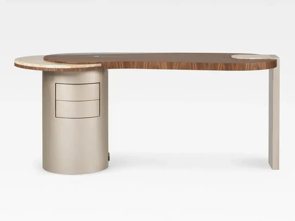 Armona is a wooden desk. Using high quality materials and textures, we have designed an elegant desk that captures the shape and warmth of the beautiful island of Armona. Raw beauty and exquisite design are harmoniously combined in this wooden desk with a walnut veneer top and inlays of dark oxidised brass and polished shadow onyx, a match made in heaven.Materials & FinishesFI073 Champagne bronze powder; high-gloss finishWD075 Walnut; natural colour; matt finishME026 Dark oxidised brass; high-gloss finishST003 Shadow onyx; polishedEL005 USB portWith high-quality materials and textures, the elegant Armona collection captures the shape and warmth of the beautiful island of Armona. Raw beauty and exquisite design combine harmoniously in the wooden coffee table with a dark oxidised brass top and Shadow Onyx, a match made in heaven. With its natural veining, the exuberant stone design carries the eyes to the top.