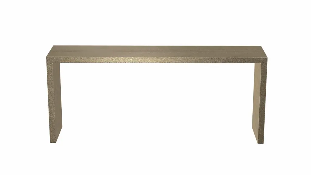 Alison Spear designed this elegant and minimal table for Stephanie Odegard during their trip together to Rajasthan, India. The craftsmen create patterns using different types of hammerings in the metal sheets clad over teak-wood structure.Crafted with utmost care and attention to detail, these Rectangular Console Tables are made to order and are available in twelve metal clad finishes, ensuring that you can choose the perfect one to match your individual style and taste. The use of high-quality materials and expert craftsmanship ensure that each Art Deco Rectangular Console Table is not only beautiful but also a true piece of art.The Straight legs and side arms of this Art Deco Rectangular Console Table are hand carved from solid pieces of teak. Pattern makers trace and cut complex forms that will cover the chair in a skin of copper, white bronze, brass or antiqued white bronze The metal finishes will tarnish over time. Regular non-abrasive household metal polishes can be used to restore the original luster.Overall, if you're looking for a piece of furniture that combines luxury, comfort, and style, then the Art Deco Rectangular Console Table is an excellent choice. With its distinctive curved profile and multiple finish options, this Chair set is sure to elevate the look of any room it is placed in, and be a beloved addition to your home for years to come.The images shown in this listing are shot in different lighting conditions and/or are 3D illustrations. We encourage our customers to please request a sample or a full sample set of 12 finishes so that they can experience the finish first hand. Art Deco Desks and Writing Console Tables in Fine Hammered Brass by Alison SpearSize- 72"x 16"x 30"HMaterials - Brass, Metal sheet, Teak, Wood, MetalTechniques: Hand-Crafted, Hand-Carved, Metal Work, Wood Work, Metal Wrapping, PolishedPlease note that moisture in air, sudden change in temperature and natural movement of wood over time causes the metal to wrinkle or bubble up. We use well seasoned, reclaimed teak and high quality marine grade MDF (wherever technically possible) to avoid and delay the mentioned changes. However a perfect stability of metal cannot be guaranteed. Please note that our smooth finish metal clad pieces will have some unavoidable tool marks. This is proof that everything is done by hand. The smooth finish will not come out like a machine made perfect surface and the master artisan will do their best to make it look as good/clean/stable/perfect as he possibly can.The antique white bronze finish is hand done by using an acidic chemical over the white bronze finish to recreate a natural patination. Like with the natural patination of silver, copper, or brass, the final result and color uniformity of the patina cannot be guaranteed. The goal of this finish is to achieve rainbow-like shades with dull, shiny, cloudy, and streaky patches to give an illusion of antiquing. Please note:None of our metal clad pieces are treated with a protective “finish” thus enabling the items to age naturally over time. We will of course polish them well before we pack them. a) Copper oxidizes faster than the other metals. In six to twelve months it will most likely lose its shine and will gradually turn to different shades of brown and/or green/blue. This aging process and its effect is referred to as verdigris. After a year the piece should not change much more. Copper does not rust, but does require periodic cleaning in order to retain its original shine if that the preferred option. ('BRASSO' or any known copper polish can be used to polish copper).b) Brass retains its shine for far longer than others, but will tarnish if not cleaned on occasion. ('BRASSO' is made to polish brass).c) White bronze, has the least tendency to show age or tarnish. If kept in a controlled climate, this metal will hold its shine for years. It can be cleaned with a cleanser and polished with a cloth. d) The antiqued white bronze finish will react with the natural elements the fastest in the beginning but it too will stop reacting and will settle down in a stable state like copper after 6-12 months. Since it is already antiqued and looked like it is tarnished, as described in an earlier message, this fast reaction will not change the over all look. In that way this surface is most forgiving. The images shown in this listing are shot in different lighting conditions and/or are 3D illustrations. We encourage our customers to please request a sample or a full sample set of 12 finishes so that they can experience the finish first hand.
