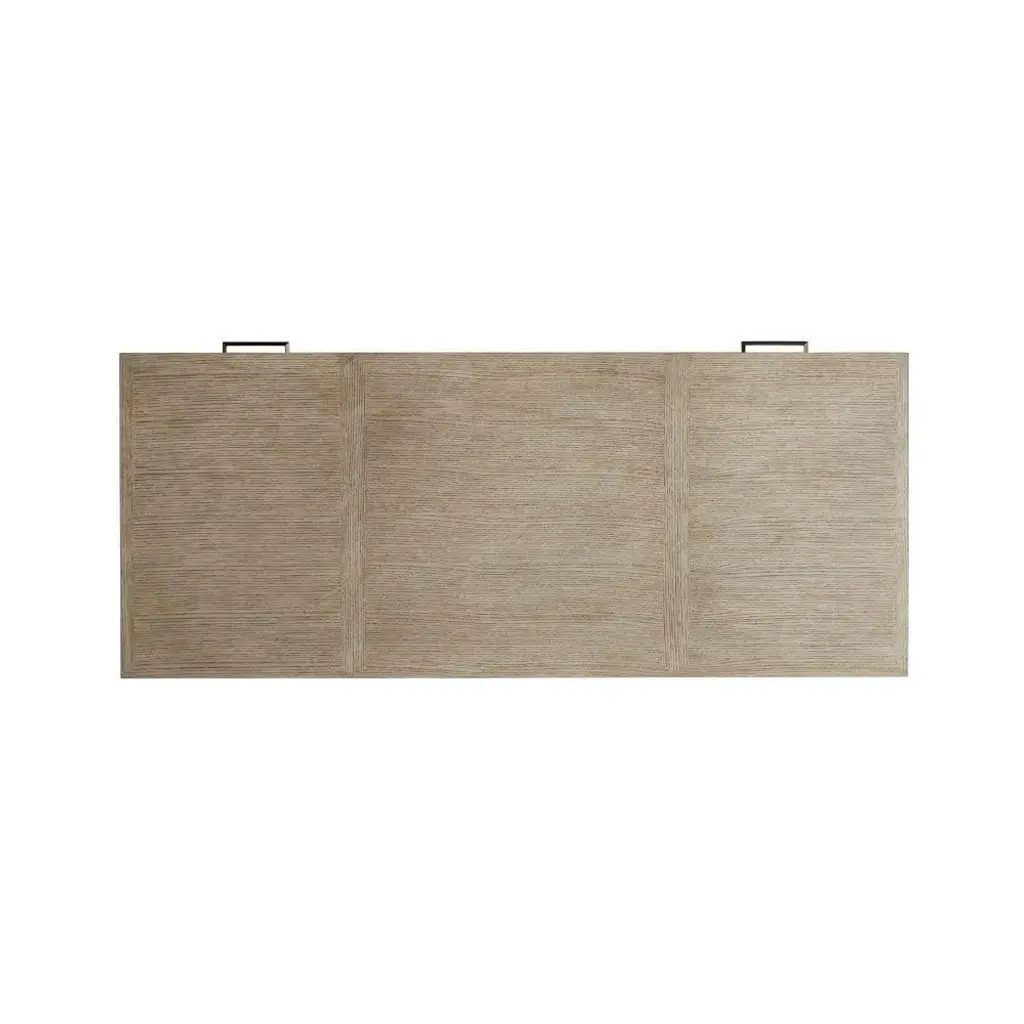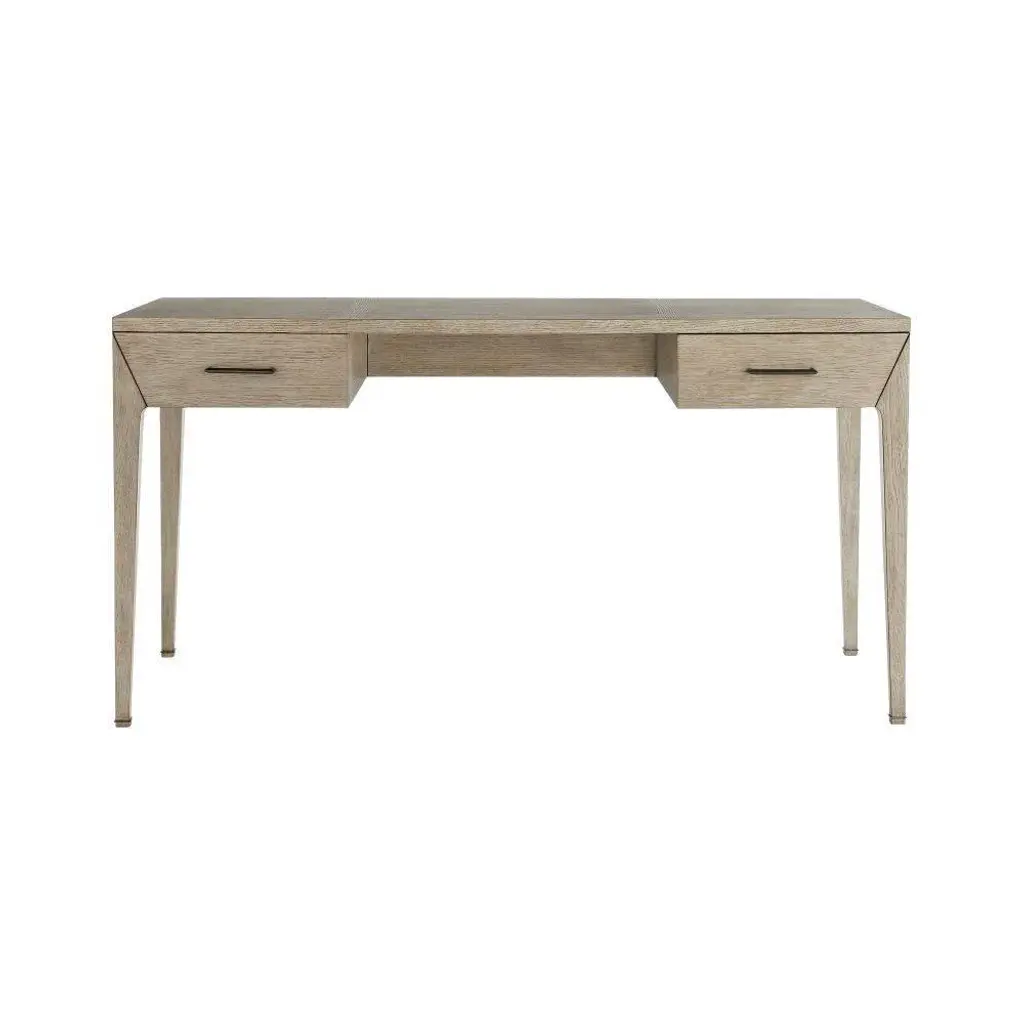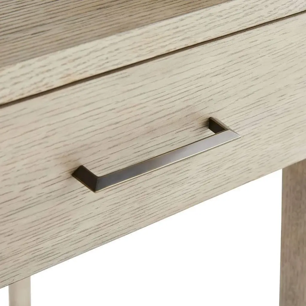 This petite desk puts forth a simple and straightforward style. Its functional design favors clean lines and absolute angles that define the space it occupies. A smoke finish enhances the natural grains of its solid oak construction and facetedvintage brass pulls effortlessly elevate its modest aesthetic. Smaller in scale we see this piece best utilized as a compact desk or a vanity table.