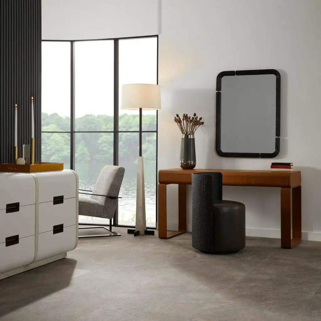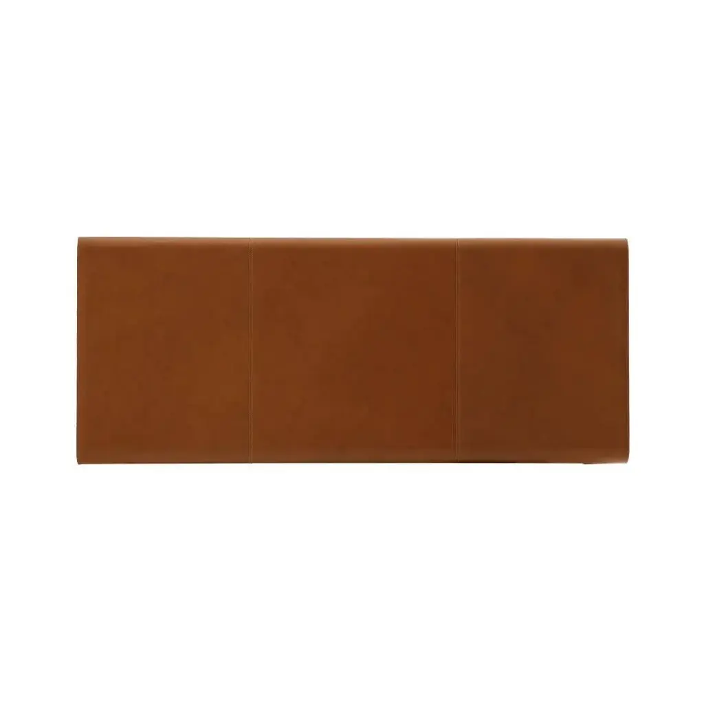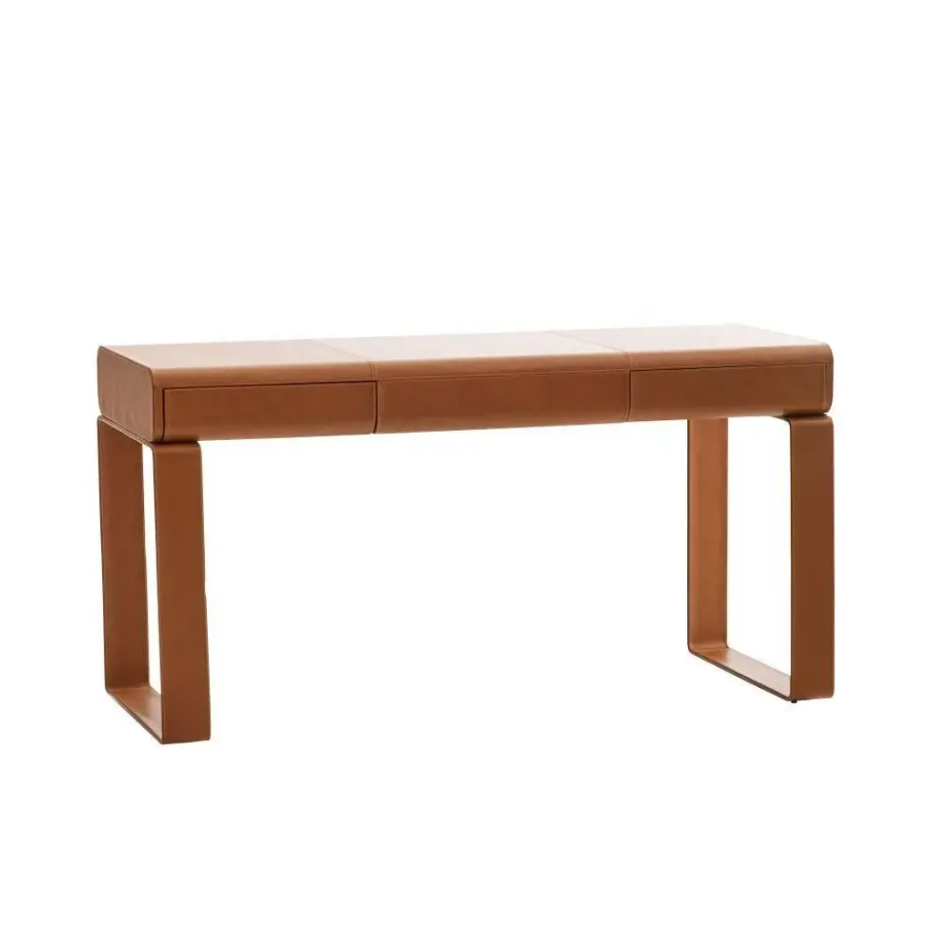 With a fresh take on modern form, the Meyer brings a softer approach to geometry with soft curves wrapped in leather. The soft and lush russet leather construction features a finish that is rich with light brown and burnt gold hues. The cohesive composition of the desk's top inconspicuously hides two drawers, which are both lined in suede in a matching russet finish. Leather and suede will vary.