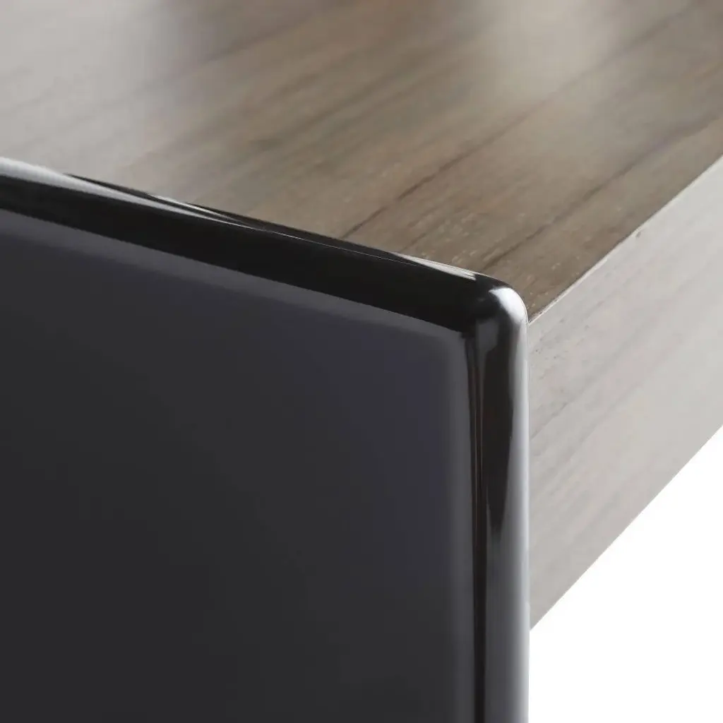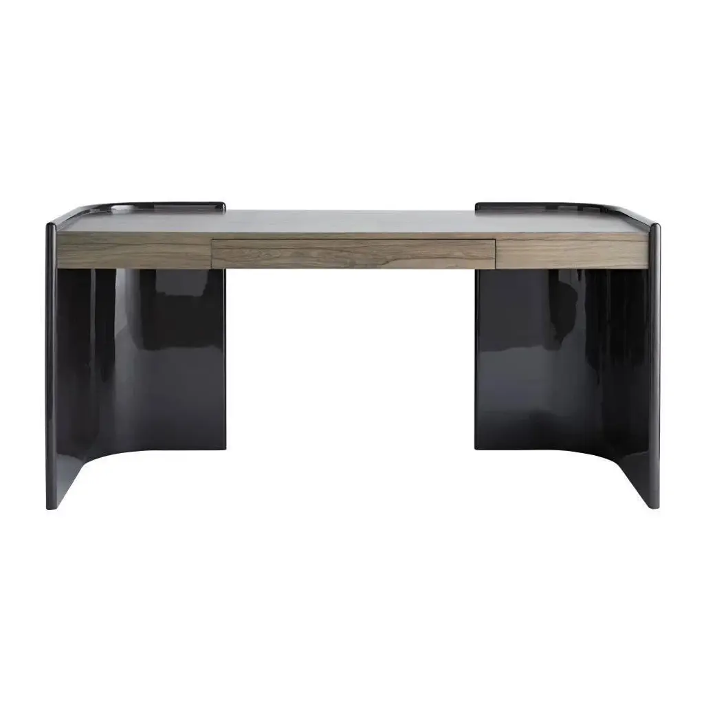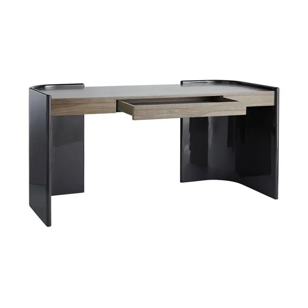 Grand curvatures and modern gray tones make for an inspiring place to work. The frame is coated in an exclusive, charcoal lacquer, rounded to give the desk a uniquely updated design. On the wide work space is a lacy and light, tropical ofram wood veneer in chateau gray, laid with a slip matched technique where the slices are patterned in the same way, rather than alternating. In keeping the façade clean and sleek, the drawer features a recessed handle, with single extension, soft-close glides.