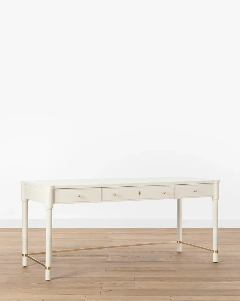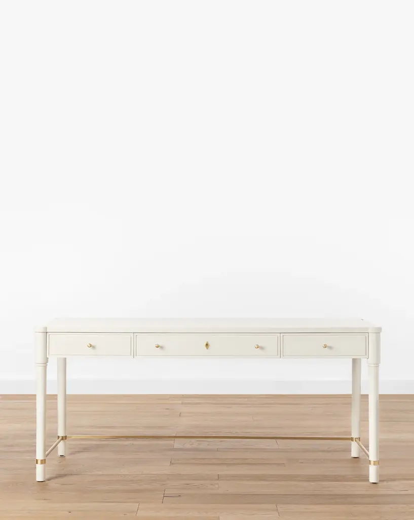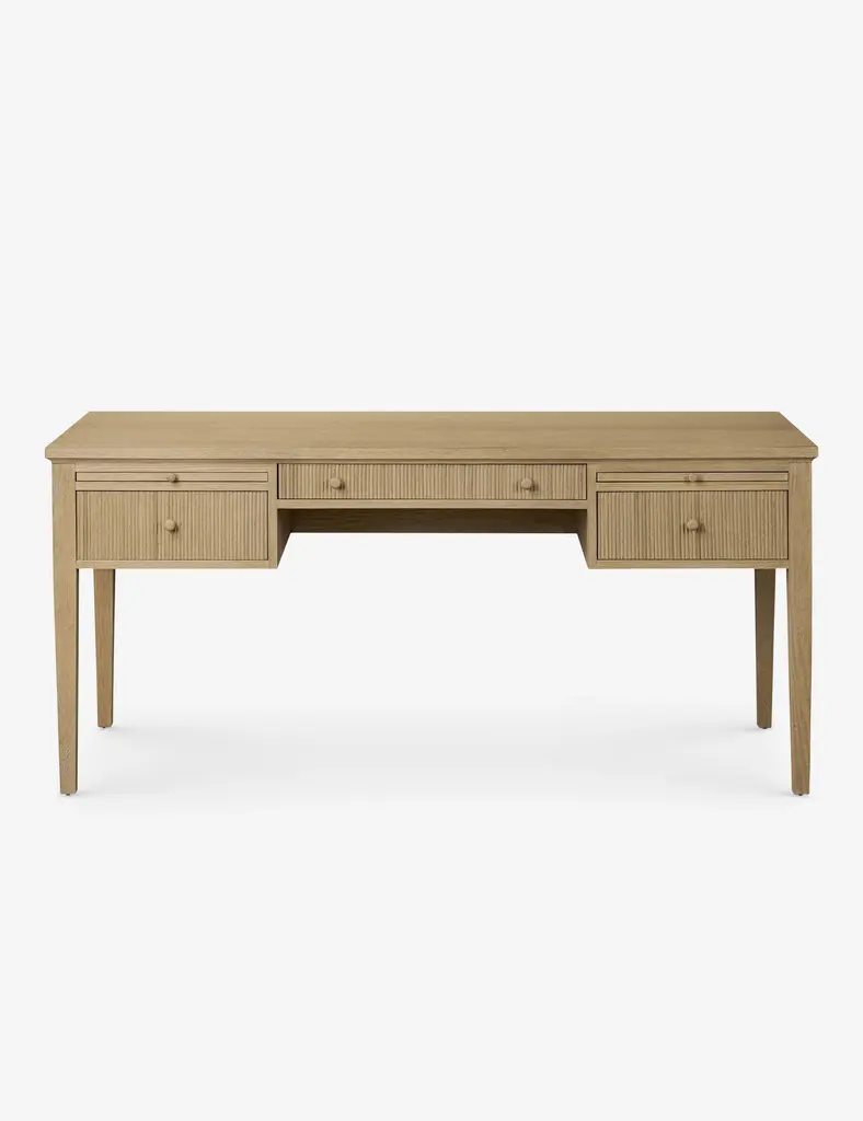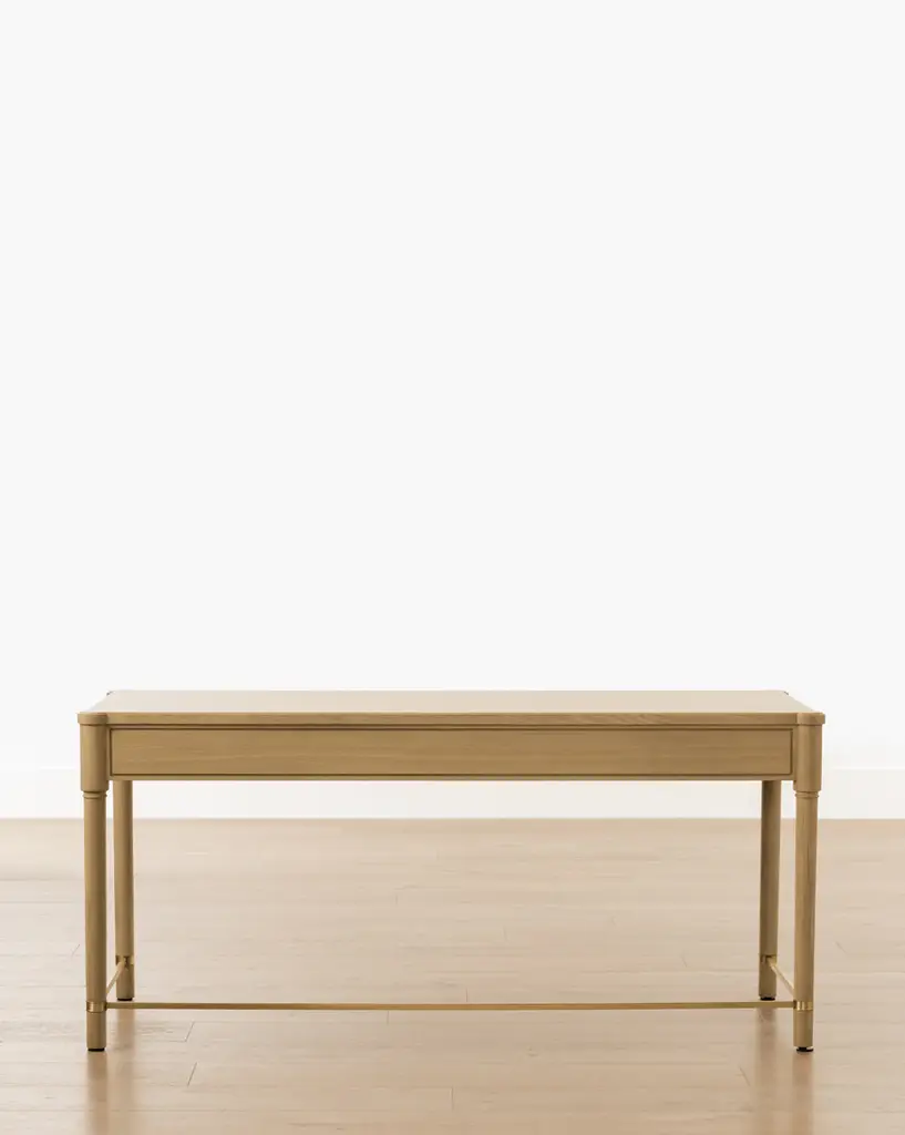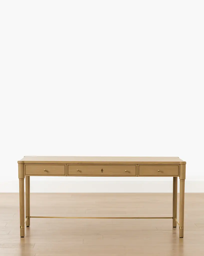Featuring traditional details, our Arthur Wood Desk brings a classic feel to your home office. The oak desk's sleek neutral tone and sleek brass hardware give interest without overwhelming your style, and its three drawers and wide surface provide practicality.