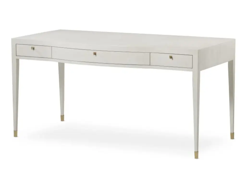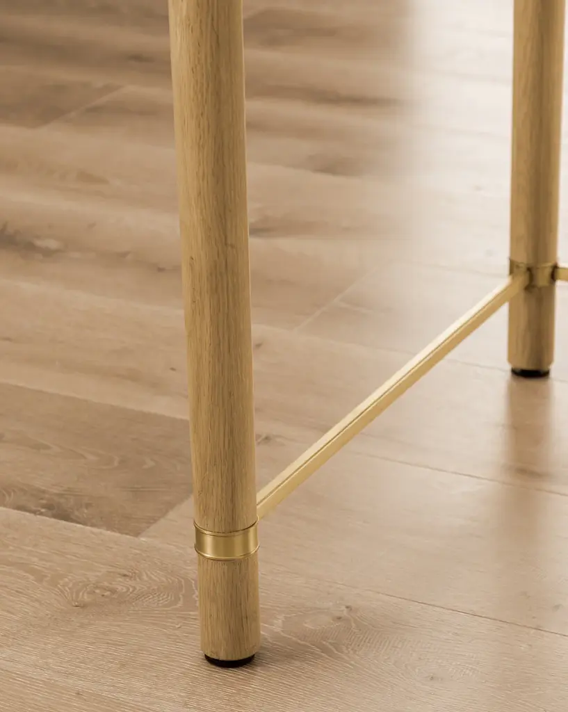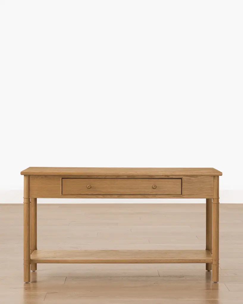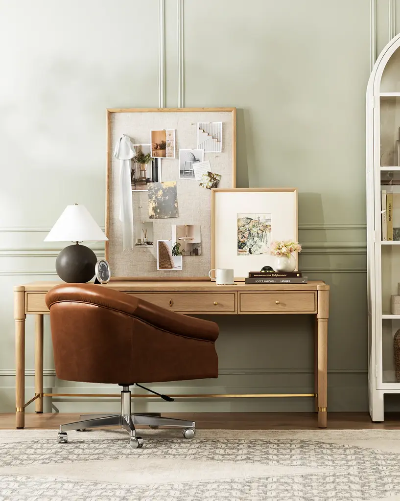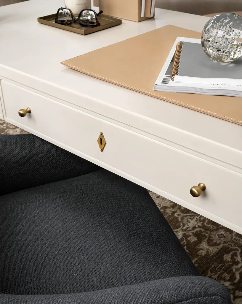Featuring traditional details, our Arthur Wood Desk brings a classic feel to your home office. The oak desk's sleek neutral tone and sleek brass hardware give interest without overwhelming your style, and its three drawers and wide surface provide practicality.