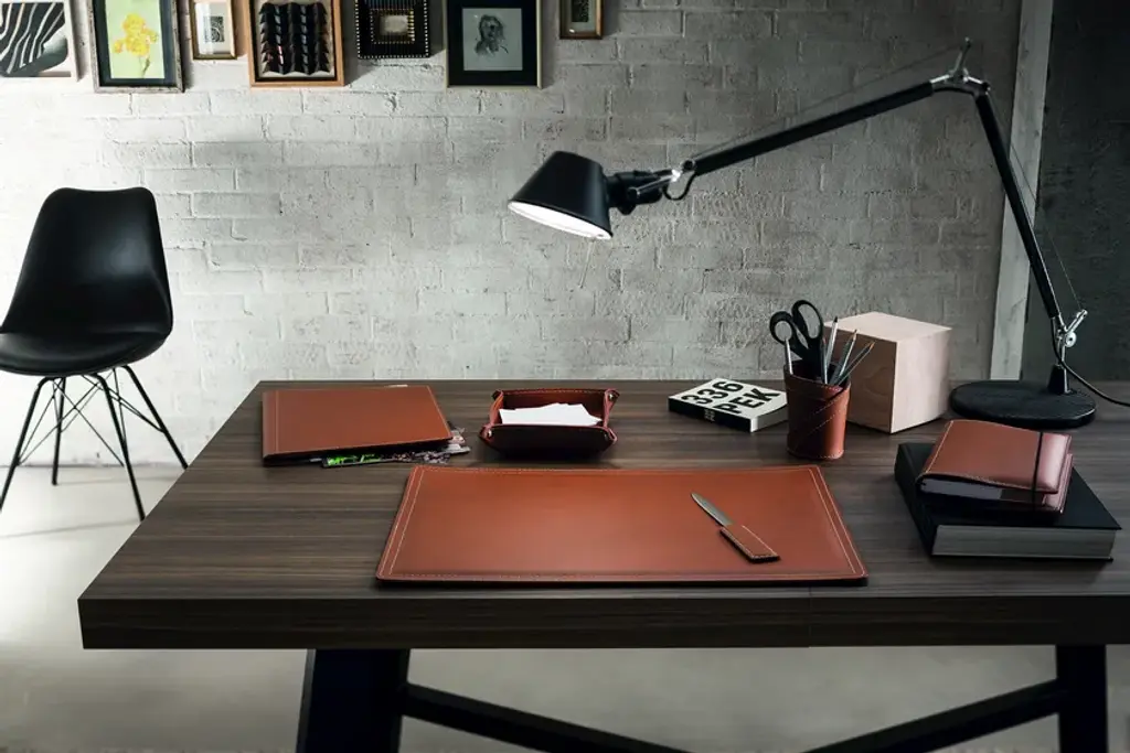 Desk set of regenerated leather composed of: desk pad, pen holder, paper knife, glove, document holder, agenda holder.