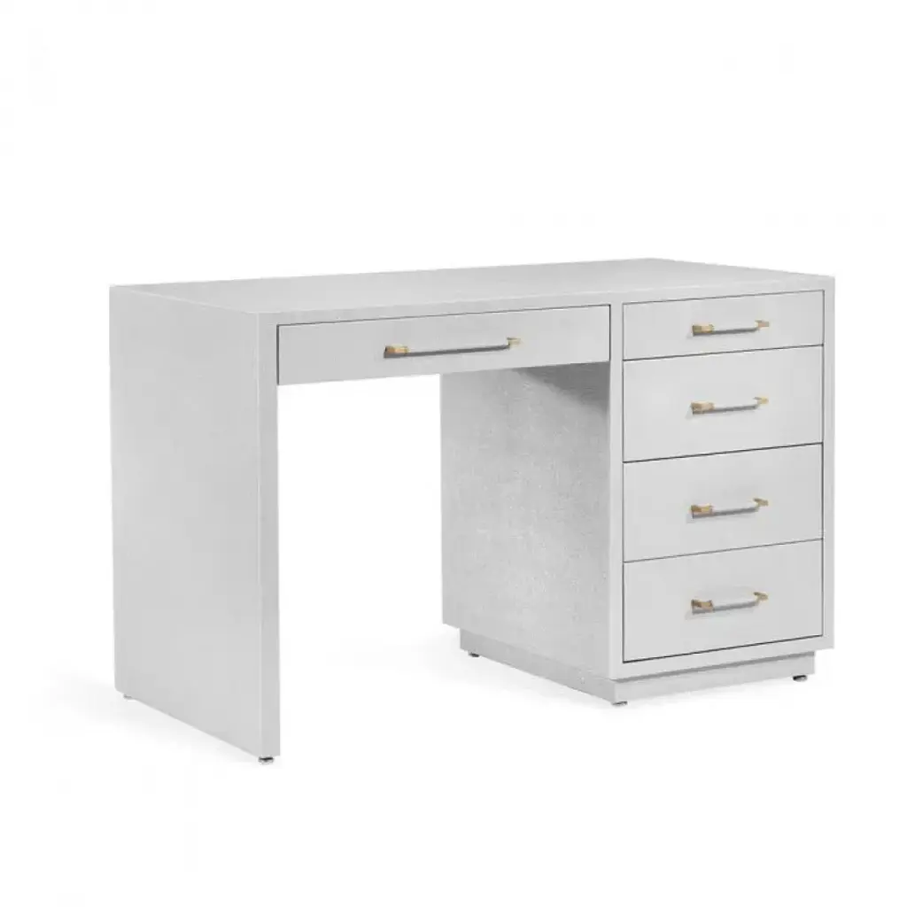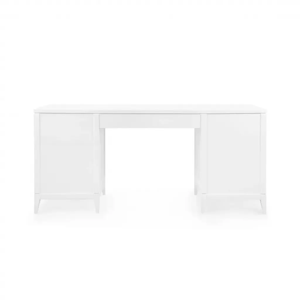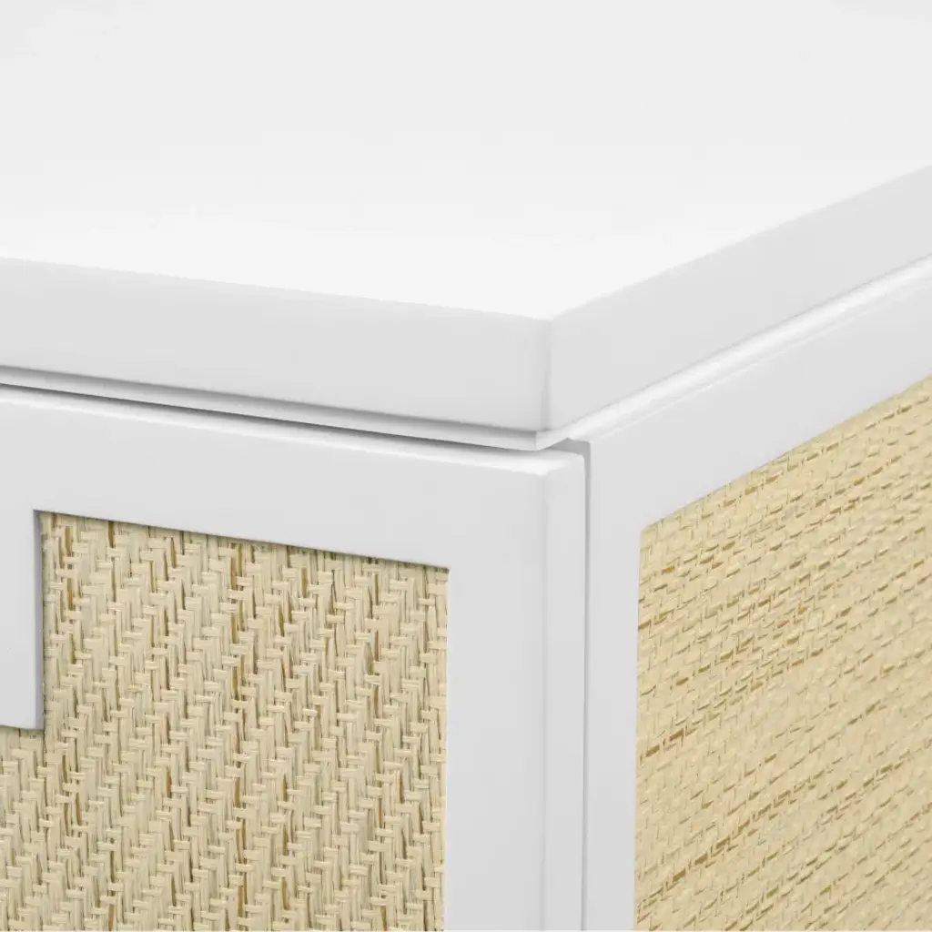 Modern minimalism meets Eastern romance in our Astor Collection, inspired by the elegance of Chinoiserie design. The Astor Desk, available in white lacquer, features panels of finely-woven grasscloth, which add a natural element. Its seven soft-closing drawers of veneered wood boast custom brushed brass pulls as the perfect finishing touch, securing its status as a chic and sumptuous piece of work. Add to a study, living room, or bedroom with worldly ambitions.