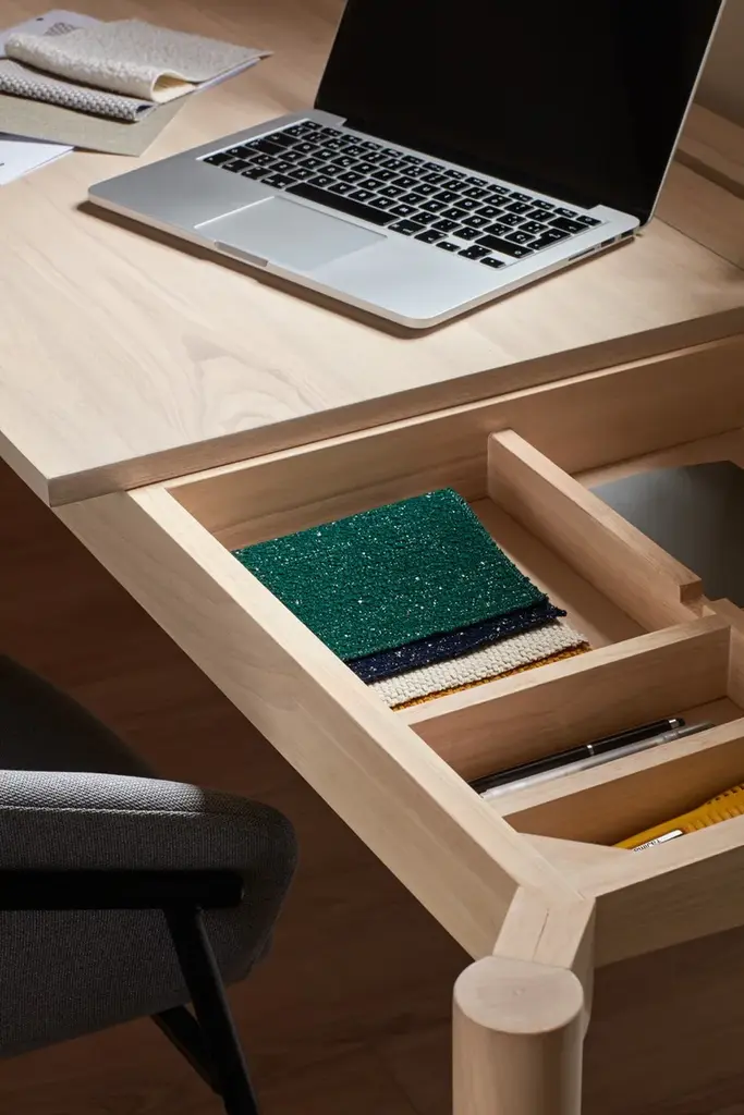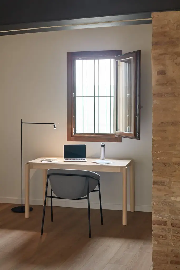 Atlas is a rectangular writing desk with an 18 mm top in ash veneer and solid wood legs. The legs are made of solid rubber wood and the top is medium density fibers veneered with ash wood painted in natural or in black.Available in two finishes:16042_TE Light Natural16041_TE BlackSimulating to remain in a constant balance, Atlas table is a robust and resistant piece of furniture, where contrasts appearances and concepts coexist in it, giving it a unique appeal. Atlas collection has 4 legs with a slight offset, cylindrical shape, which support the rectangular top.