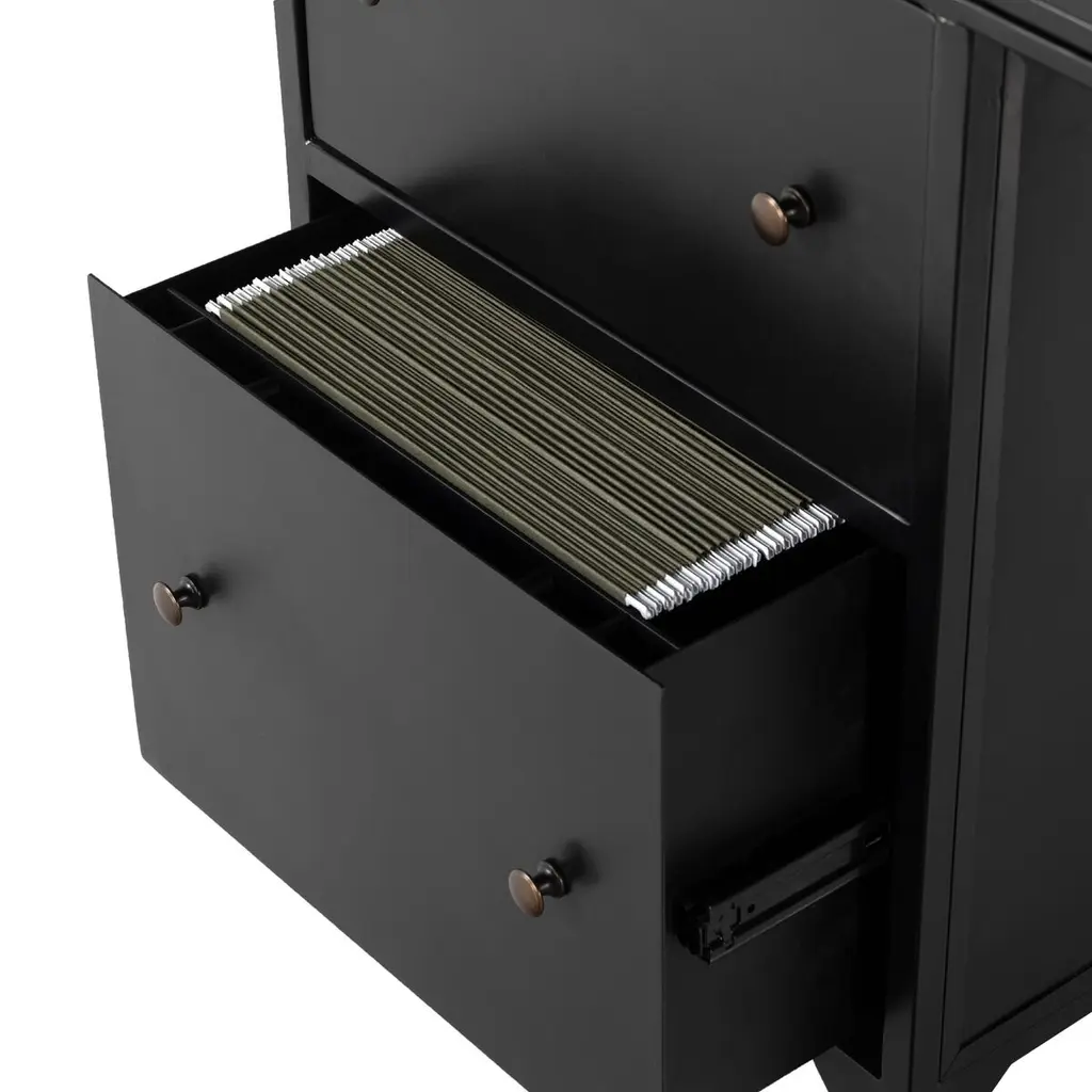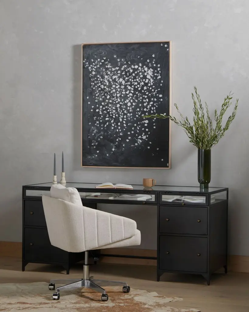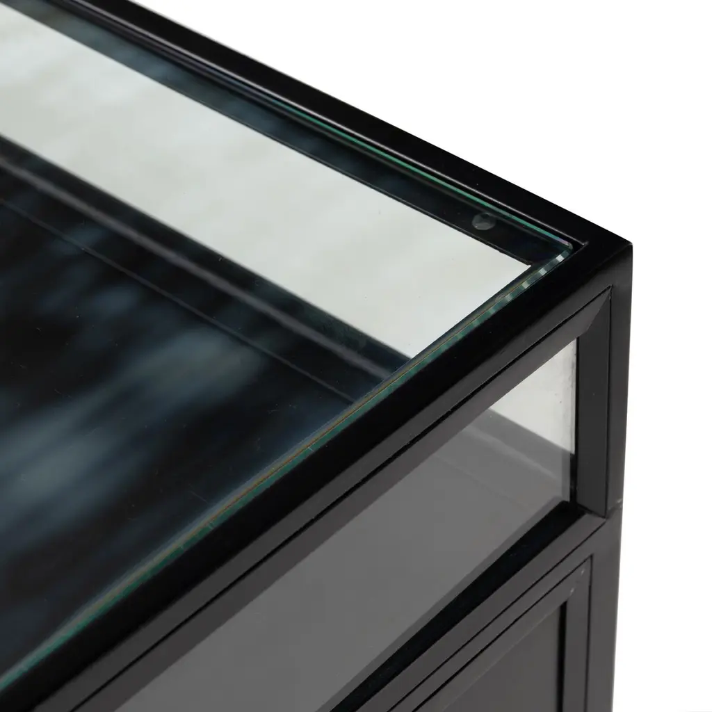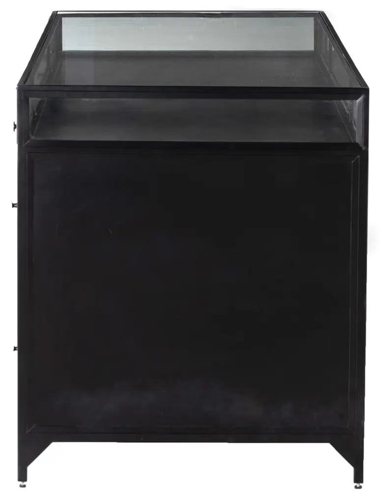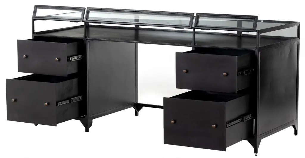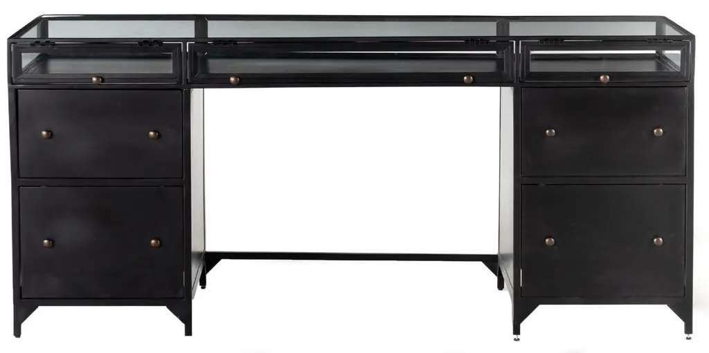 Enclosed in durable tempered glass, the three top sections of this desk serve as shadow boxes where you can keep favorite objects; the lift-up fronts enable easy access. The four drawers below provide plenty of storage. The brass finish of the pulls provides a lively contrast to the black finish of the iron.