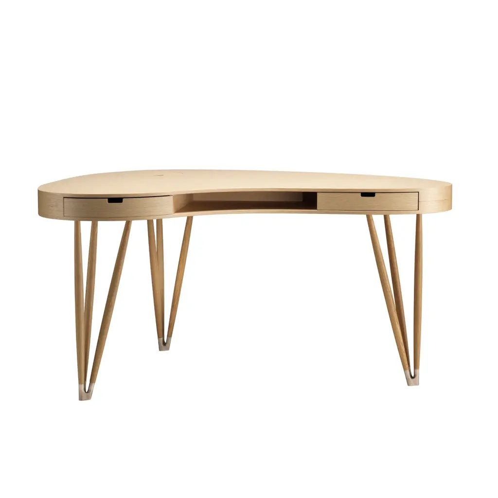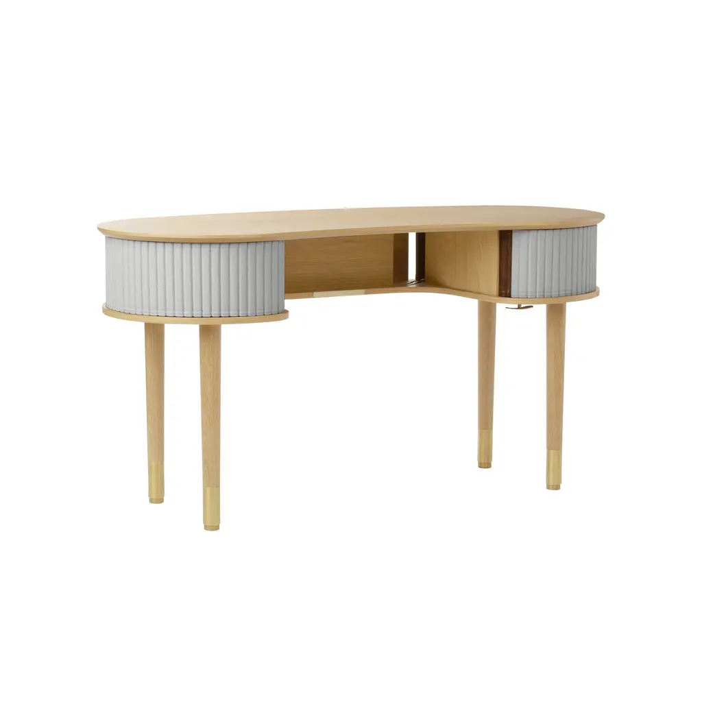 The Audacious Desk features a curved silhouette and sliding fabric tambour doors, offering a blend of style and practicality. Designed by Jonas Søndergaard, it includes a dedicated hook for headphones and built-in organizers to keep your workspace tidy. Adjustable legs ensure comfortable seating with various chairs. The tambour doors are interchangeable, allowing for easy updates to the desk's appearance.