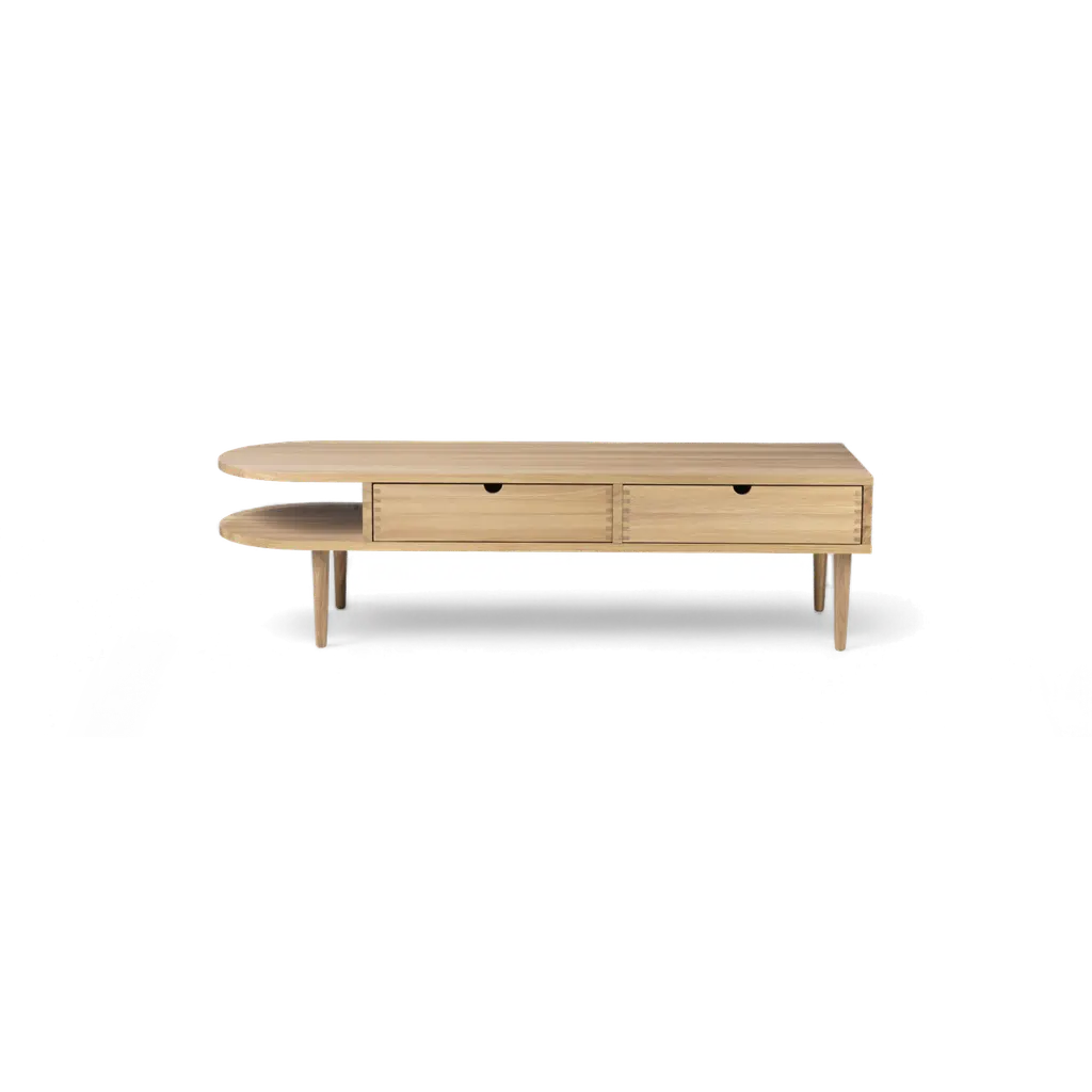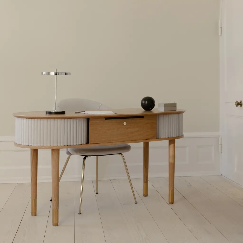 The Audacious Desk features a curved silhouette and sliding fabric tambour doors, offering a blend of style and practicality. Designed by Jonas Søndergaard, it includes a dedicated hook for headphones and built-in organizers to keep your workspace tidy. Adjustable legs ensure comfortable seating with various chairs. The tambour doors are interchangeable, allowing for easy updates to the desk's appearance.