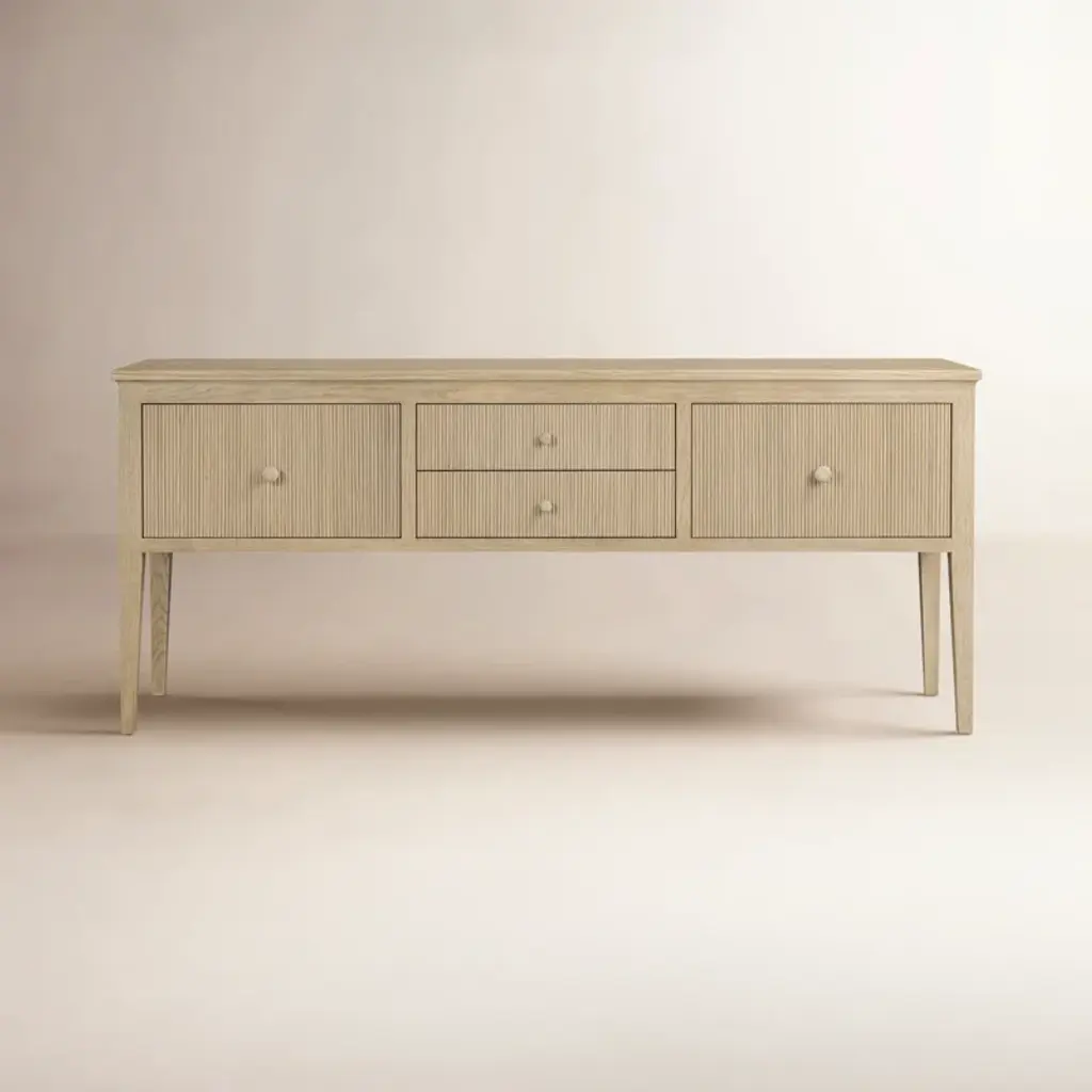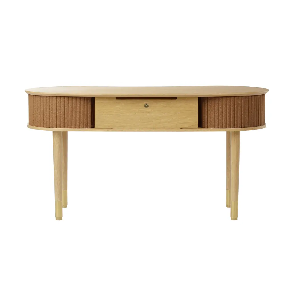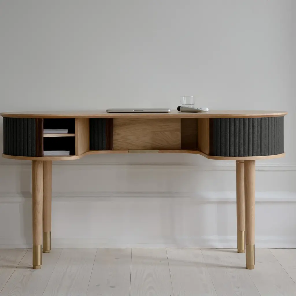 The Audacious Desk features a curved silhouette and sliding fabric tambour doors, offering a blend of style and practicality. Designed by Jonas Søndergaard, it includes a dedicated hook for headphones and built-in organizers to keep your workspace tidy. Adjustable legs ensure comfortable seating with various chairs. The tambour doors are interchangeable, allowing for easy updates to the desk's appearance.