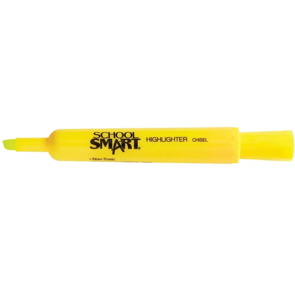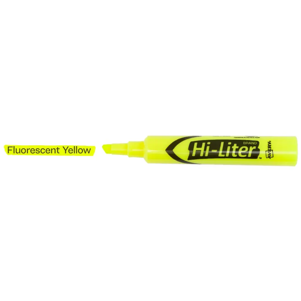 Bring attention to essential words and phrases with Avery Hi-Liter Desk-Style Highlighters. The molded chisel tip of these highlighters gives you the precision to highlight or underline text in a vibrant-colored yellow ink. Keep your documents in pristine condition with a smear-safe highlighter ink that doesn't bleed through most paper and won't smudge pen, marker or inkjet inks. Built to last, these highlighters have a resilient tip that won't fray and a comfortable faceted barrel with a long-lasting ink supply. The improved ink formula ensures that highlighters can be left uncapped for up to one week without drying out. Don't worry about getting highlighter ink onto your hands; the water-based ink is easy to wash from skin and is ACMI-certified nontoxic, making these Avery highlighters safe for kids and classroom use. Package includes 12 Yellow highlighters.