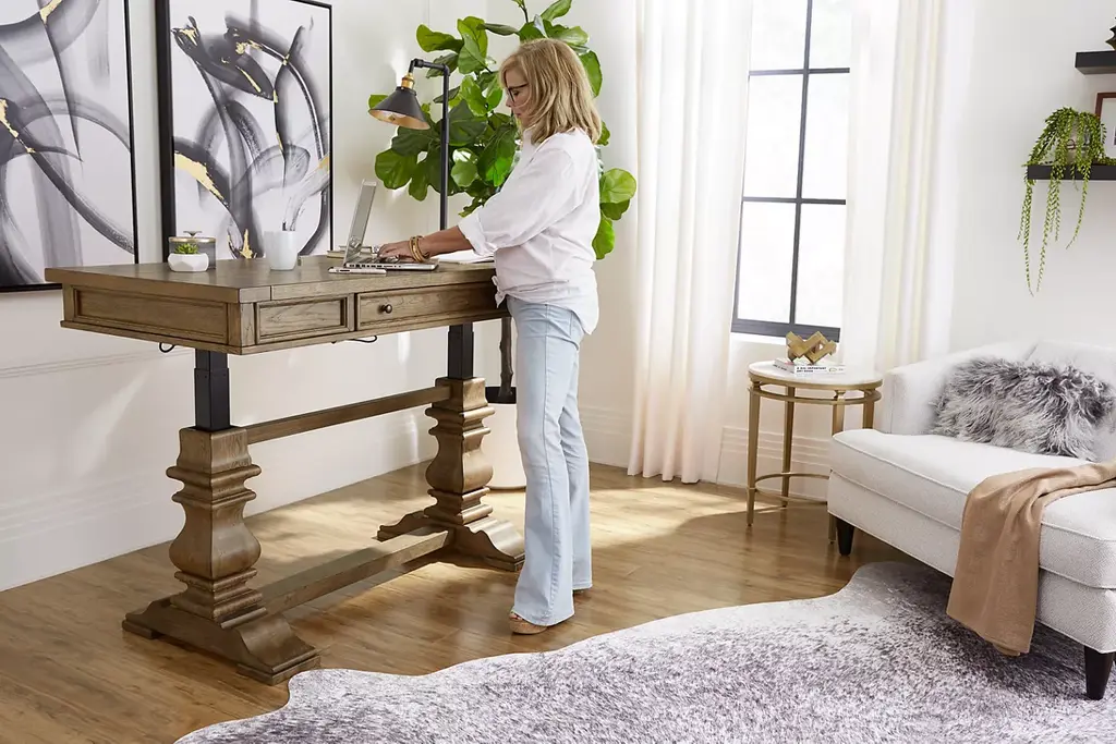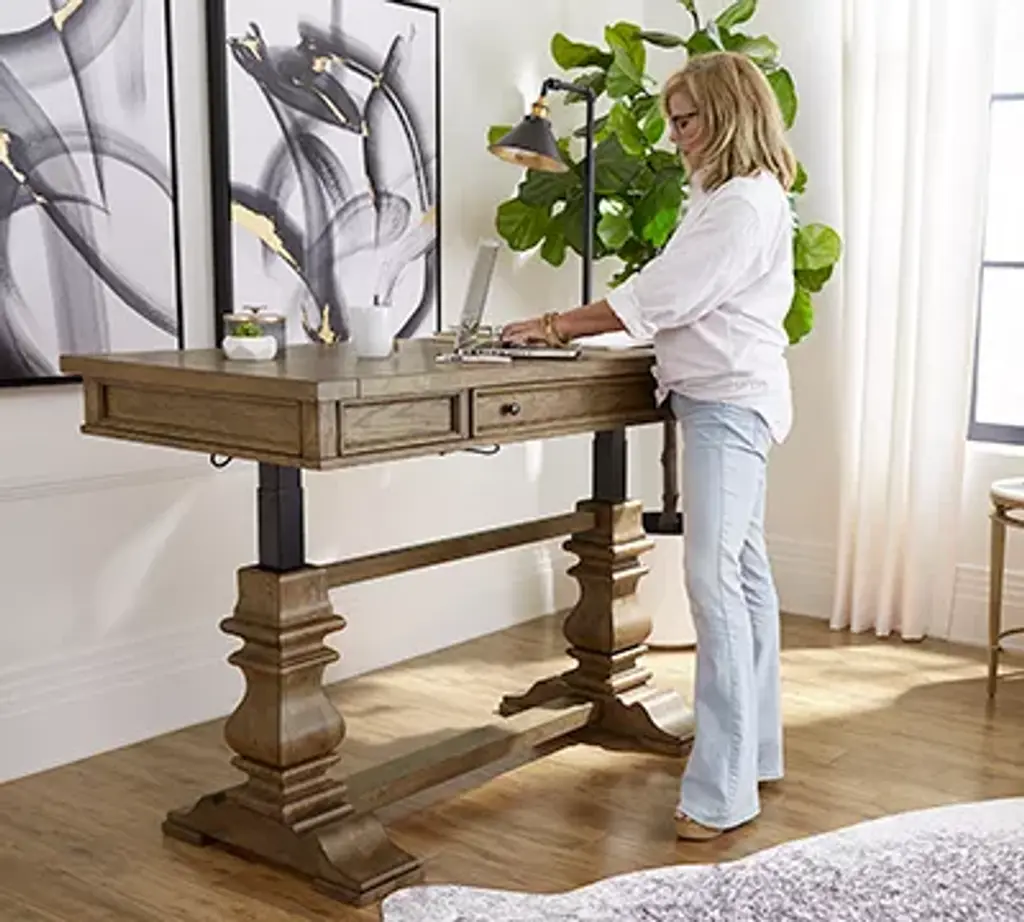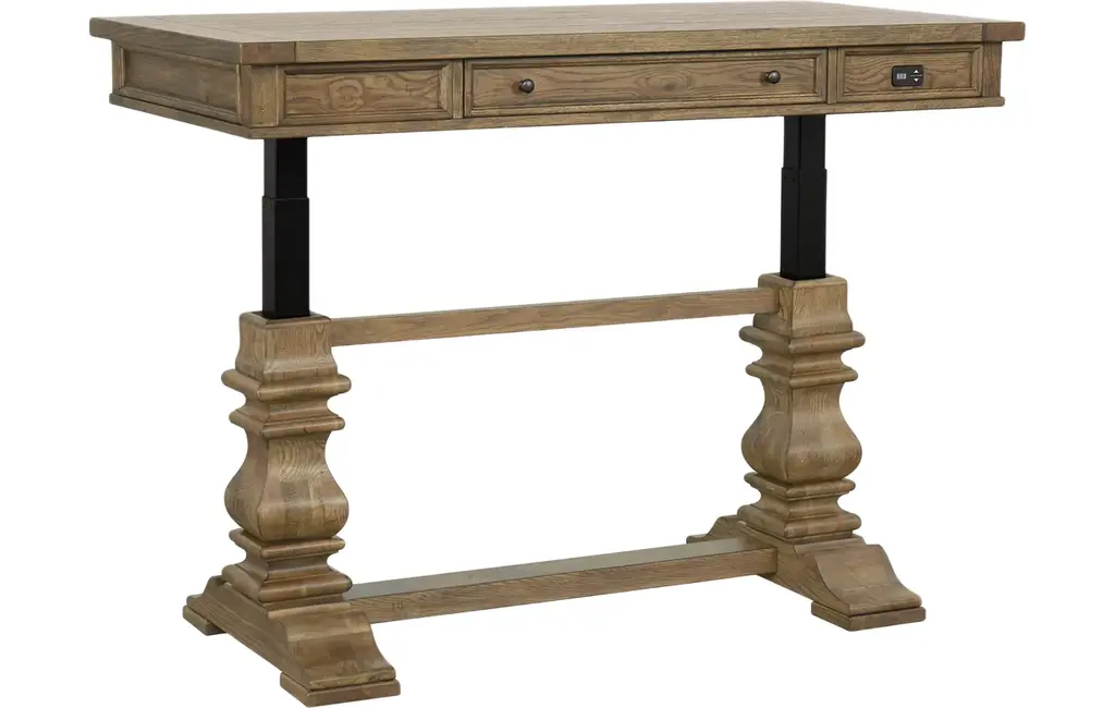 Our Avondale standing desk brings understated charm and professional practicality to any home office with a hand-distressed, vintage oak finish that maintains the elegant sheen of untreated wood. The glint of antique bronze hardware adorns this piece's single drawer, and a powered lift top allows you to adjust the height of the desk from 31 to 53 inches to accommodate standing, sitting and working productively from only the most comfortable angles.