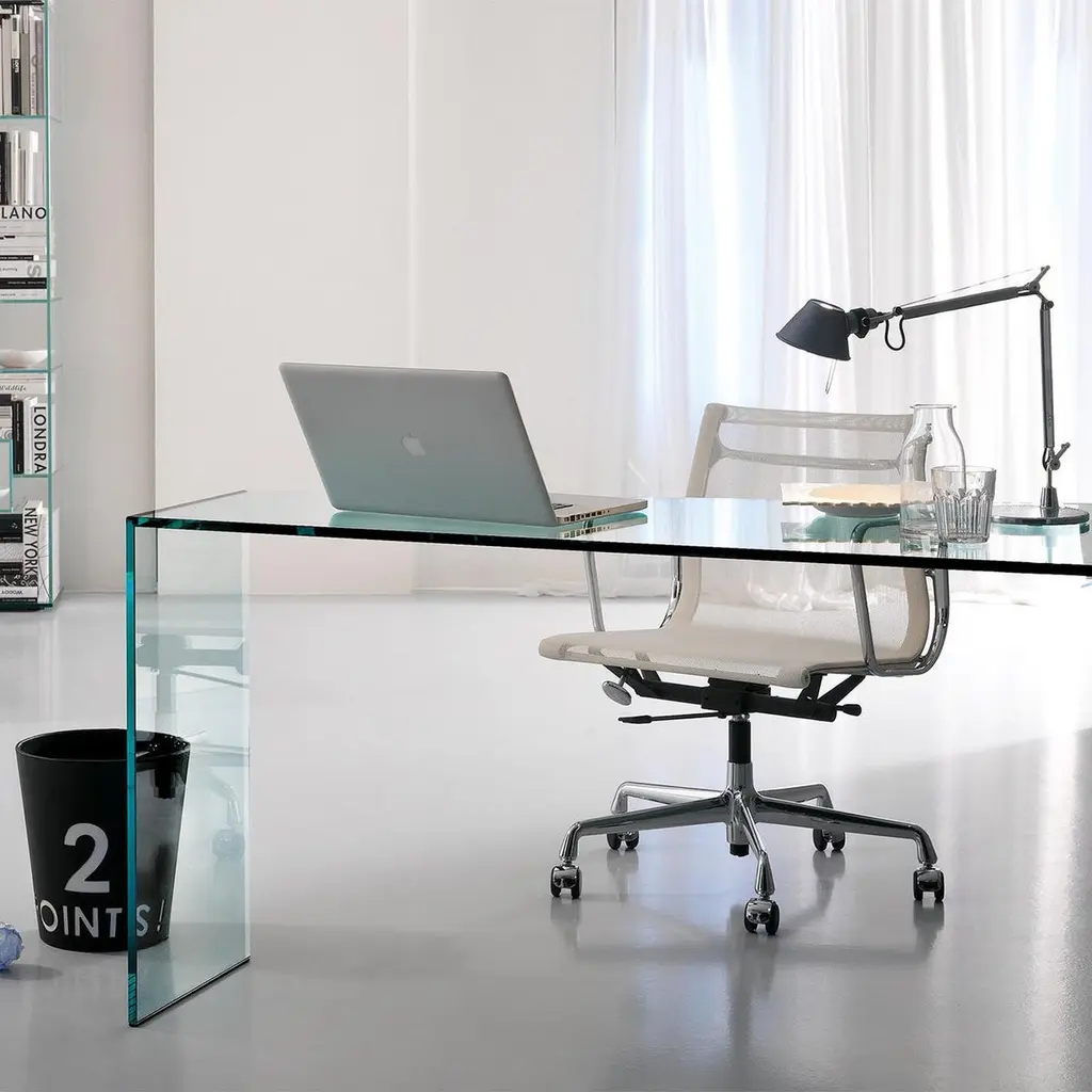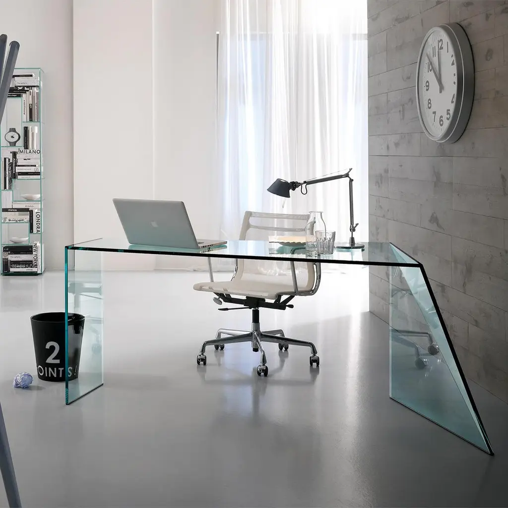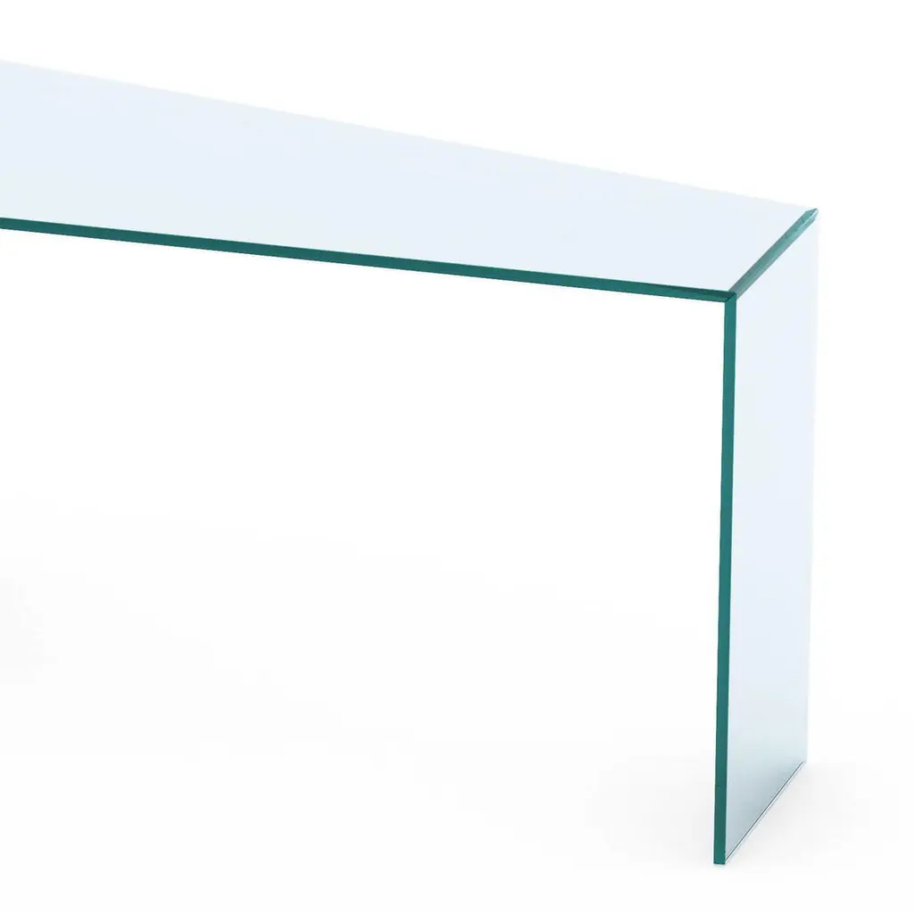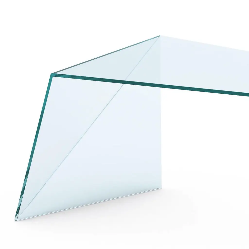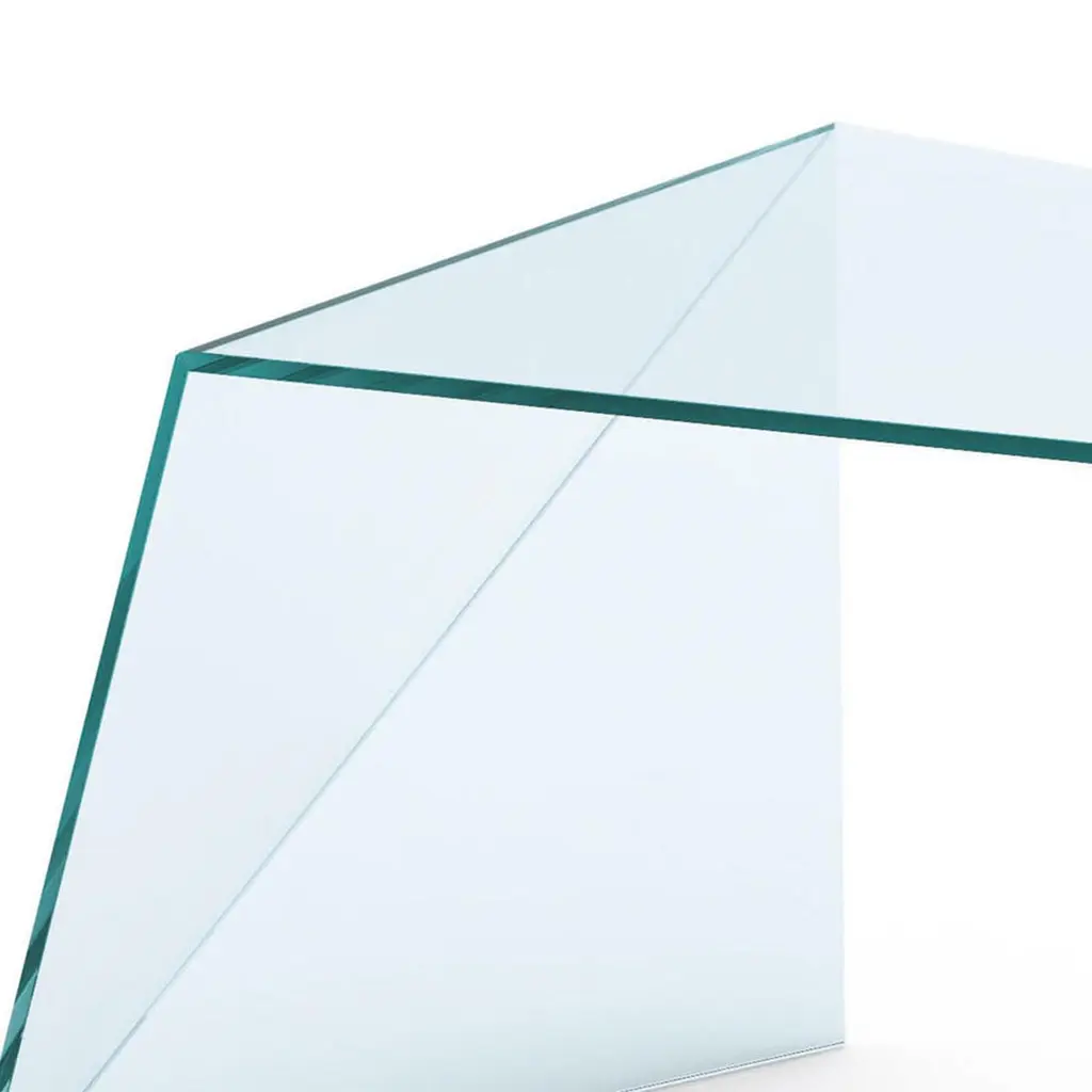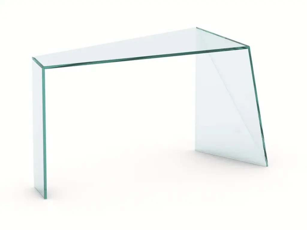 Desk Axis all in clear glass with asymetrical.shape. 15mm thickness glass with oblique welding on sides.Also available in Axis Console Table, on request.